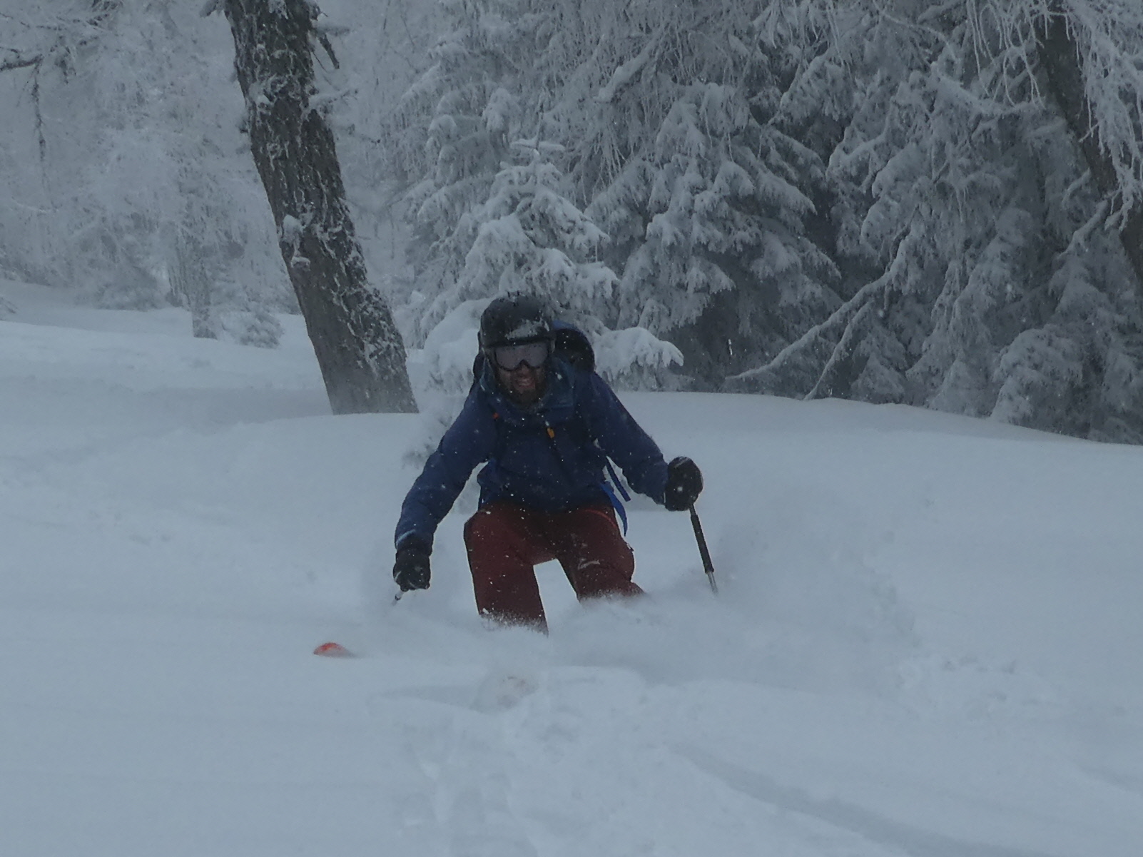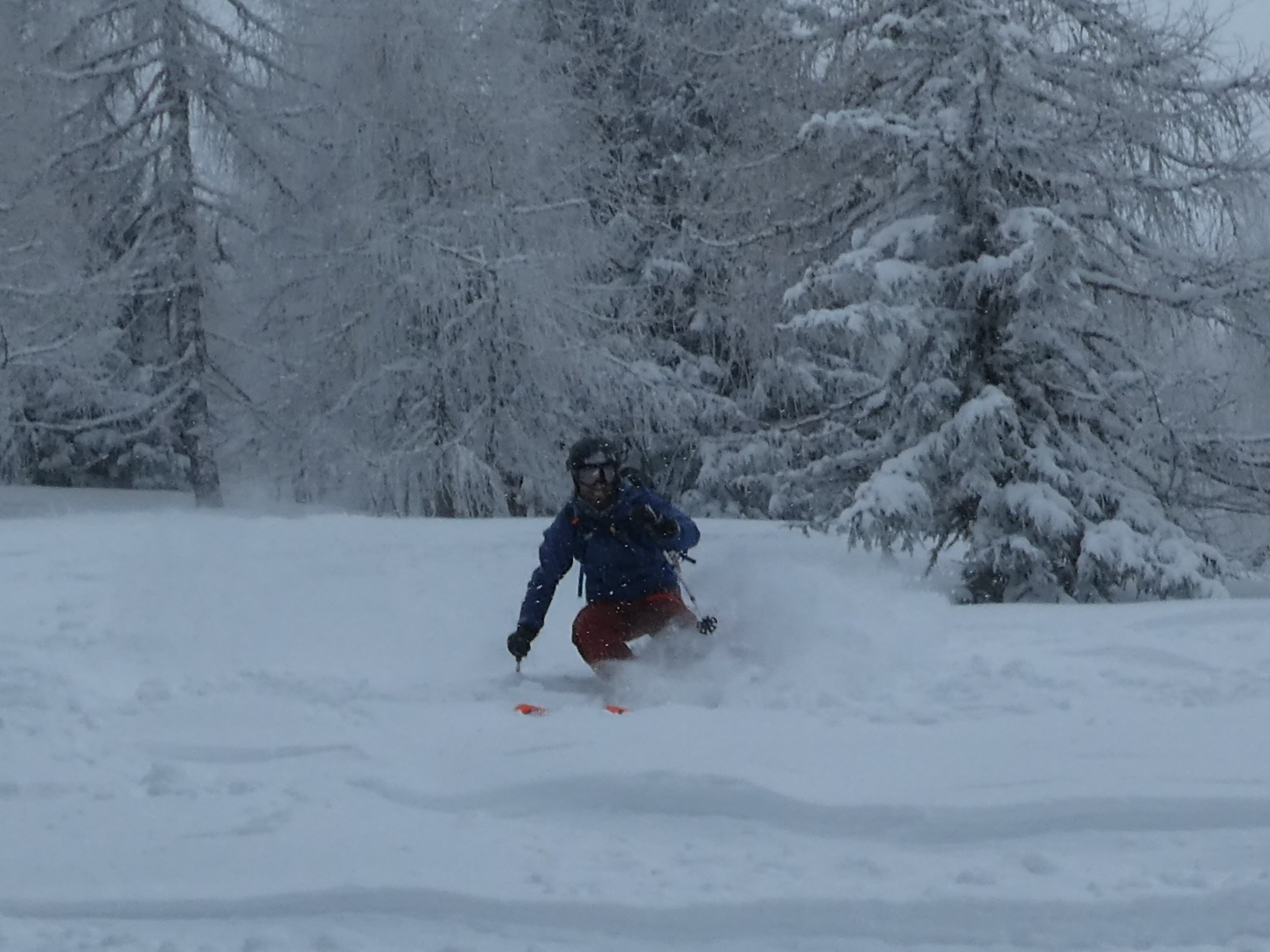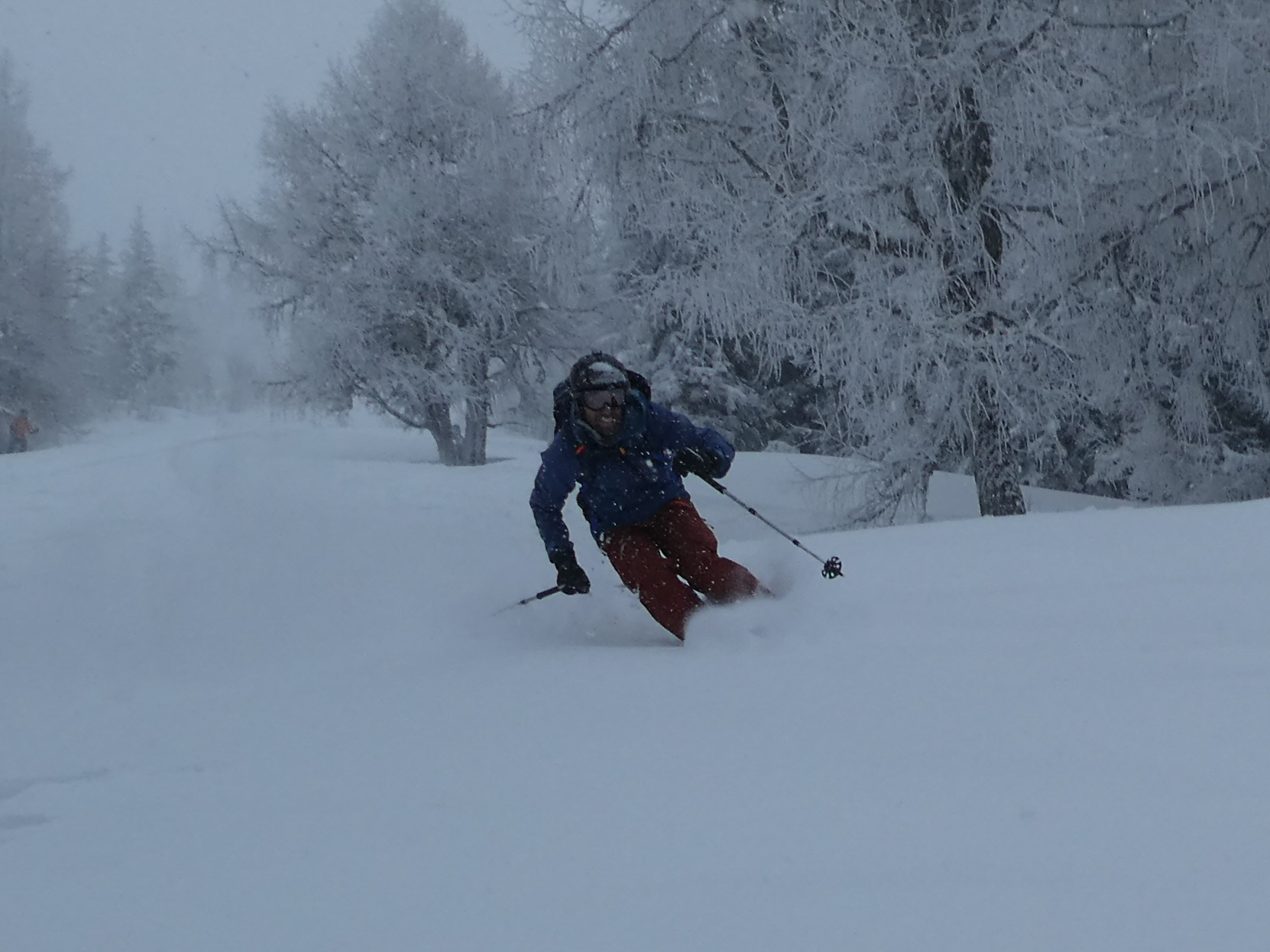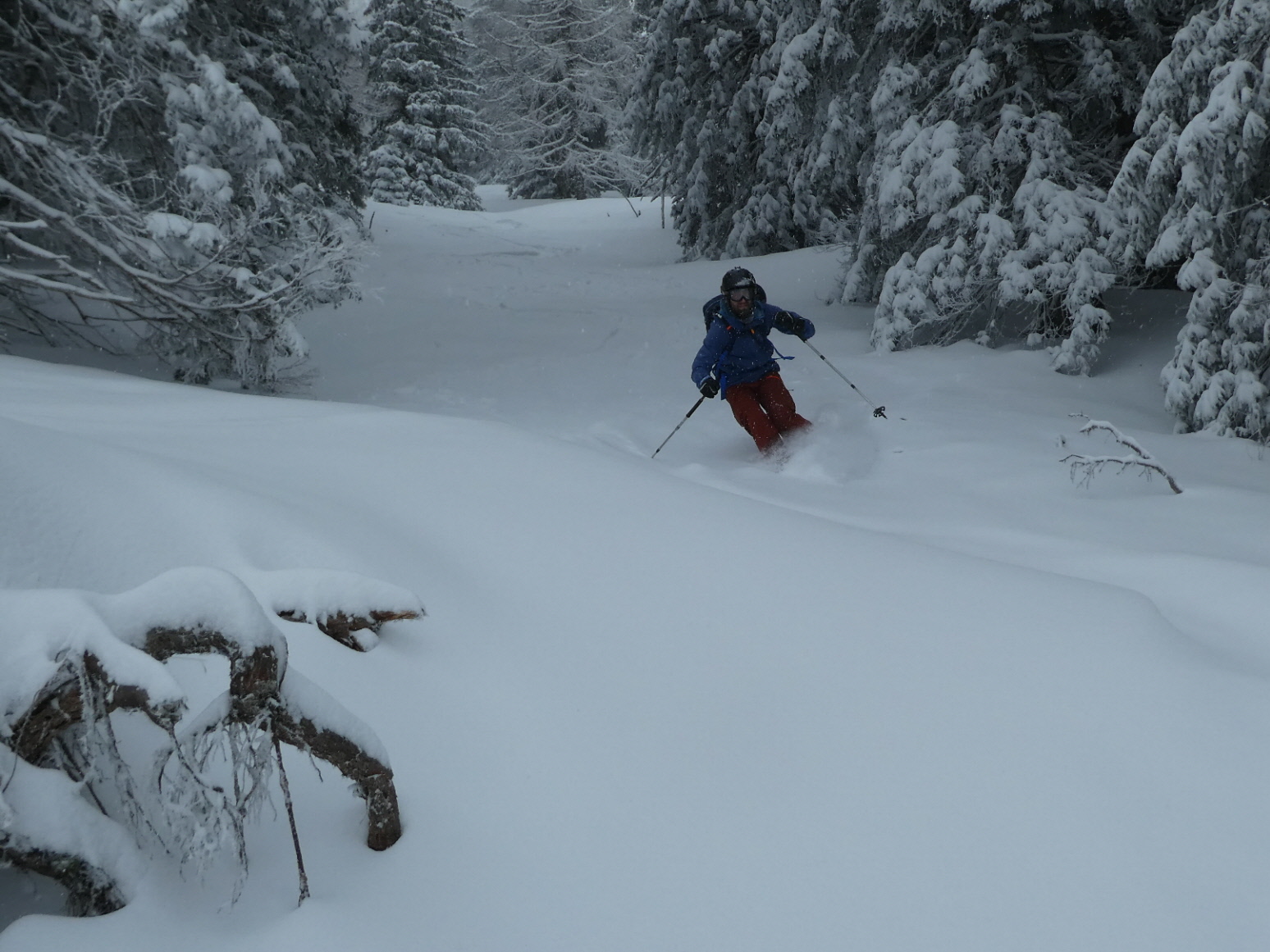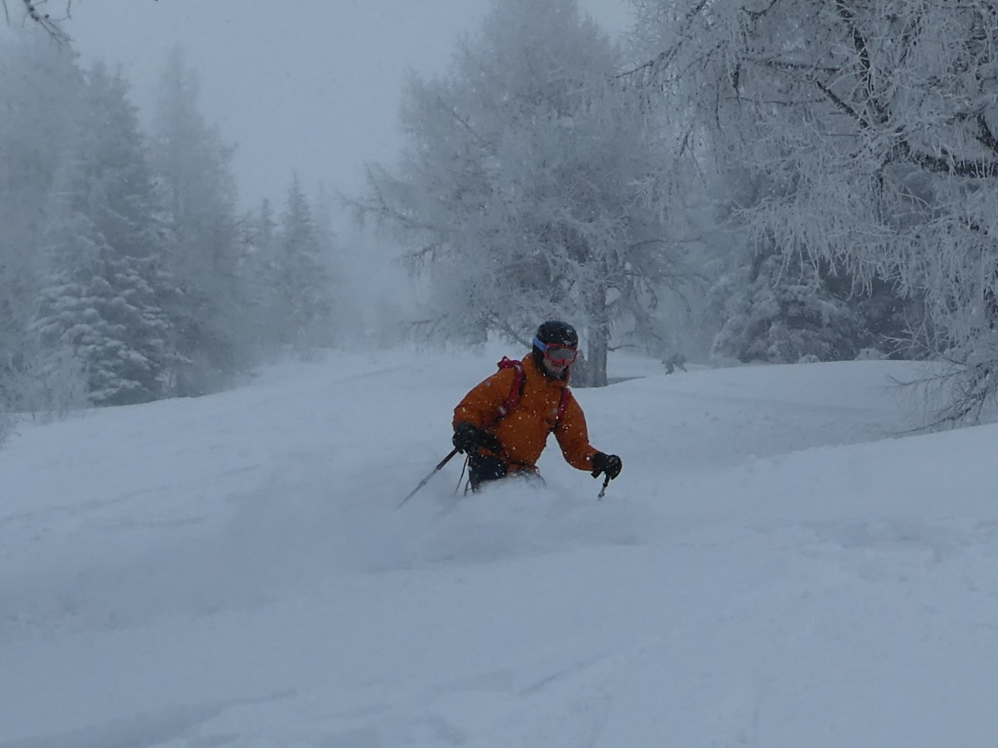 Ein letztes Mal haben wir jetzt umgerüstet und uns für die finale Abfahrt fertig gemacht. Im zentralen Bereich der Plan haben wir zwischen wenigen dort schon vorhandenen Abfahrtsspuren immer noch genug Platz für eine genussvolle Tiefschneeabfahrt gefunden. Jetzt sind wir aber von der Hochalm weiter ins Tal abgefahren. Sowohl im Waldstück unterhalb der Alm als auch in der Steilstufe nach dem flachen Wegstück war der Neuschnee längst rausgeputzt und das Abfahren auf dem harten Untergrund weniger lustig.