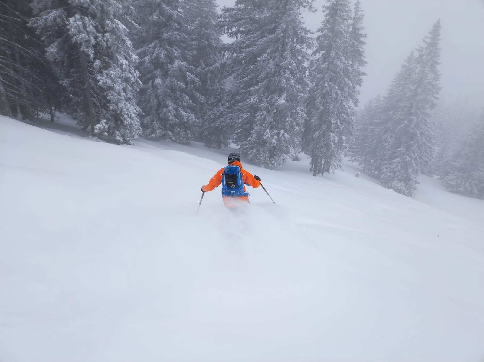 Unerwartet windstill war es nicht nur auf der Alm, sondern auch beim weiteren Anstieg hinauf entlang der Schwarzensteinplan. Nach einer Aufstiegszeit von 1 Std 37 min waren wir zum ersten Mal am angepeilten Umkehrpunkt, Pepis Wohnzimmer. Kurz haben wir uns gestärkt, die Ausrüstung in den Abfahrtsmodus getrimmt und alle Luken dicht gemacht.