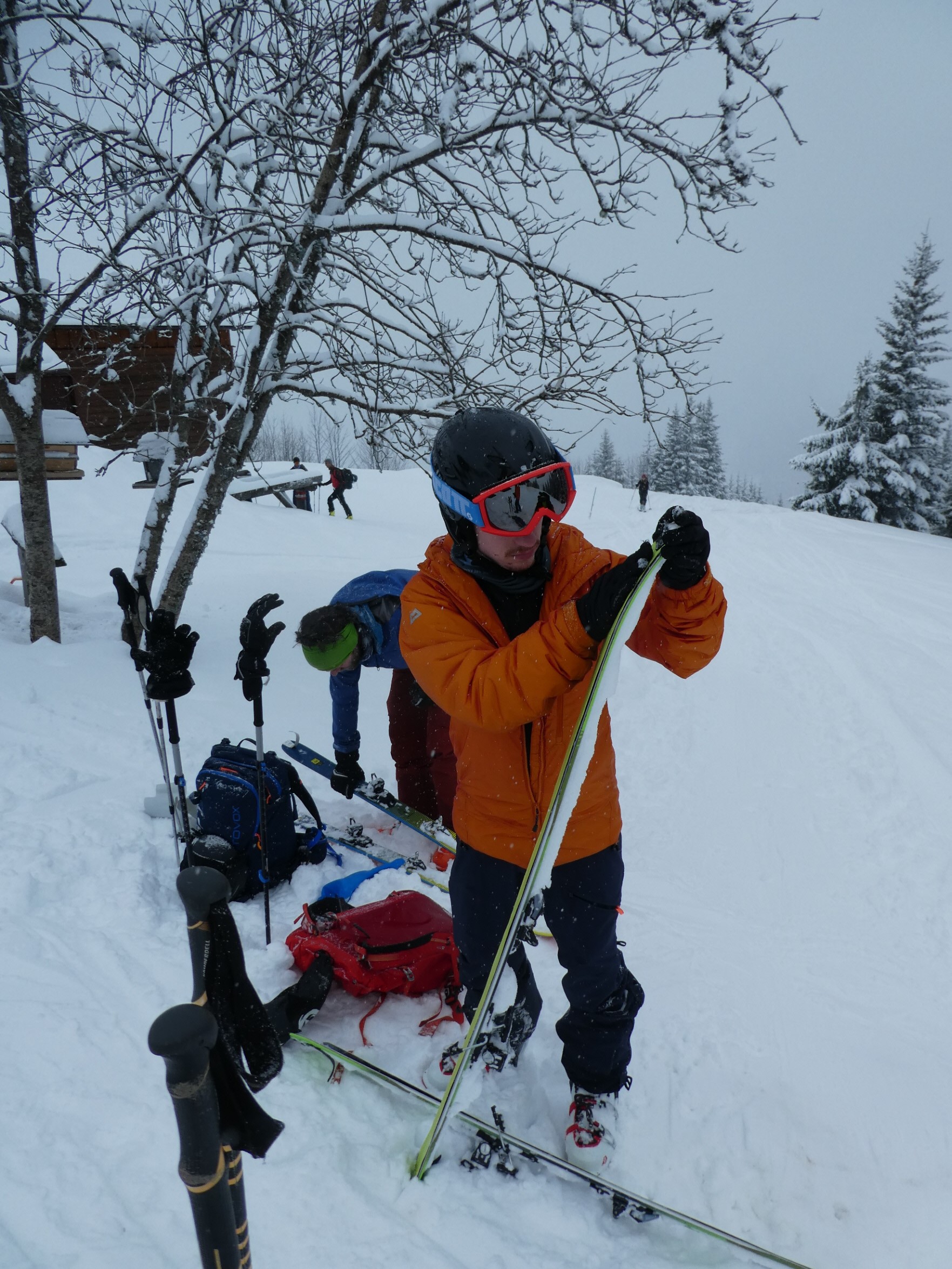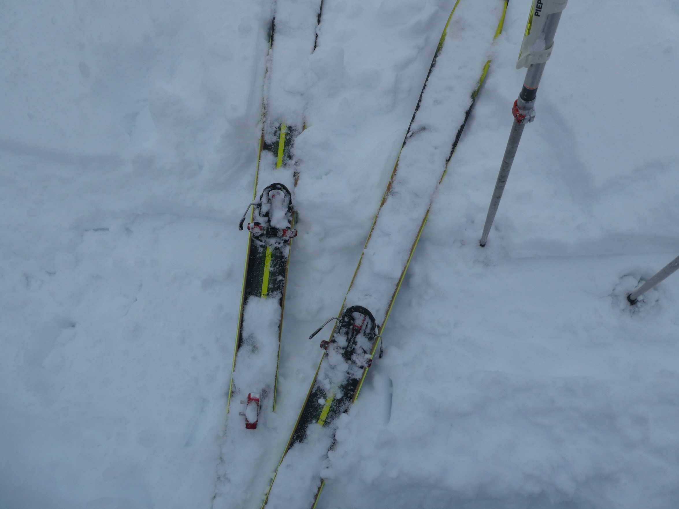 Unten wurden die Felle wieder aufgezogen, und in der mittlerweile von den nach uns Aufsteigenden festgetretenen Spur ging es in einer halben Stunde wieder hinauf. Oben haben wir den Umrüstvorgang für die Abfahrt wiederholt, uns kurz gestärkt und uns für die zweite Abfahrt eine noch unverspurte Schneise gesucht.