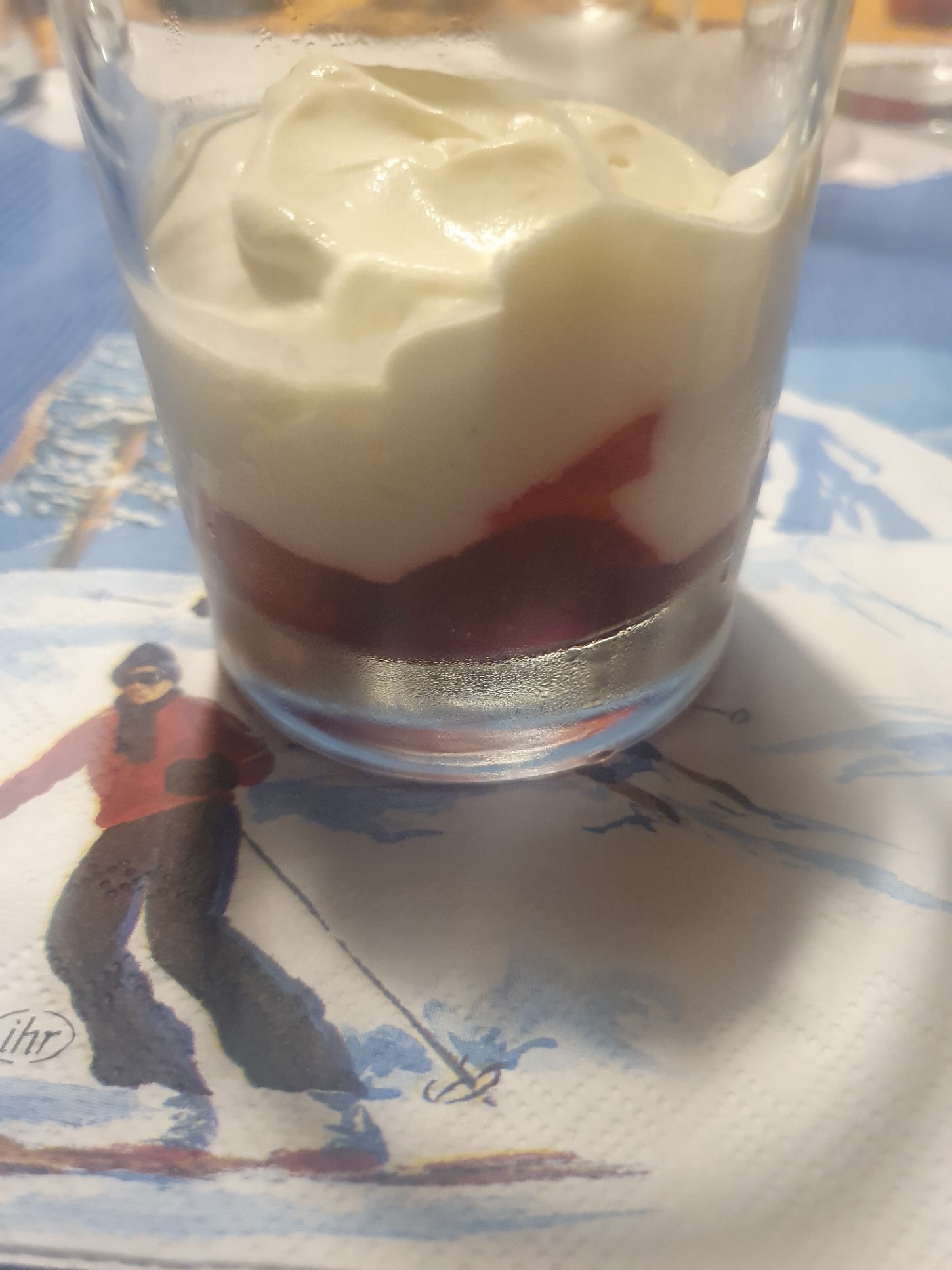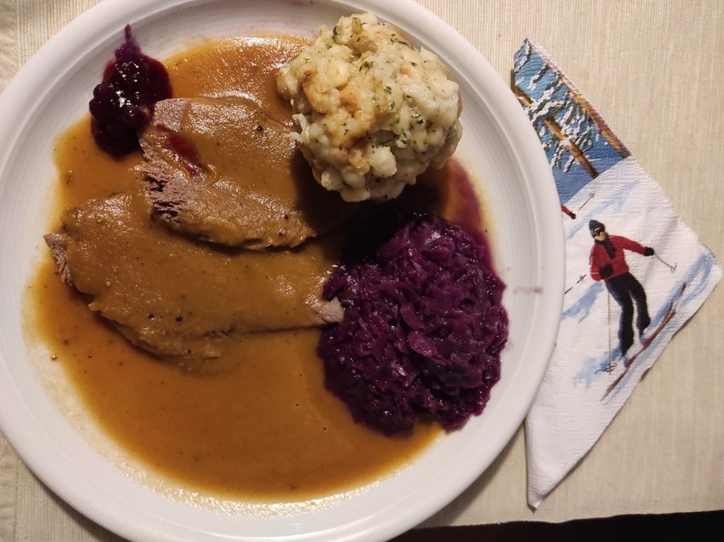 Chris hat uns aus der Kantine mit Bier und Brezen versorgt. Dass das keine adäquate Ernährung für nach der Skitour, sondern nur ein Essen für den hohlen Zahn ist, wird sich jetzt der Heinrich denken. Da hat er vollkommen recht, braucht aber nicht traurig sein, denn wir sind nach unserer Heimkehr am heimischen Esstisch noch fürstlich versorgt worden. Nach der Grießnockerlsuppe mit Gemüseeinlage gab es eine köstliche Rehstelze mit Semmelknödel und Rotkraut. Und das Ganze wurde schließlich mit einer Vanillecreme mit Himbeeren abgerundet.