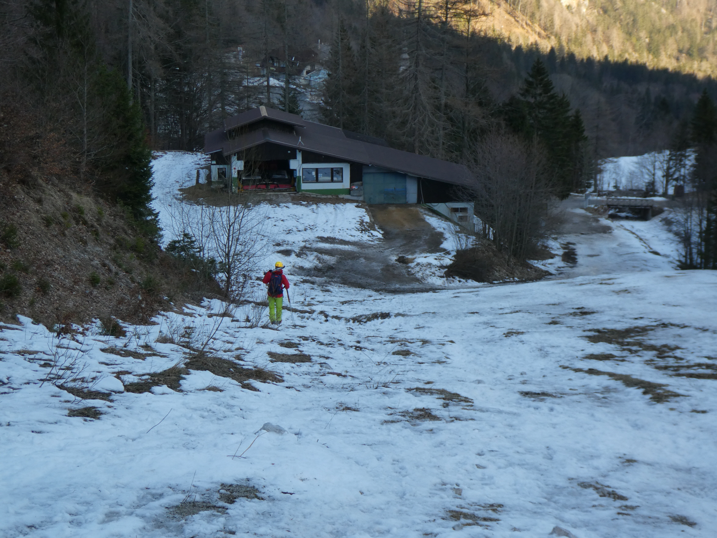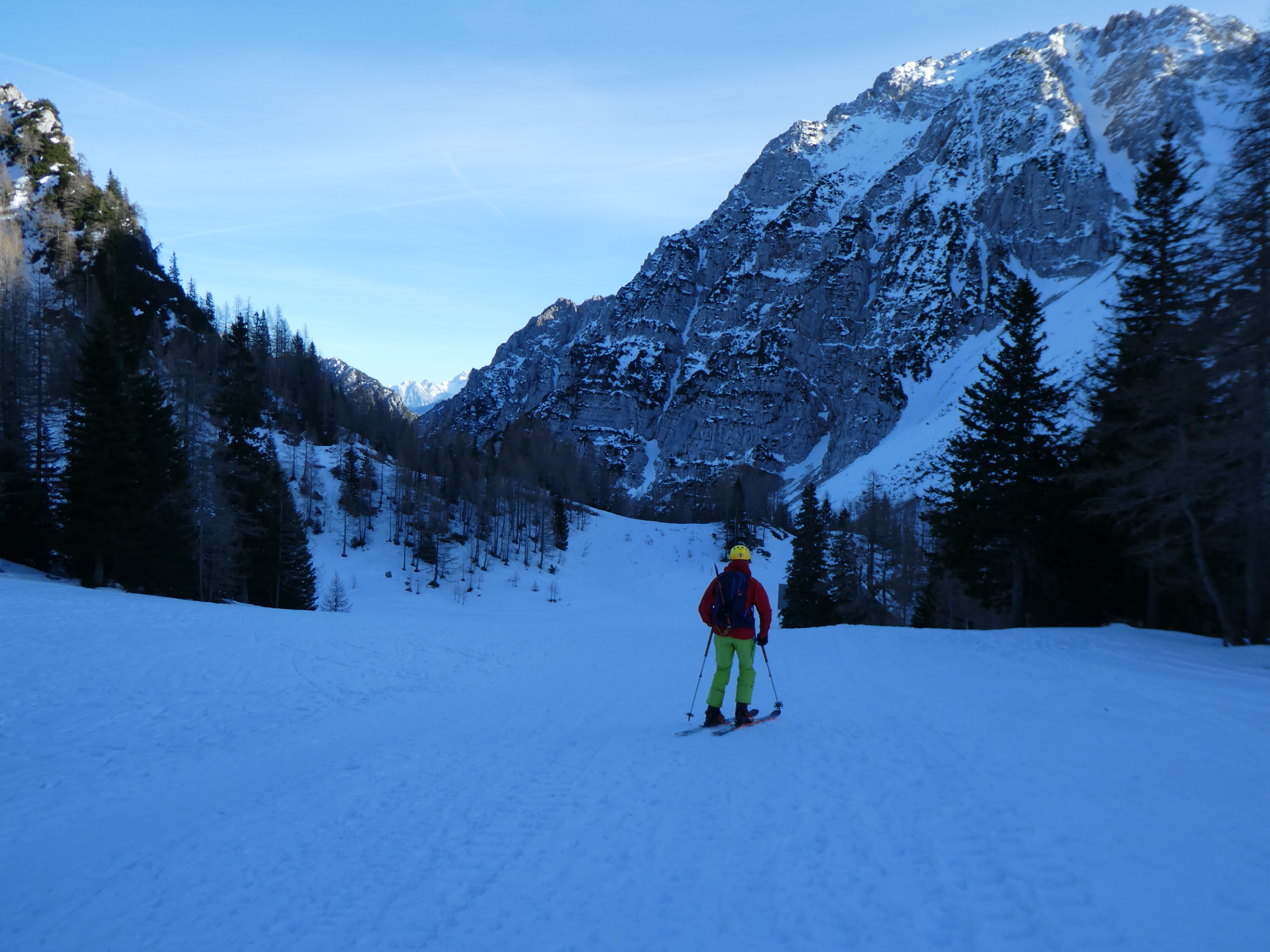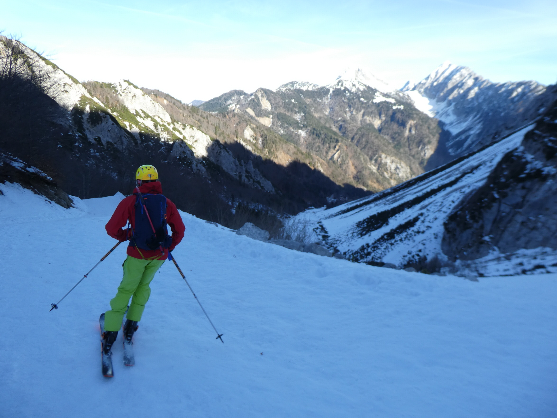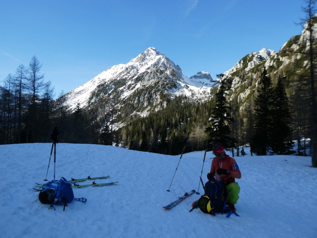Jetzt haben die Felle endgültig ihren Dienst an diesem Tourentag beendet. Die Ausrüstung wurde wieder in den Abfahrtsmodus getrimmt und vorbei an der Hütte ging es auf der – im Schatten der Begunjscica – sehr eisigen Piste flott abwärts. Bis knapp über dem Ausgangspunkt ist es uns gelungen, allen verborgenen Steinen auszuweichen oder einmal schnell einen Ski zu heben um den „Feindkontakt“ zu vermeiden. Am allerletzten Hang haben wir dann zur Schonung unserer Abfahrtsgeräte abgeschnallt und wenige Minuten später die Tour am Parkplatz beendet.