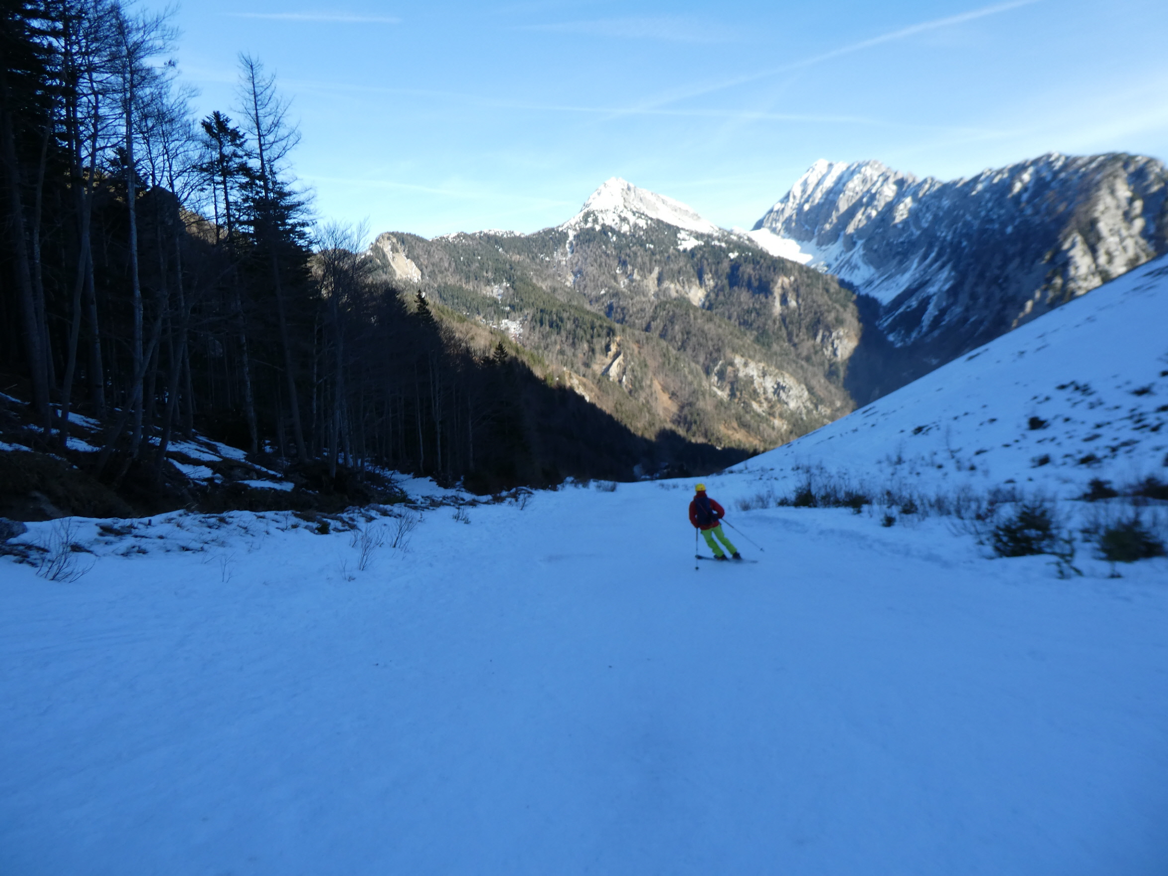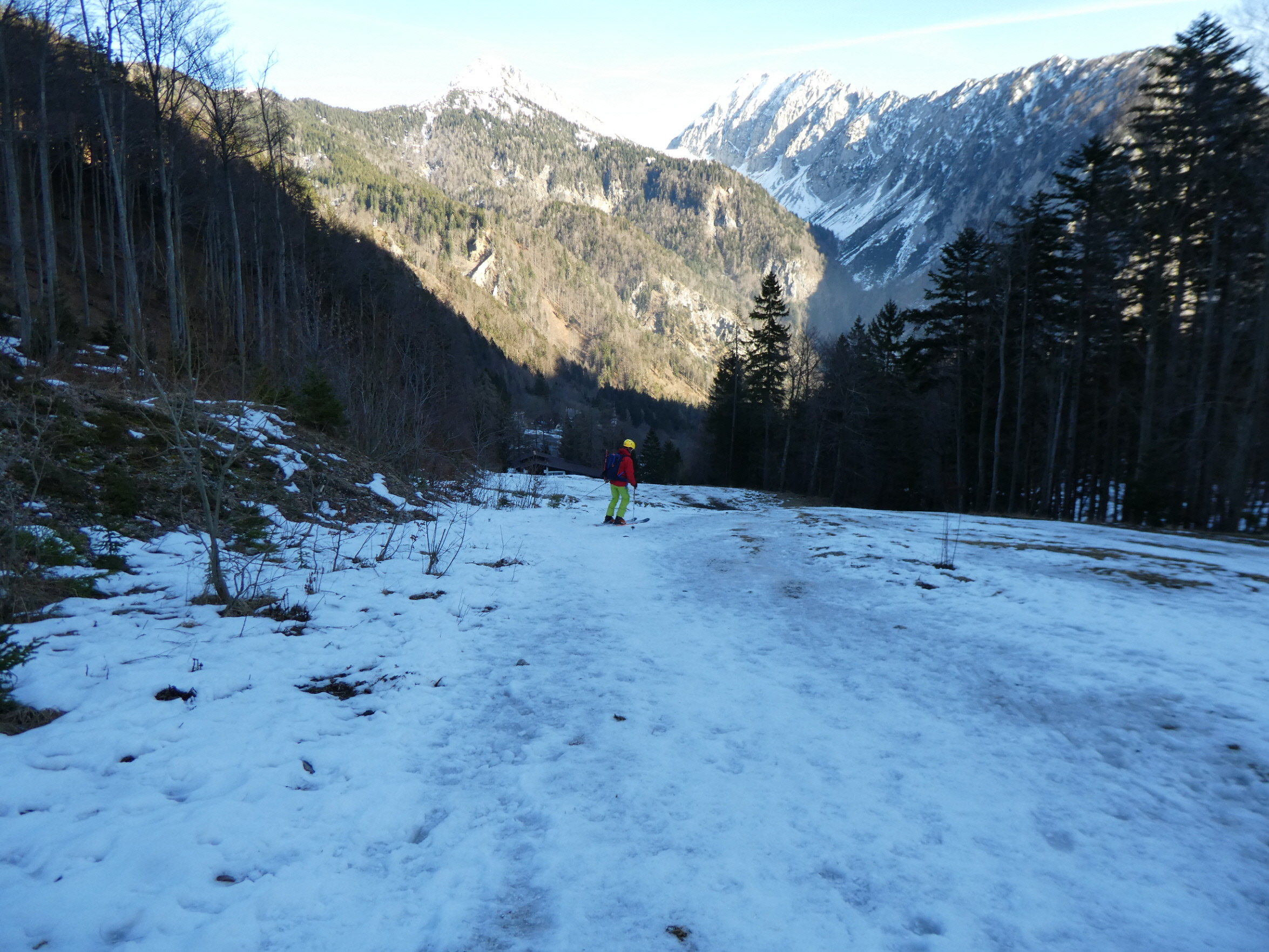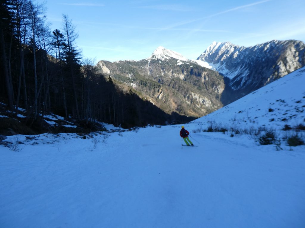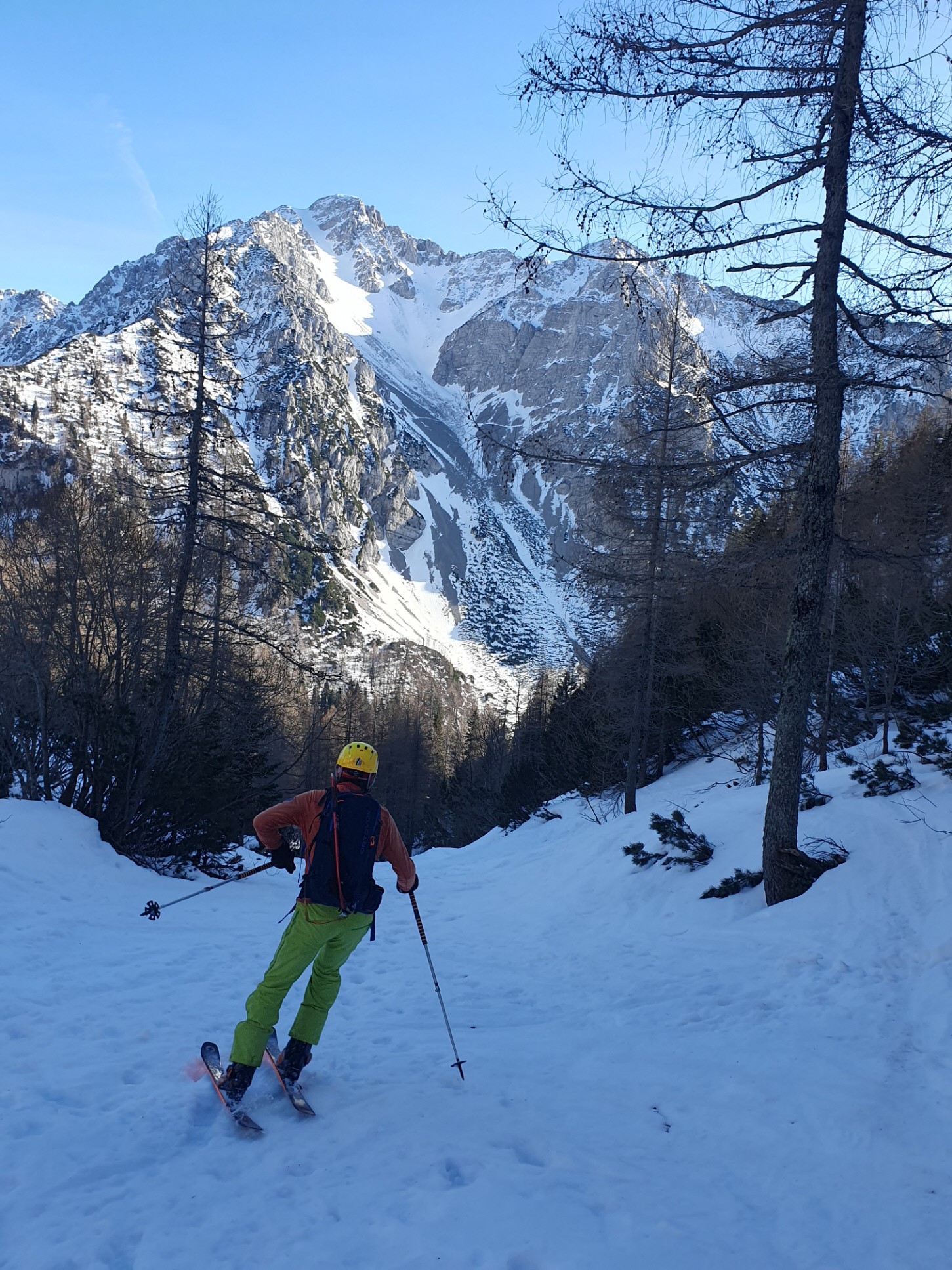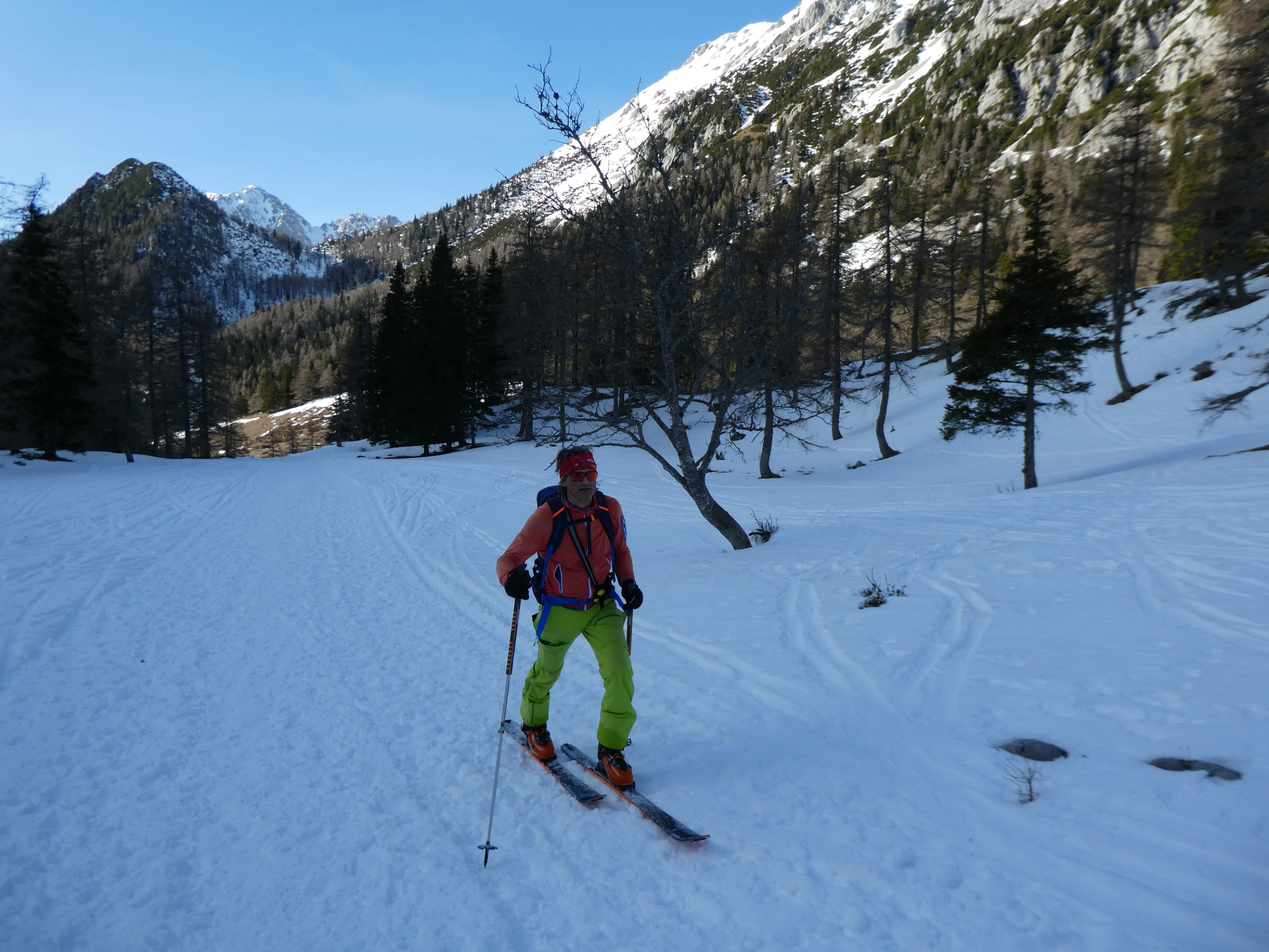 Jetzt haben die Felle endgültig ihren Dienst an diesem Tourentag beendet. Die Ausrüstung wurde wieder in den Abfahrtsmodus getrimmt und vorbei an der Hütte ging es auf der – im Schatten der Begunjscica – sehr eisigen Piste flott abwärts. Bis knapp über dem Ausgangspunkt ist es uns gelungen, allen verborgenen Steinen auszuweichen oder einmal schnell einen Ski zu heben um den „Feindkontakt“ zu vermeiden. Am allerletzten Hang haben wir dann zur Schonung unserer Abfahrtsgeräte abgeschnallt und wenige Minuten später die Tour am Parkplatz beendet.