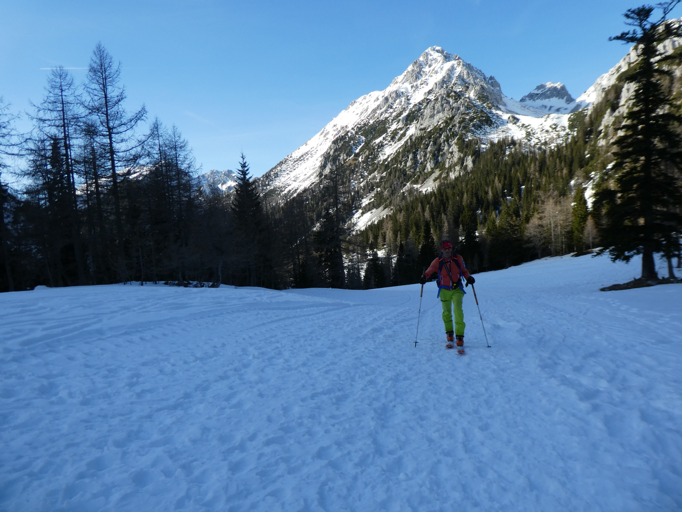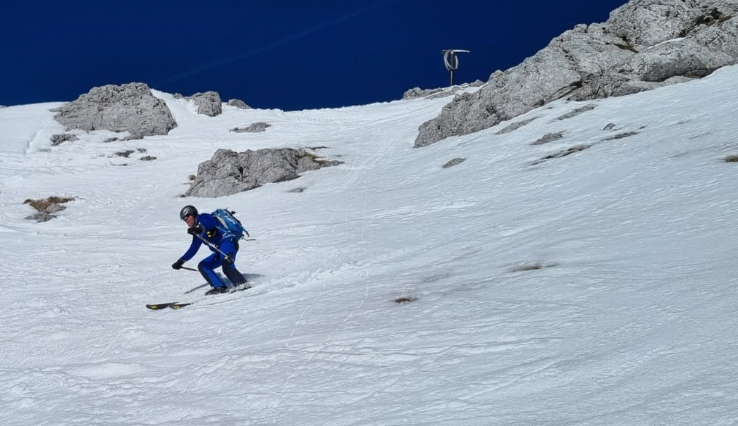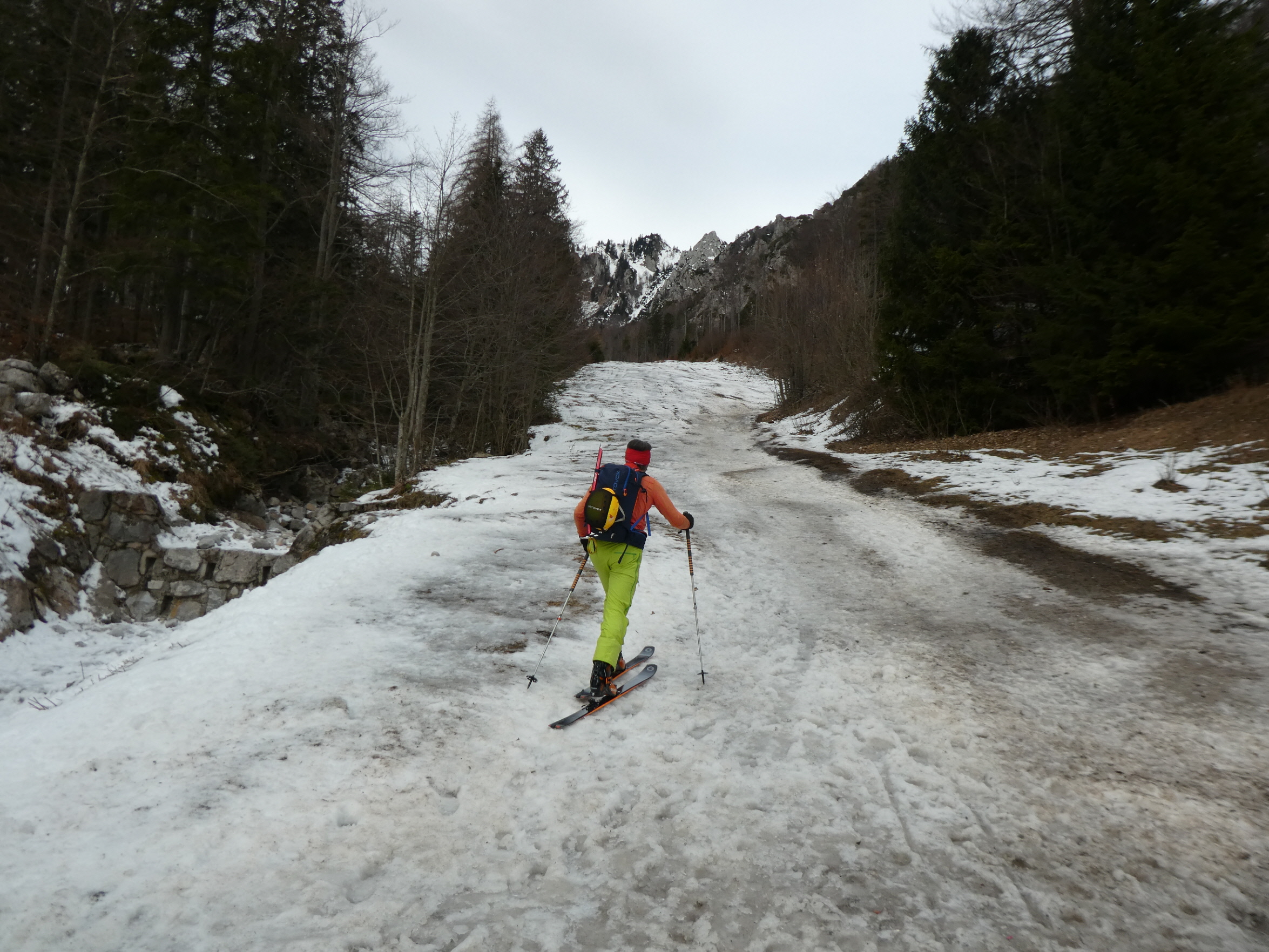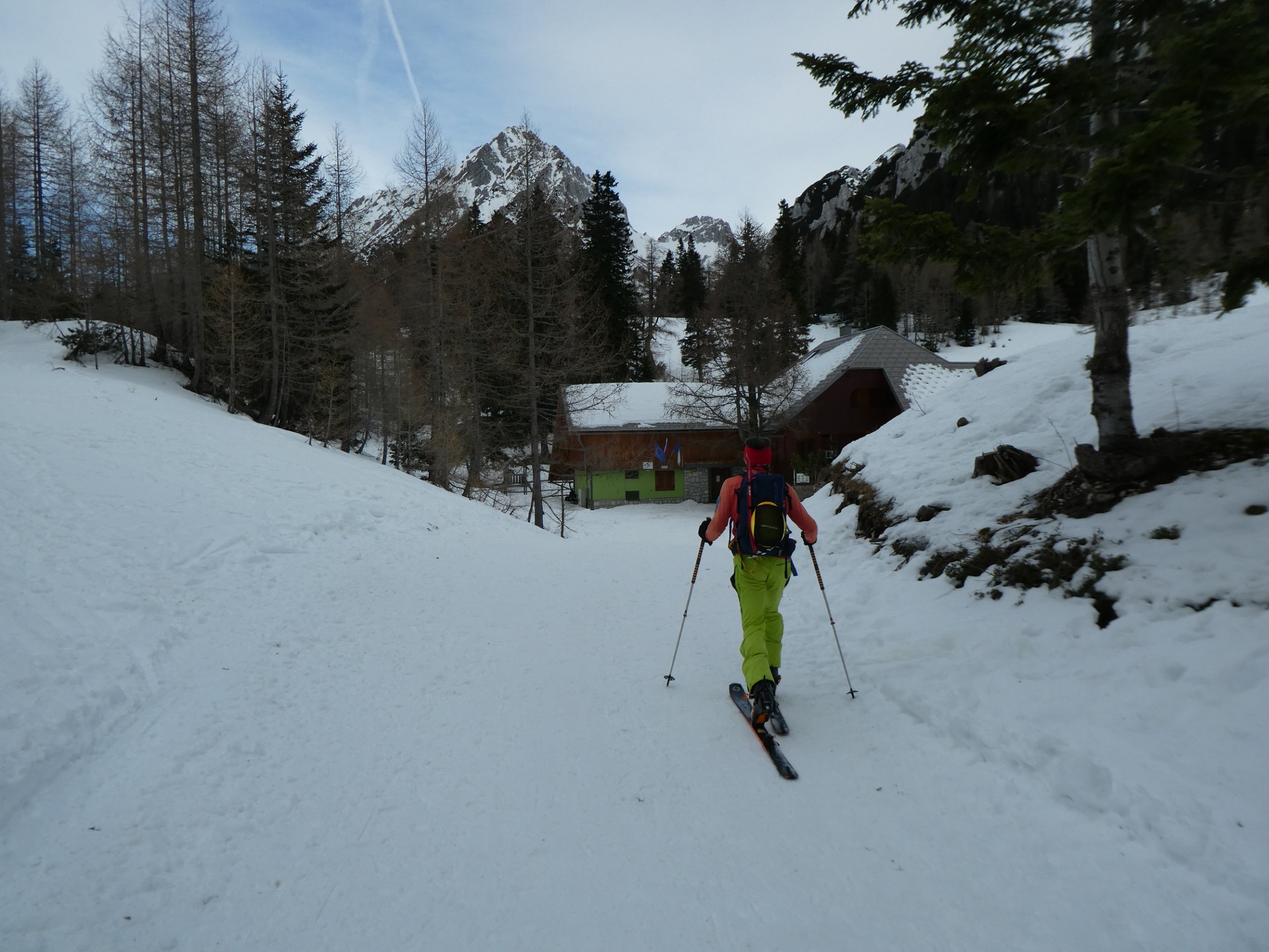 Jetzt haben die Felle endgültig ihren Dienst an diesem Tourentag beendet. Die Ausrüstung wurde wieder in den Abfahrtsmodus getrimmt und vorbei an der Hütte ging es auf der – im Schatten der Begunjscica – sehr eisigen Piste flott abwärts. Bis knapp über dem Ausgangspunkt ist es uns gelungen, allen verborgenen Steinen auszuweichen oder einmal schnell einen Ski zu heben um den „Feindkontakt“ zu vermeiden. Am allerletzten Hang haben wir dann zur Schonung unserer Abfahrtsgeräte abgeschnallt und wenige Minuten später die Tour am Parkplatz beendet.
