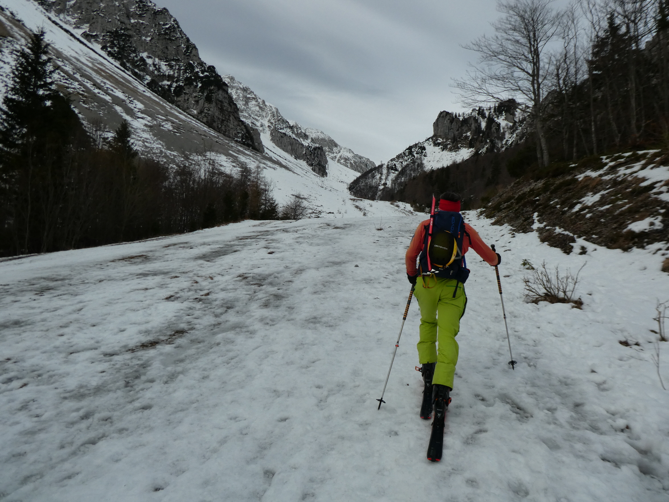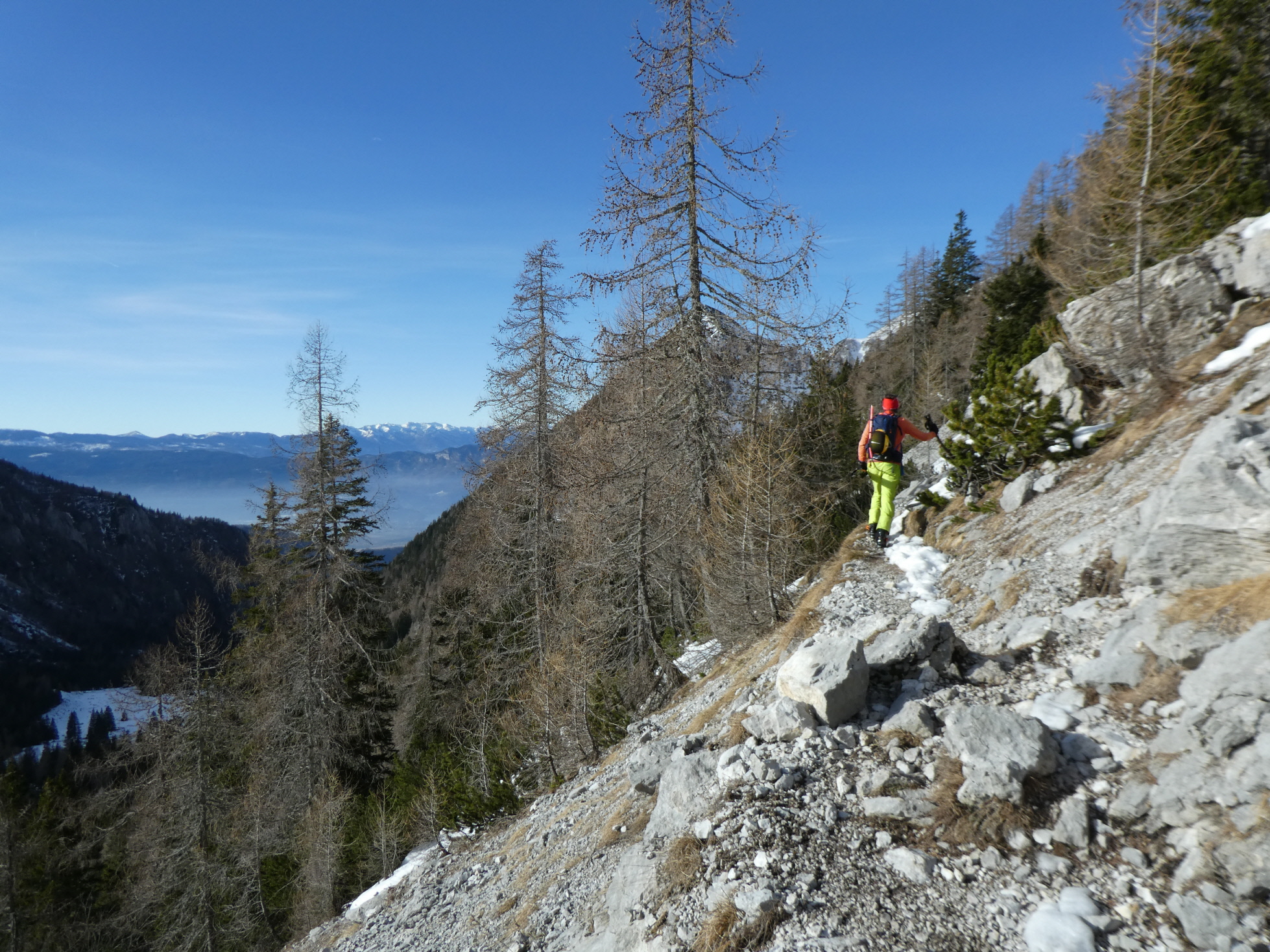 Entlang des ehemaligen Skigebiets ging es anfangs auf einer sehr dünnen, vereisten Schneedecke aufwärts. Die Sonne hielt sich zu diesem Zeitpunkt noch hinter einer dünnen Staubewölkung an der Südseite der Begunjscica versteckt. Die Schneedecke ist am pickelharten Weg hinauf zum Planinski dom na Zelenici zwar etwas dicker geworden, der eine oder andere felsige Feind hat aber dennoch immer wieder einmal herausgespitzelt.