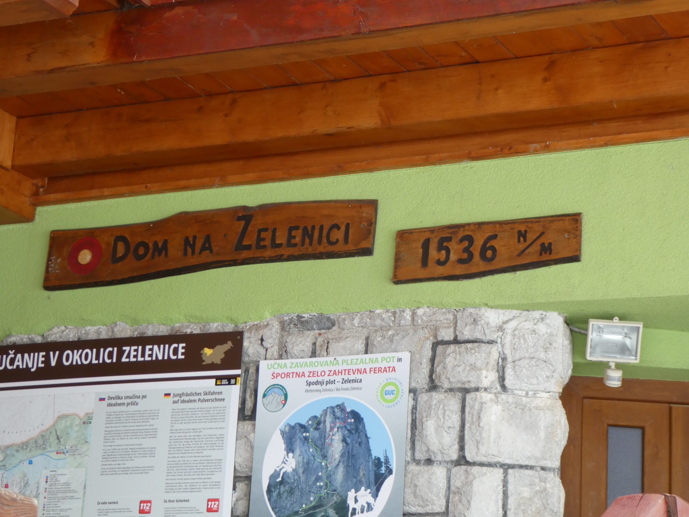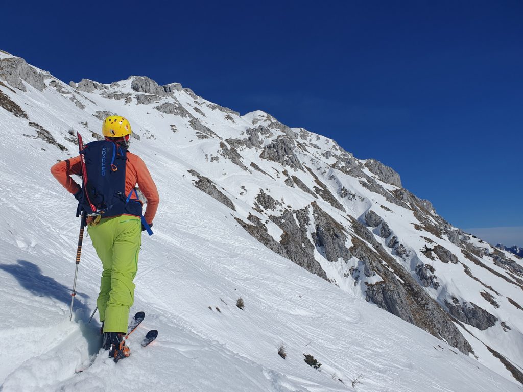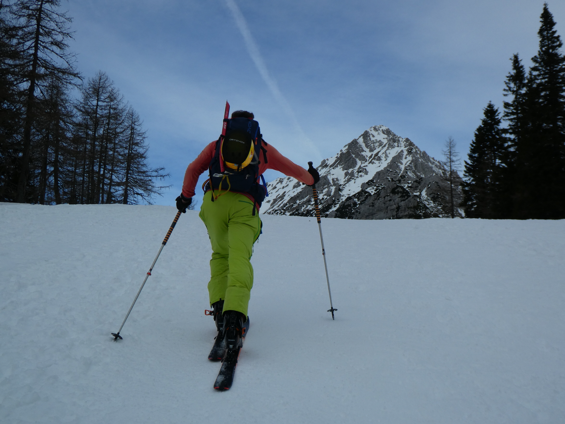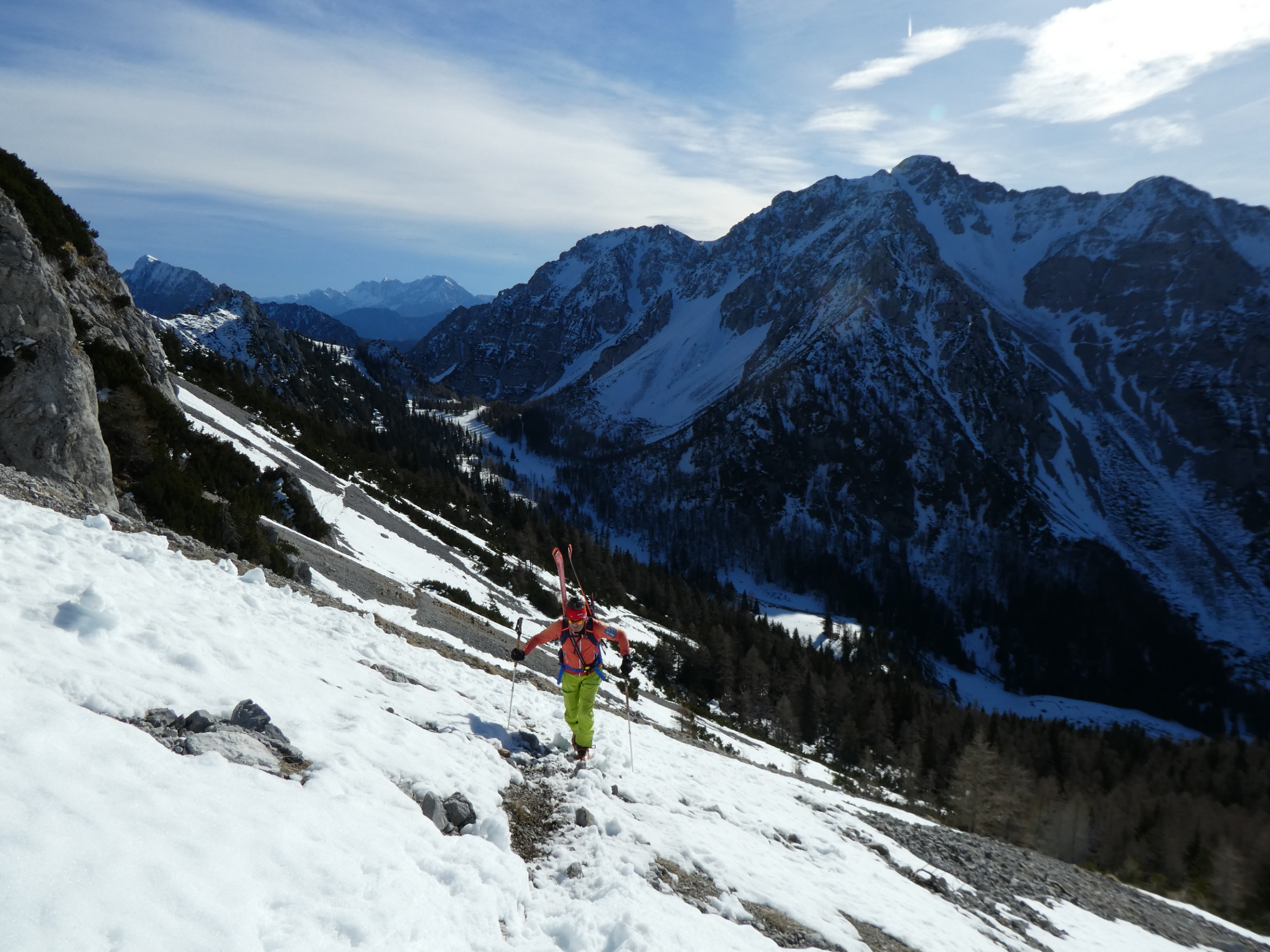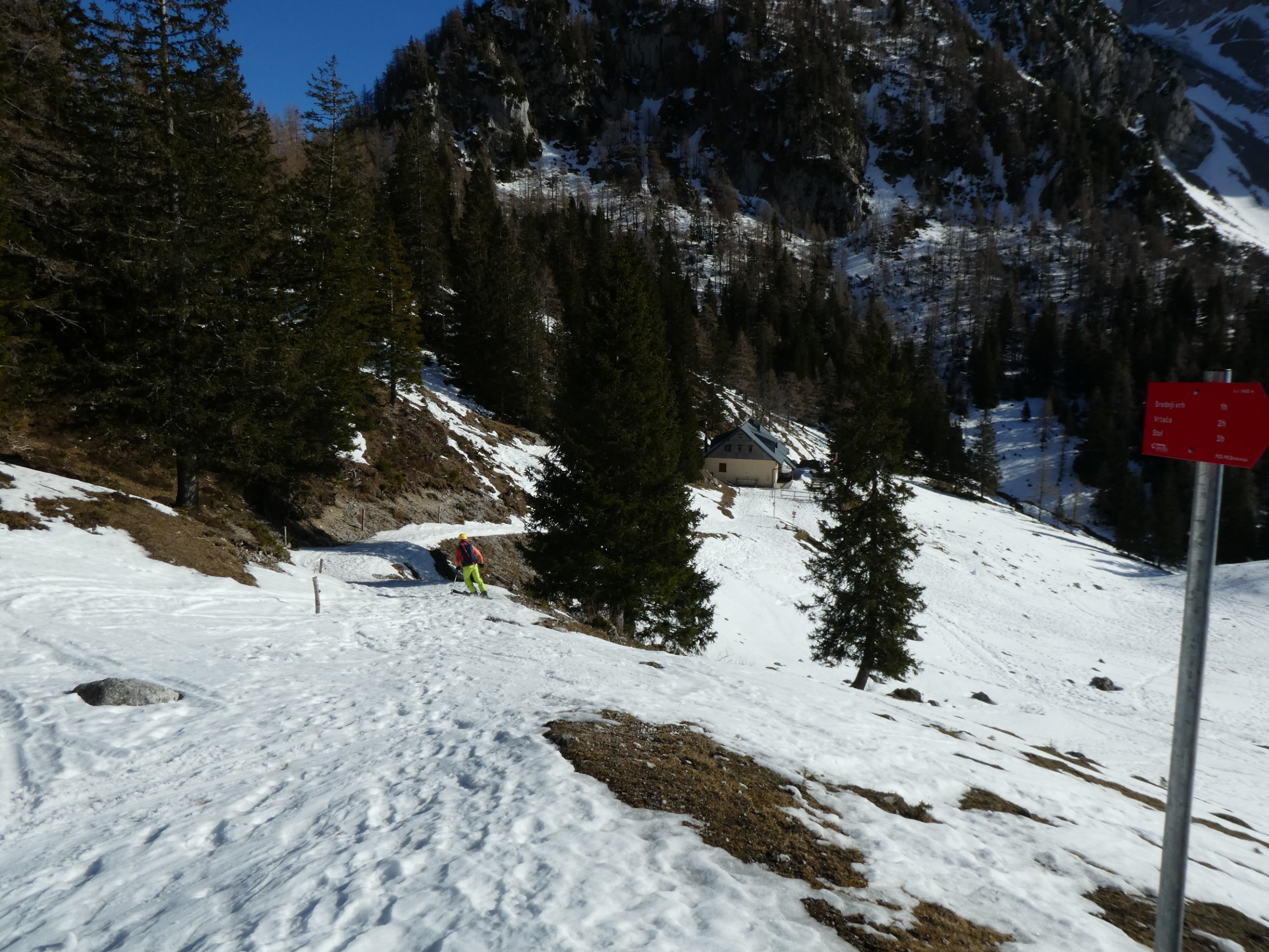 Auch diese Übung ist gelungen. Danach ging es auf einer ruppigen und – weil im Schatten gelegen – sehr harten Unterlage hinunter zum Planinski dom Mrzli studenec. Dort haben wir abgeschwungen, die letzten Tropfen aus der Trinkflasche geleert und die Felle wieder aufgezogen. Auf derselben Route, die mir schon von mehreren Überschreitungen der Begunjscica bekannt war, sind wir anschließend wieder in das ehemalige Skigebiet oberhalb vom Planinski dom na Zelenici angestiegen.