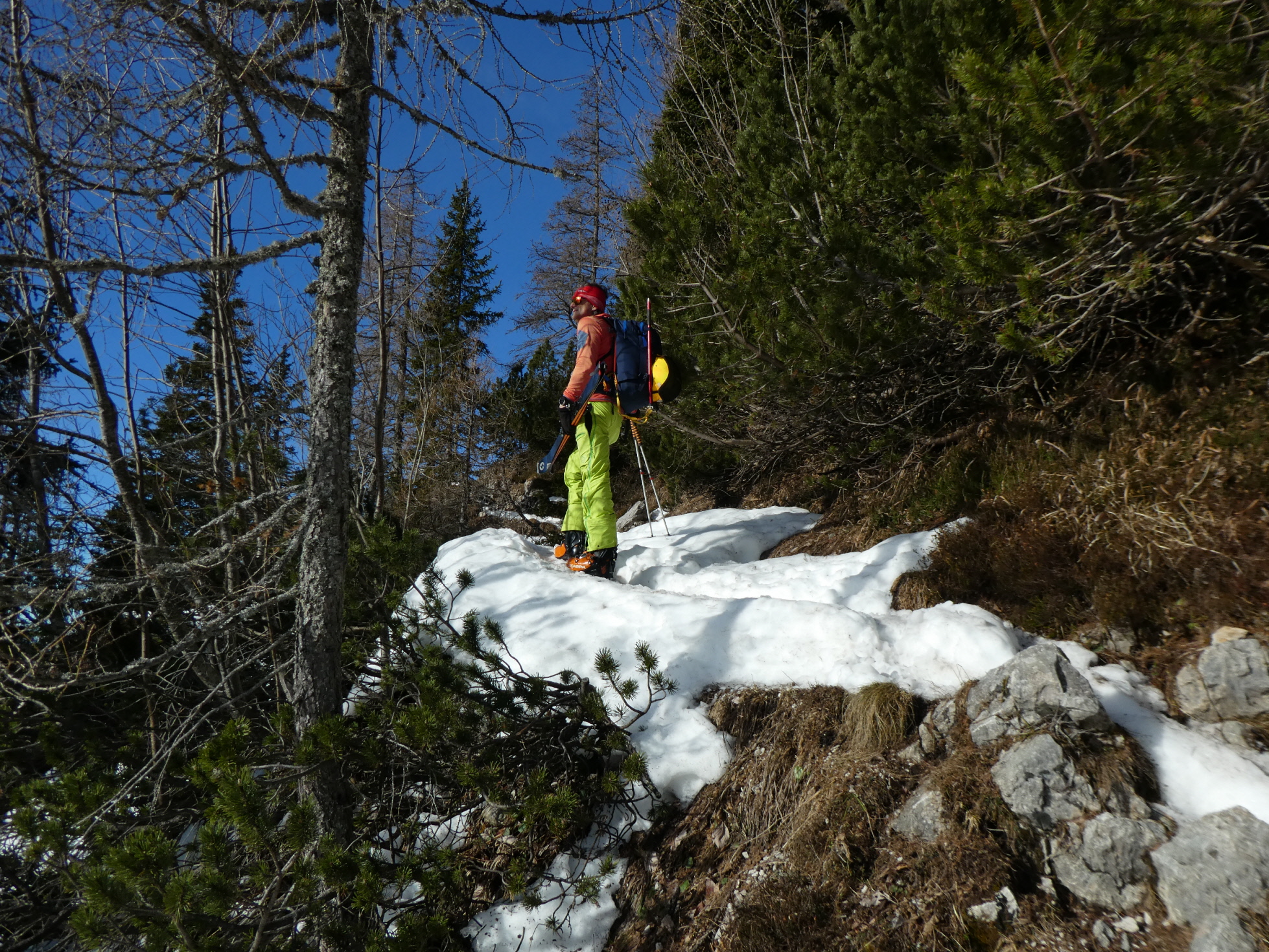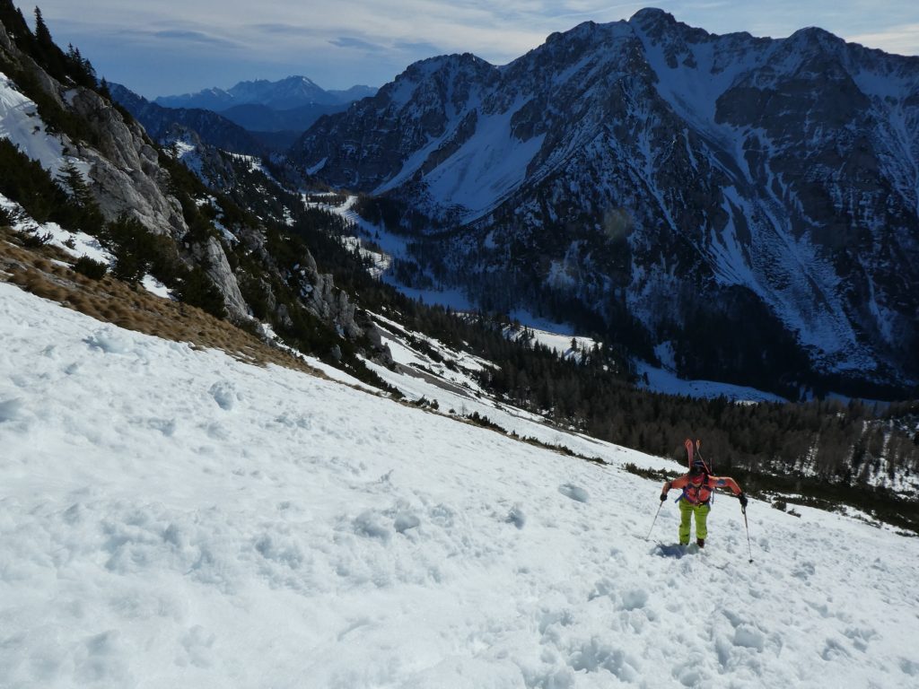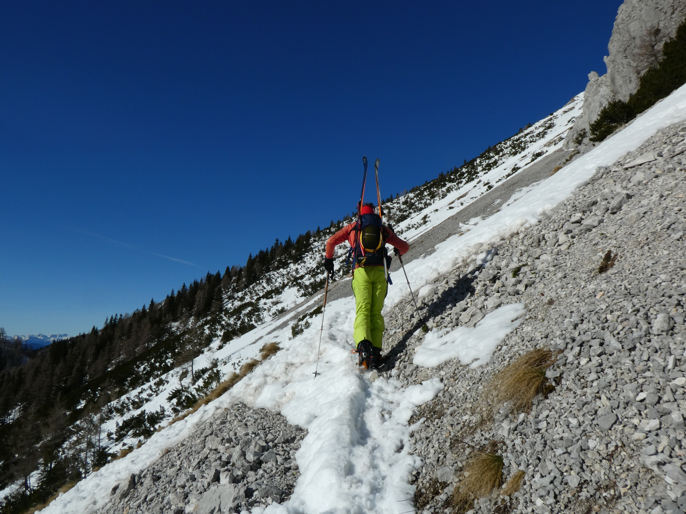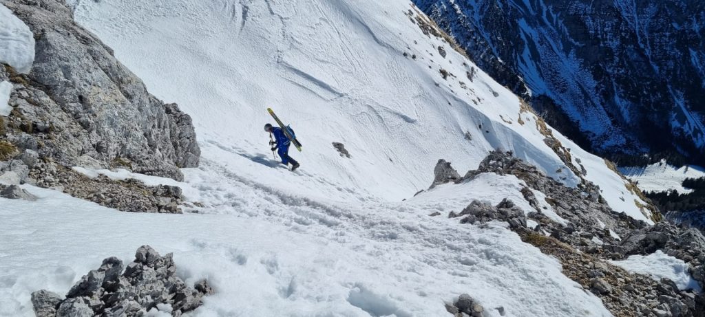 Dessen waren wir uns dann eh bald einmal bewusst. Situativ haben wir unsere Aufstiegsroute abgeändert. Die Alternative war jetzt, über die Südrinne, über die wir nach unserer ursprünglichen Planung abfahren wollten, auch aufzusteigen. Am Weg dorthin haben wir jetzt die Skier aufgepackt und sind an der Südseite der Vertatscha entlang und später links von den unteren Felsabbrüchen zur Rinne aufgestiegen.