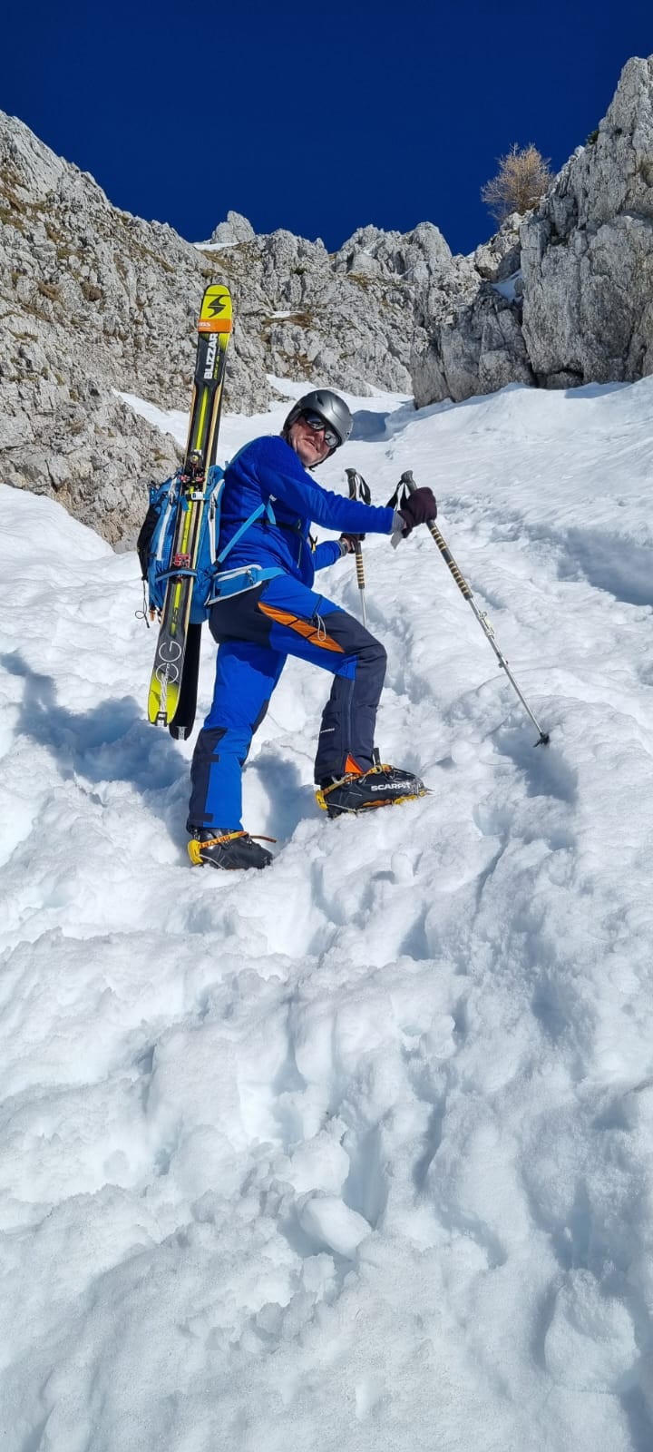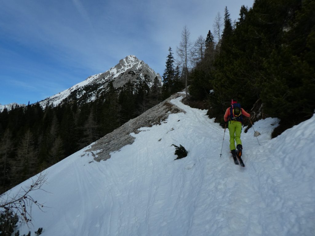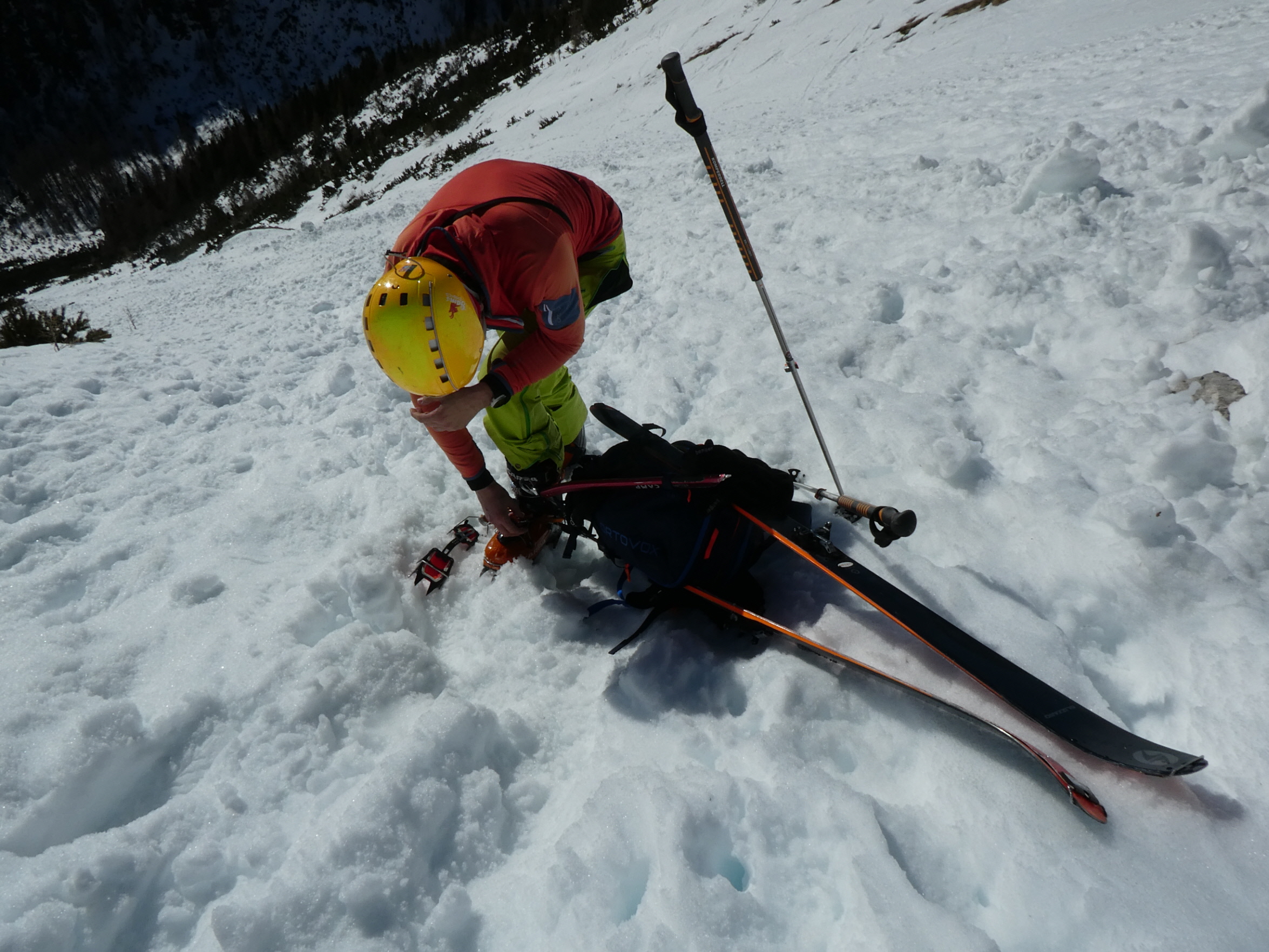 Dessen waren wir uns dann eh bald einmal bewusst. Situativ haben wir unsere Aufstiegsroute abgeändert. Die Alternative war jetzt, über die Südrinne, über die wir nach unserer ursprünglichen Planung abfahren wollten, auch aufzusteigen. Am Weg dorthin haben wir jetzt die Skier aufgepackt und sind an der Südseite der Vertatscha entlang und später links von den unteren Felsabbrüchen zur Rinne aufgestiegen.