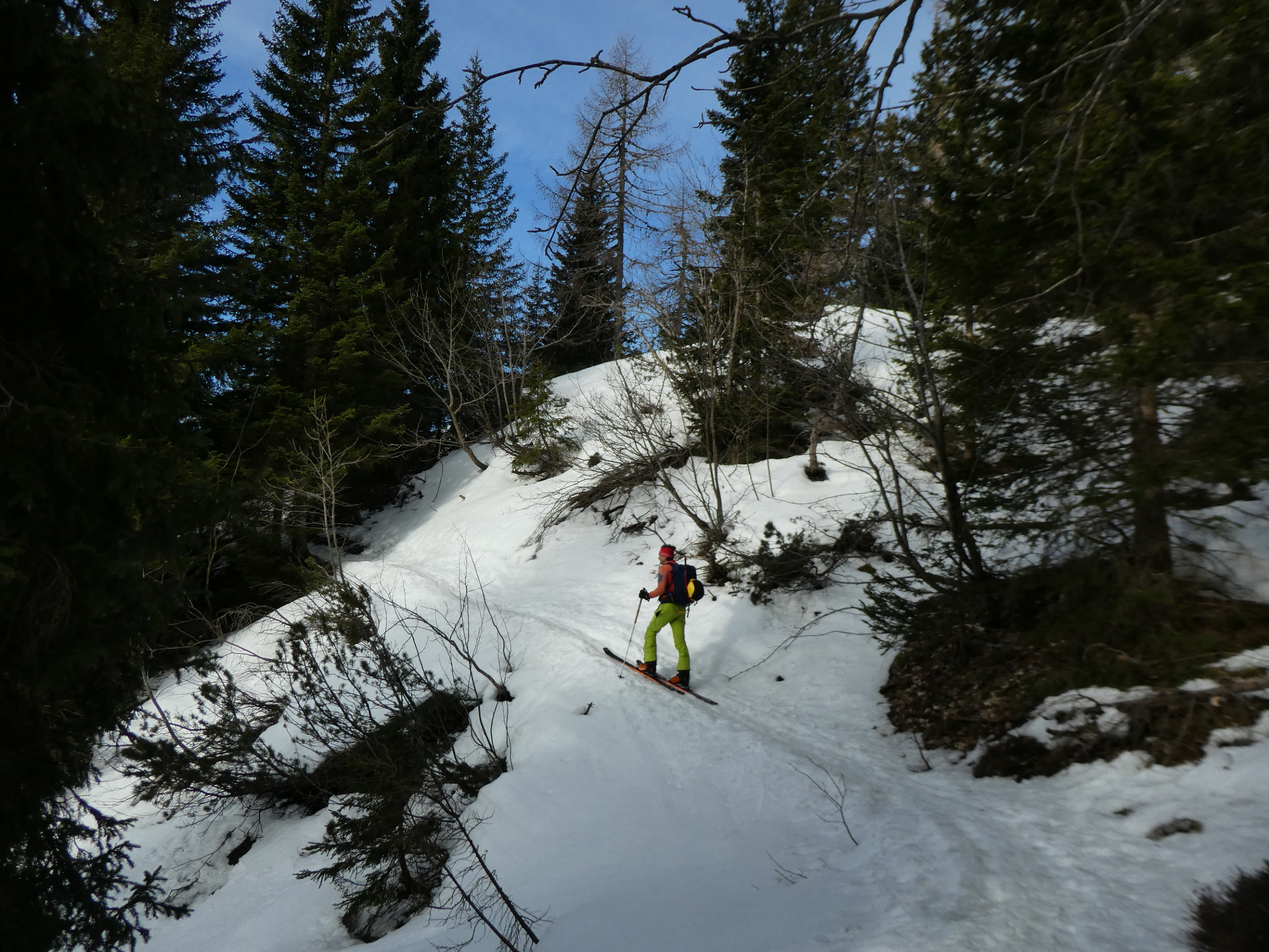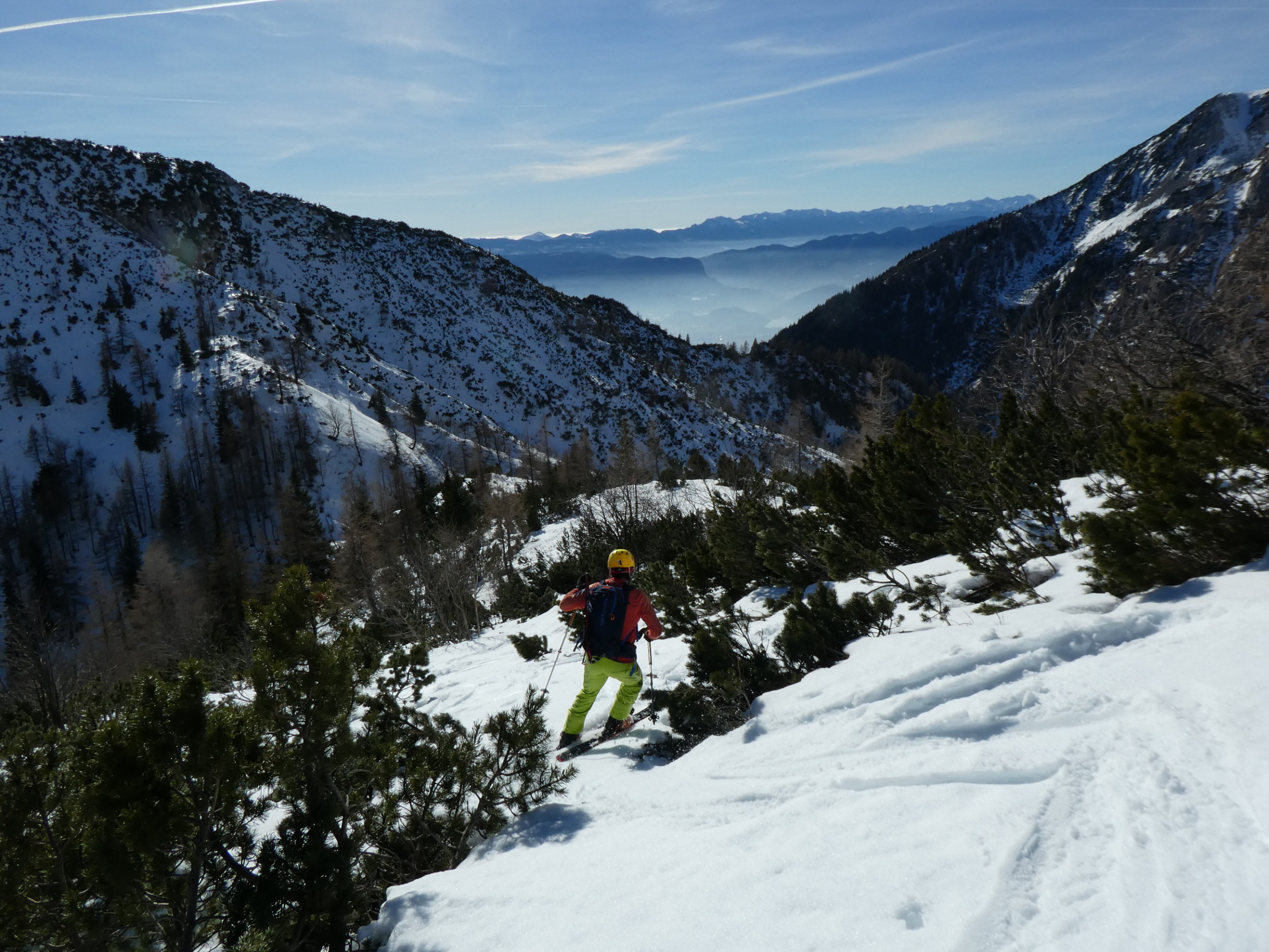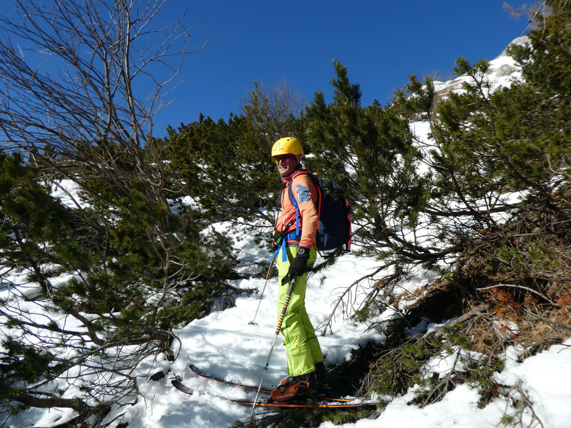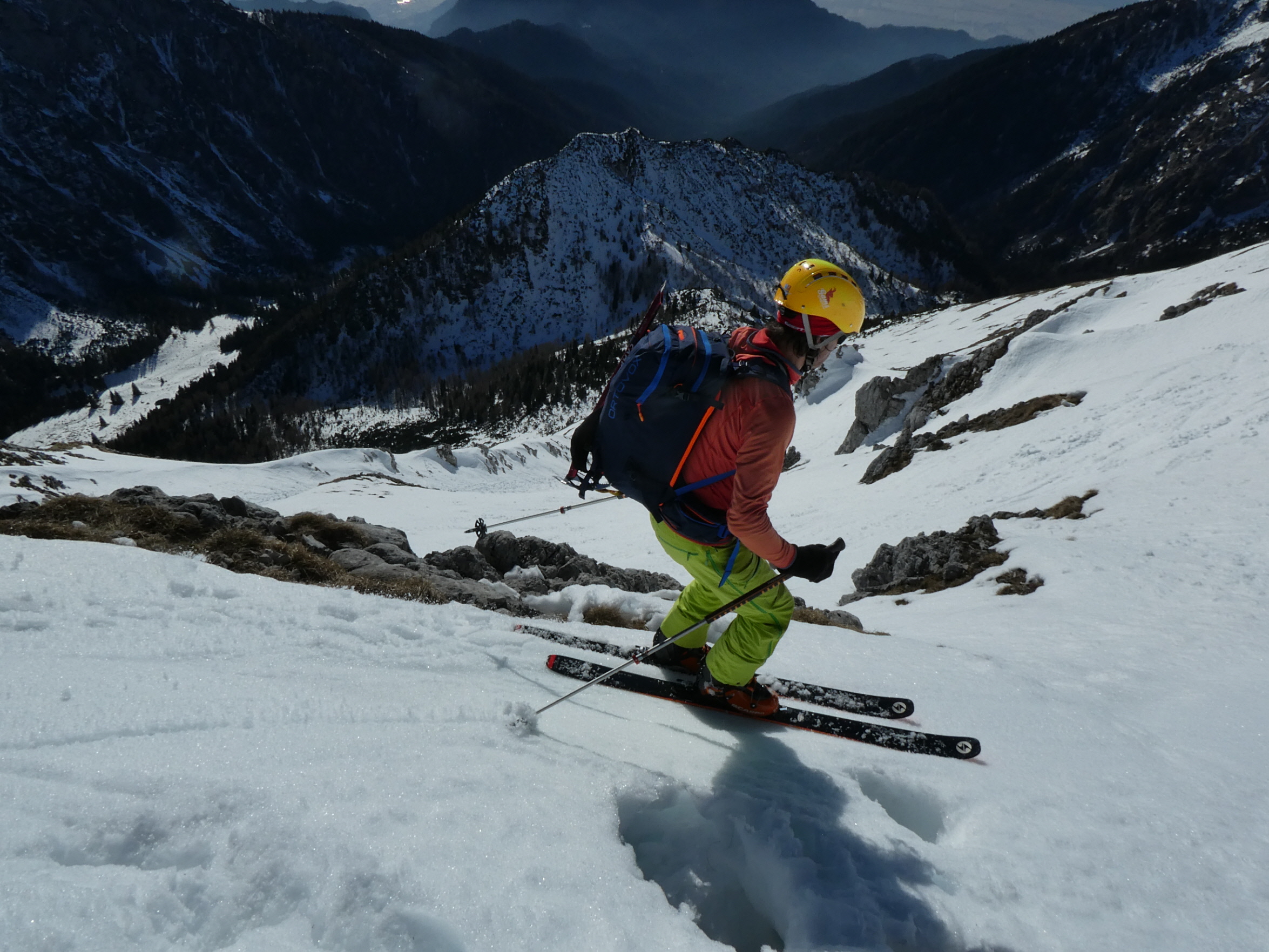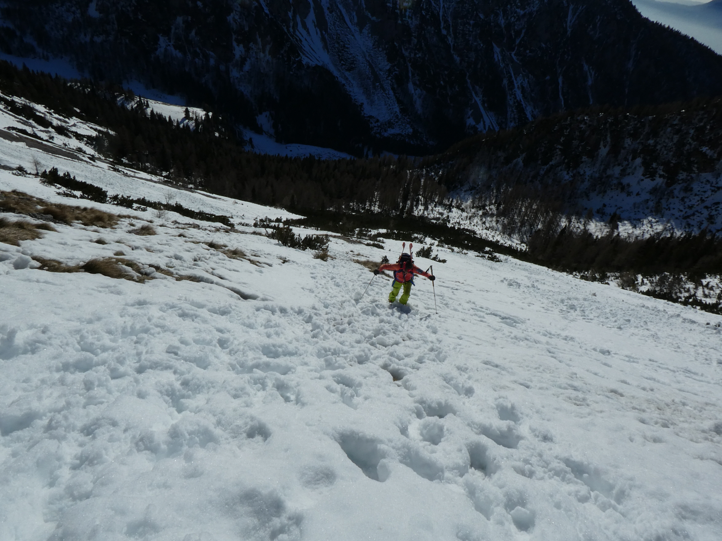 Die Abfahrtsroute haben wir sodann immer wieder für die nächsten 100 – 200 m neu bewertet und festgelegt. Als wir schließlich das felsige Steilgelände unter uns passiert hatten, sind wir etwas flotter ins Fahren gekommen und haben uns in Richtung des Sattels zwischen Vertatscha und dem Srednji vrh orientiert. Mit abnehmender Höhe ist der Schnee erwartungsgemäß etwas tiefer geworden, aber immer noch gut fahrbar gewesen. Im Schlussteil dieses Abschnitts der Abfahrt mussten wir noch einen Latschentango absolvieren.