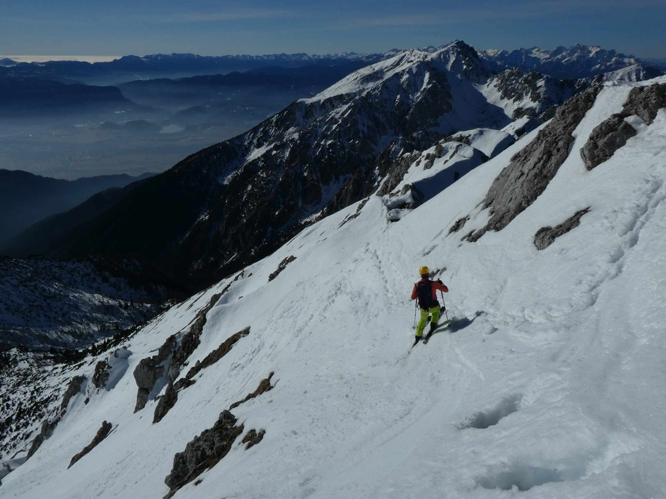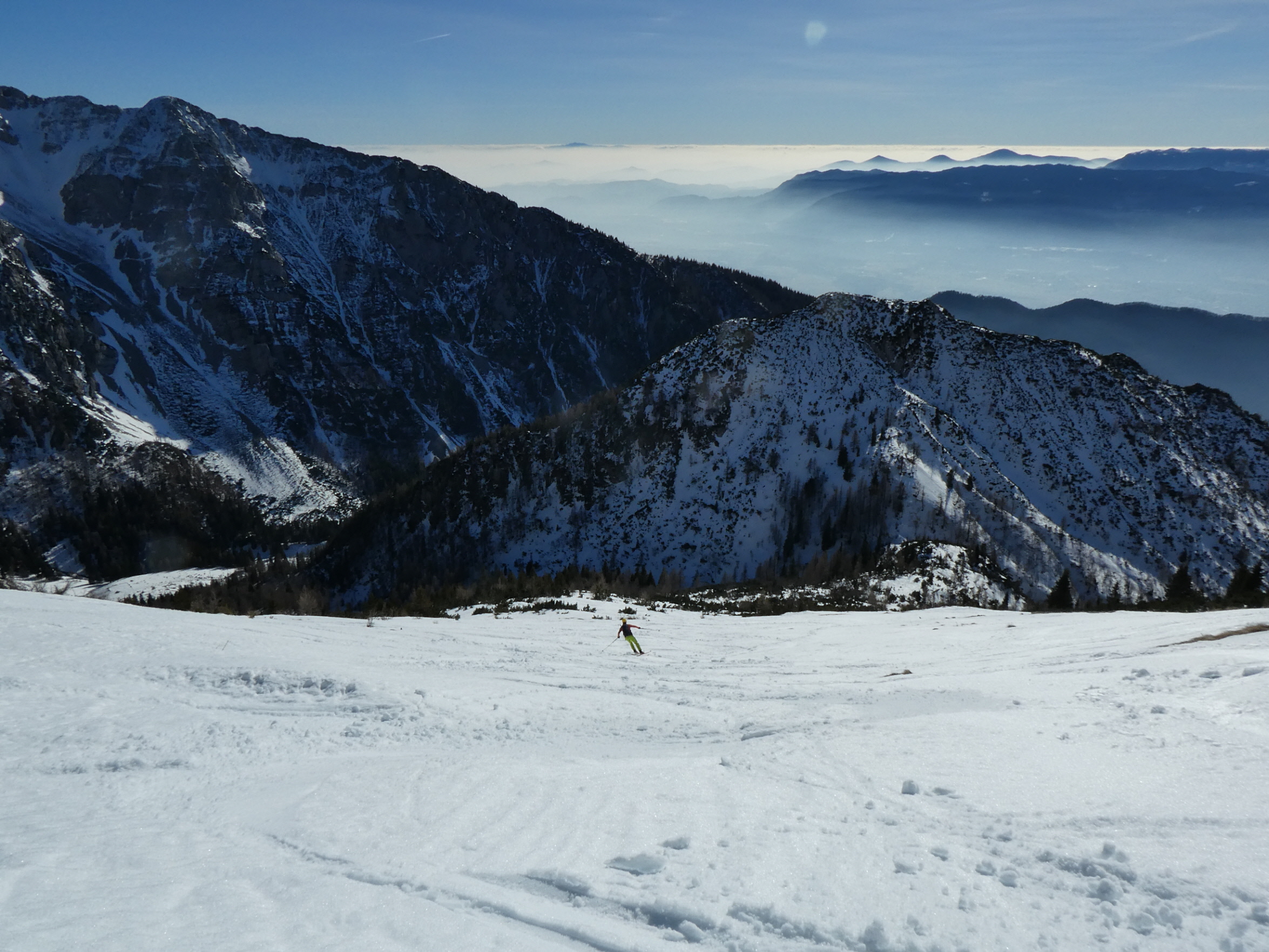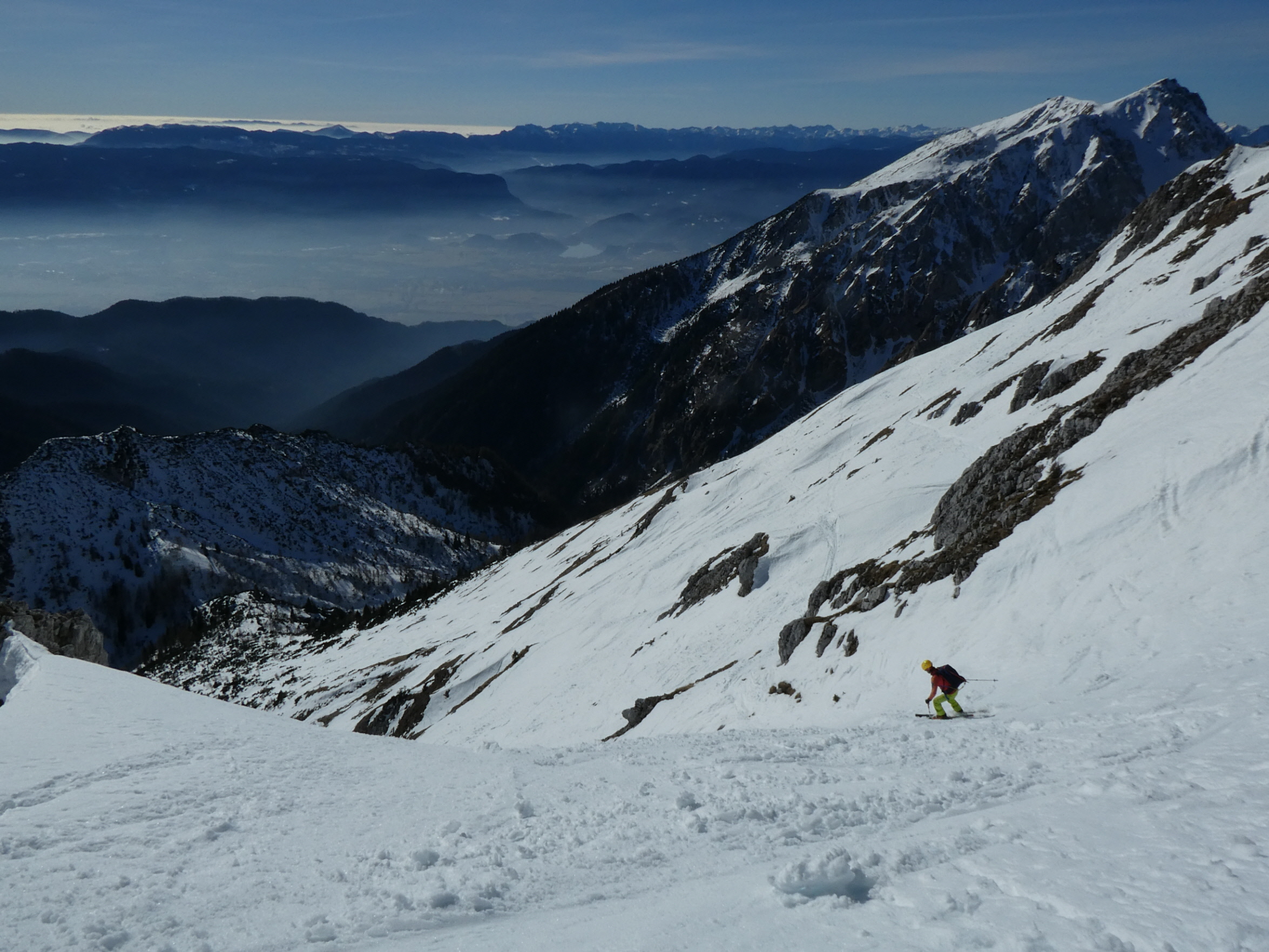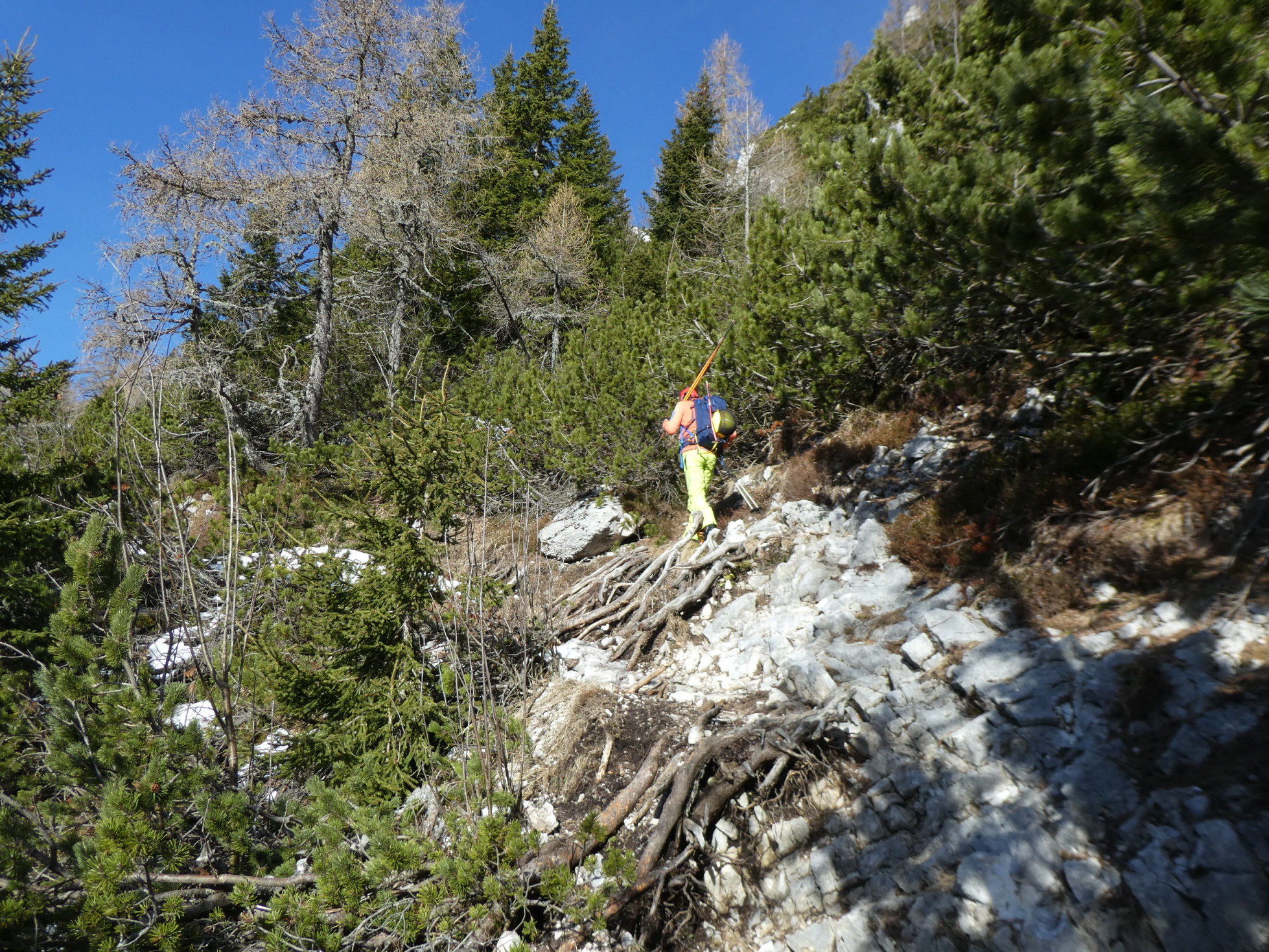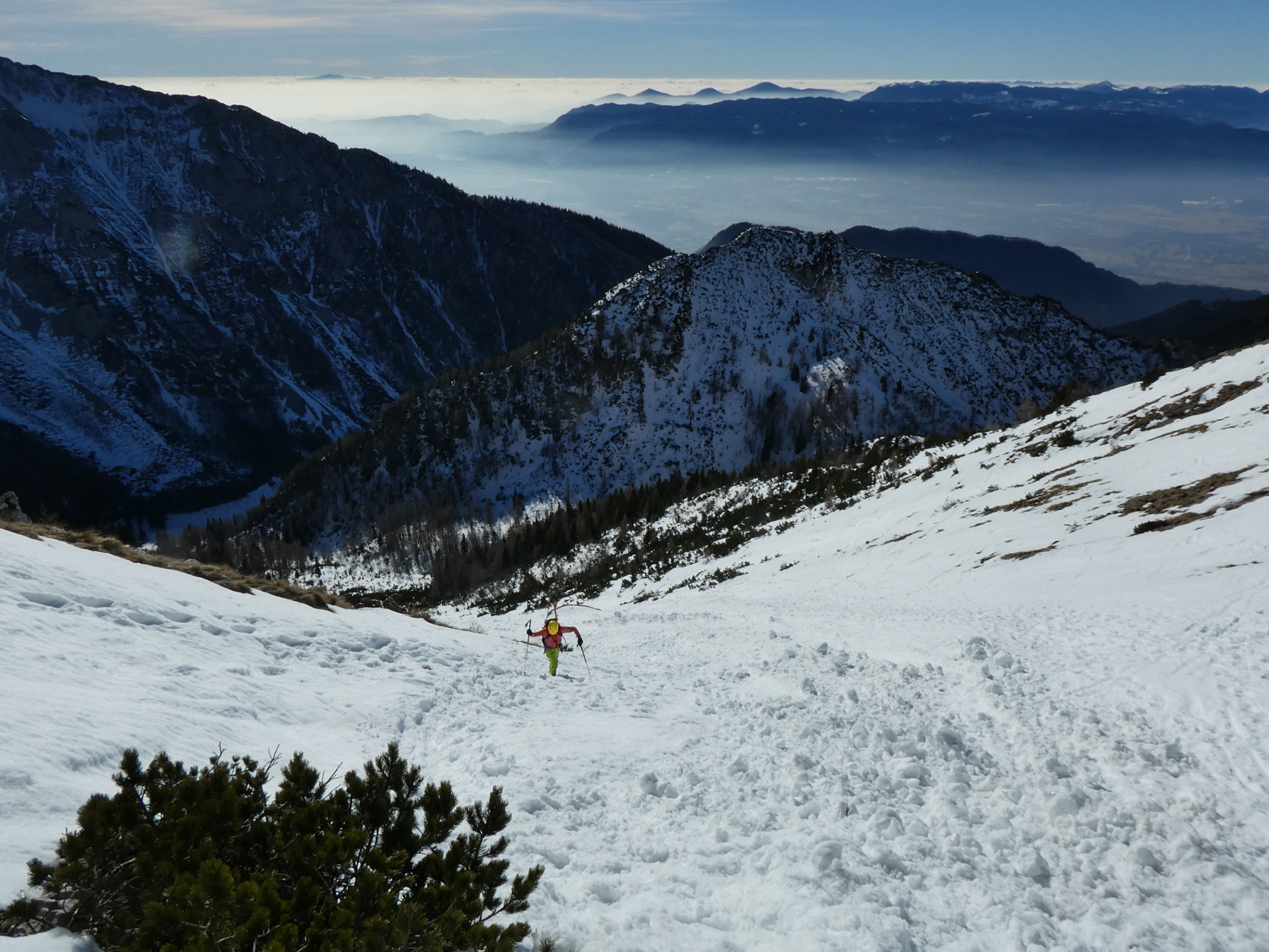 Die Abfahrtsroute haben wir sodann immer wieder für die nächsten 100 – 200 m neu bewertet und festgelegt. Als wir schließlich das felsige Steilgelände unter uns passiert hatten, sind wir etwas flotter ins Fahren gekommen und haben uns in Richtung des Sattels zwischen Vertatscha und dem Srednji vrh orientiert. Mit abnehmender Höhe ist der Schnee erwartungsgemäß etwas tiefer geworden, aber immer noch gut fahrbar gewesen. Im Schlussteil dieses Abschnitts der Abfahrt mussten wir noch einen Latschentango absolvieren.