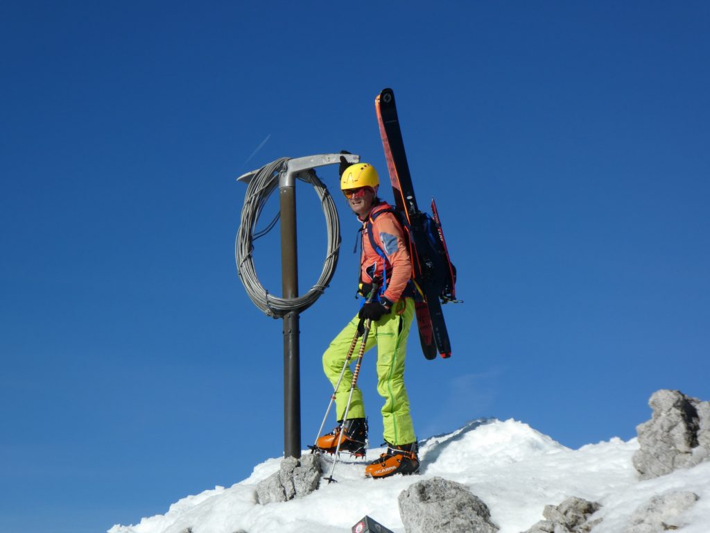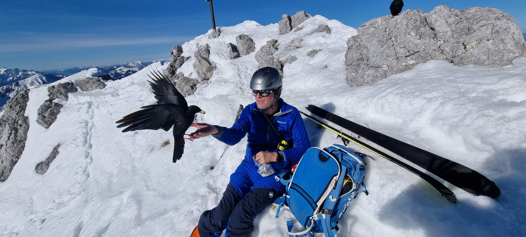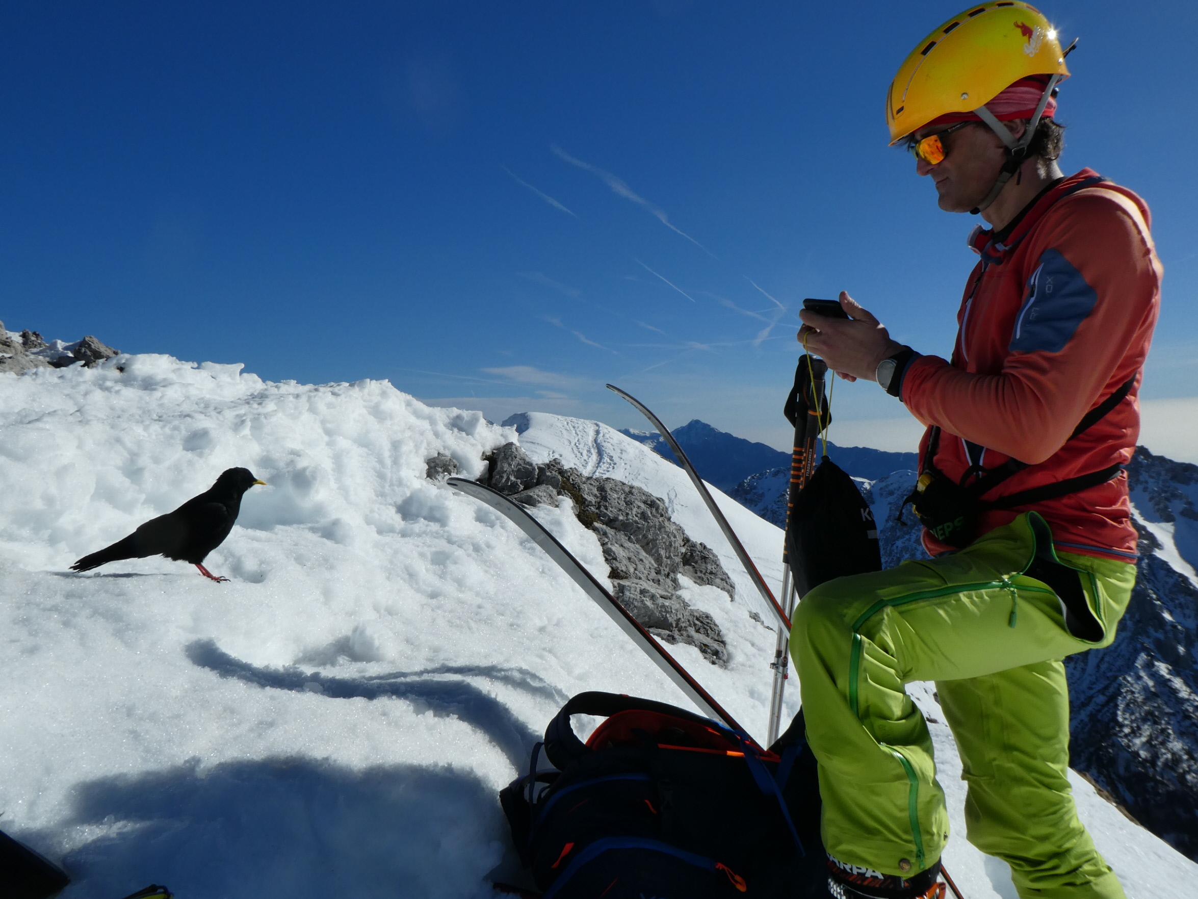Die Steigeisen kamen wie auch die Felle in den Rucksack, im Gegenzug die Jause und das höchst notwendige Getränk heraus. Einige sehr freche Dohlen haben uns beim Verzehr von Nüssen aus dem Jausensack „unterstützt“. Als wir uns auch an der Szenerie rund um uns sattgesehen hatten, haben wir angeschnallt und nach den ersten Abfahrtsmetern war klar, dass die Schneekonsistenz besser nicht sein könnte.