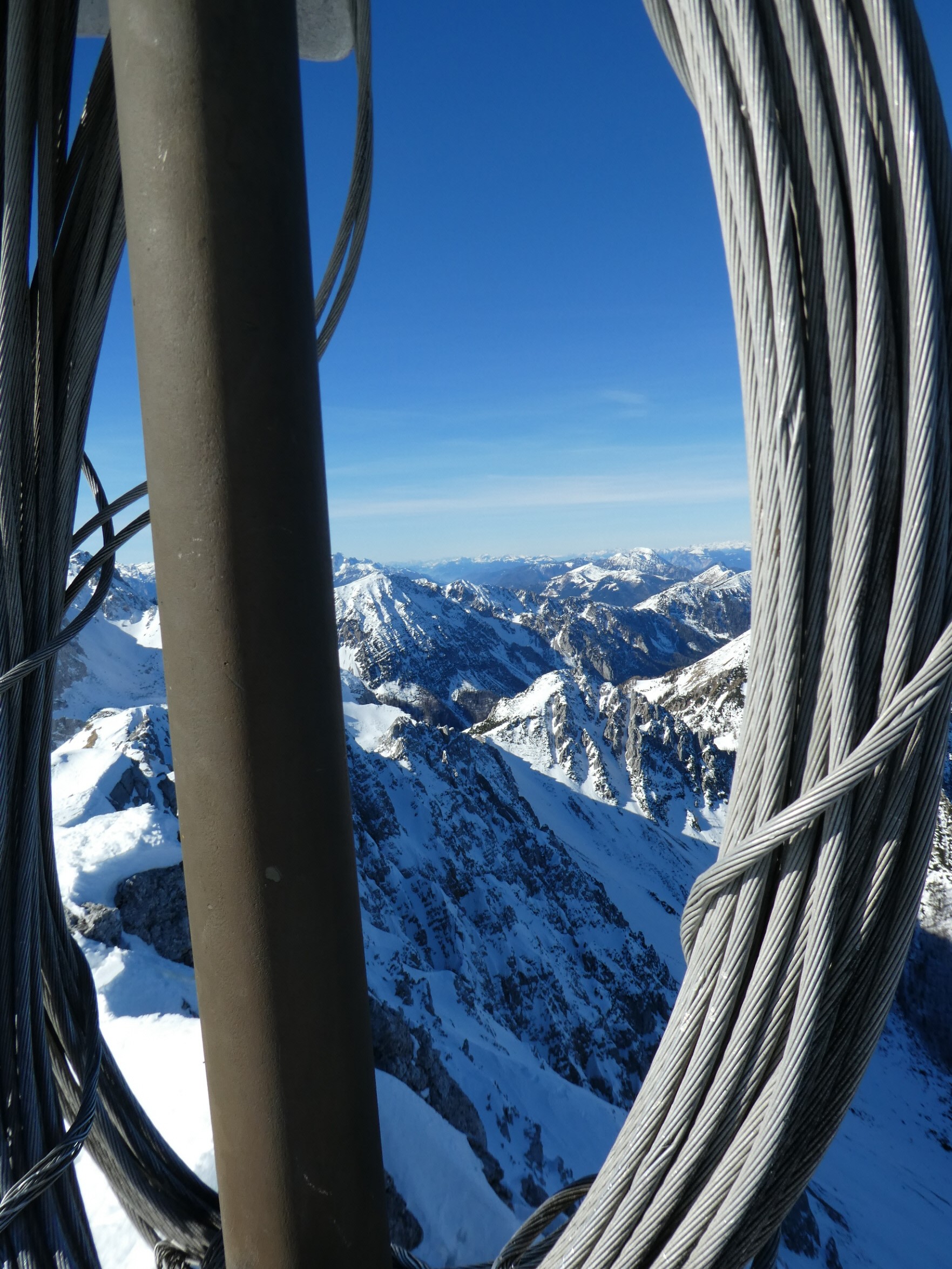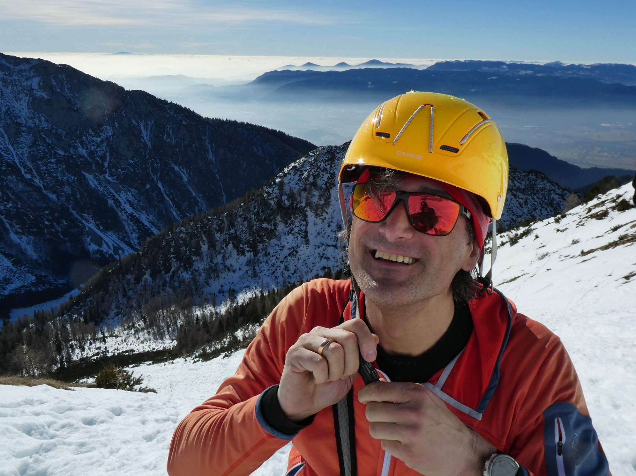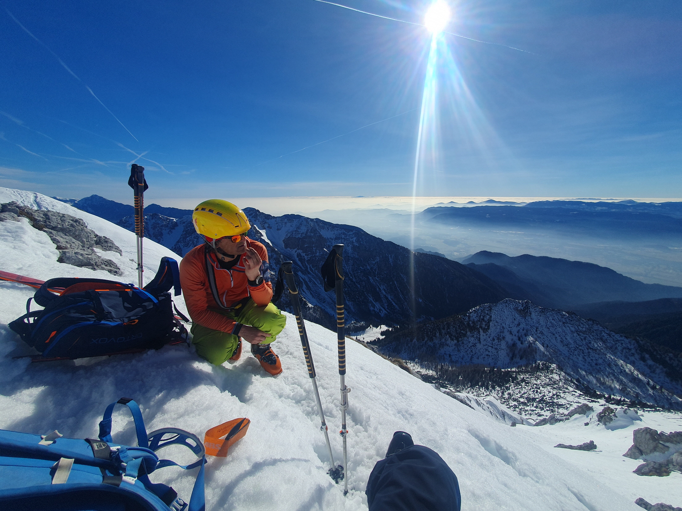 Die Steigeisen kamen wie auch die Felle in den Rucksack, im Gegenzug die Jause und das höchst notwendige Getränk heraus. Einige sehr freche Dohlen haben uns beim Verzehr von Nüssen aus dem Jausensack „unterstützt“. Als wir uns auch an der Szenerie rund um uns sattgesehen hatten, haben wir angeschnallt und nach den ersten Abfahrtsmetern war klar, dass die Schneekonsistenz besser nicht sein könnte.