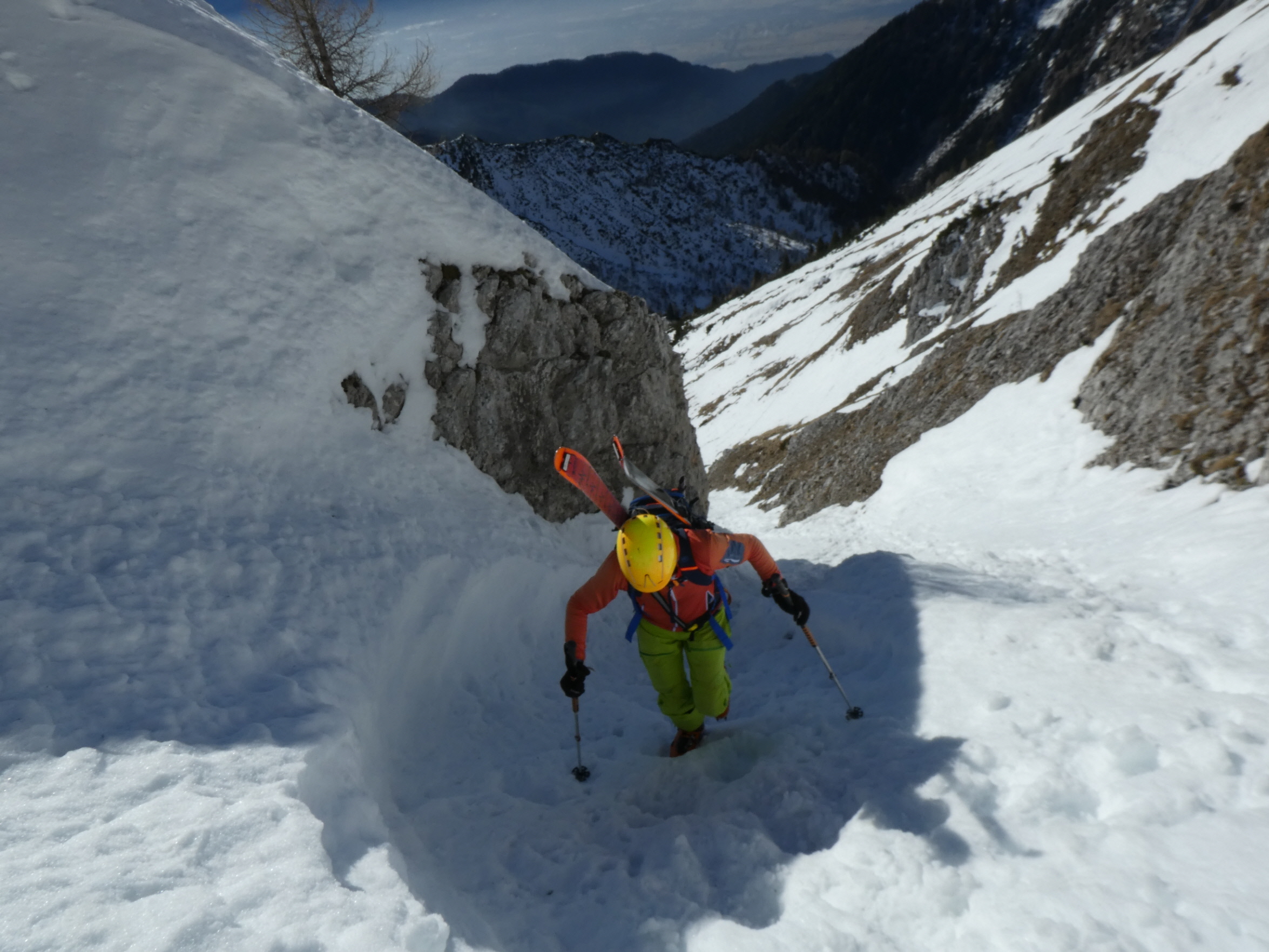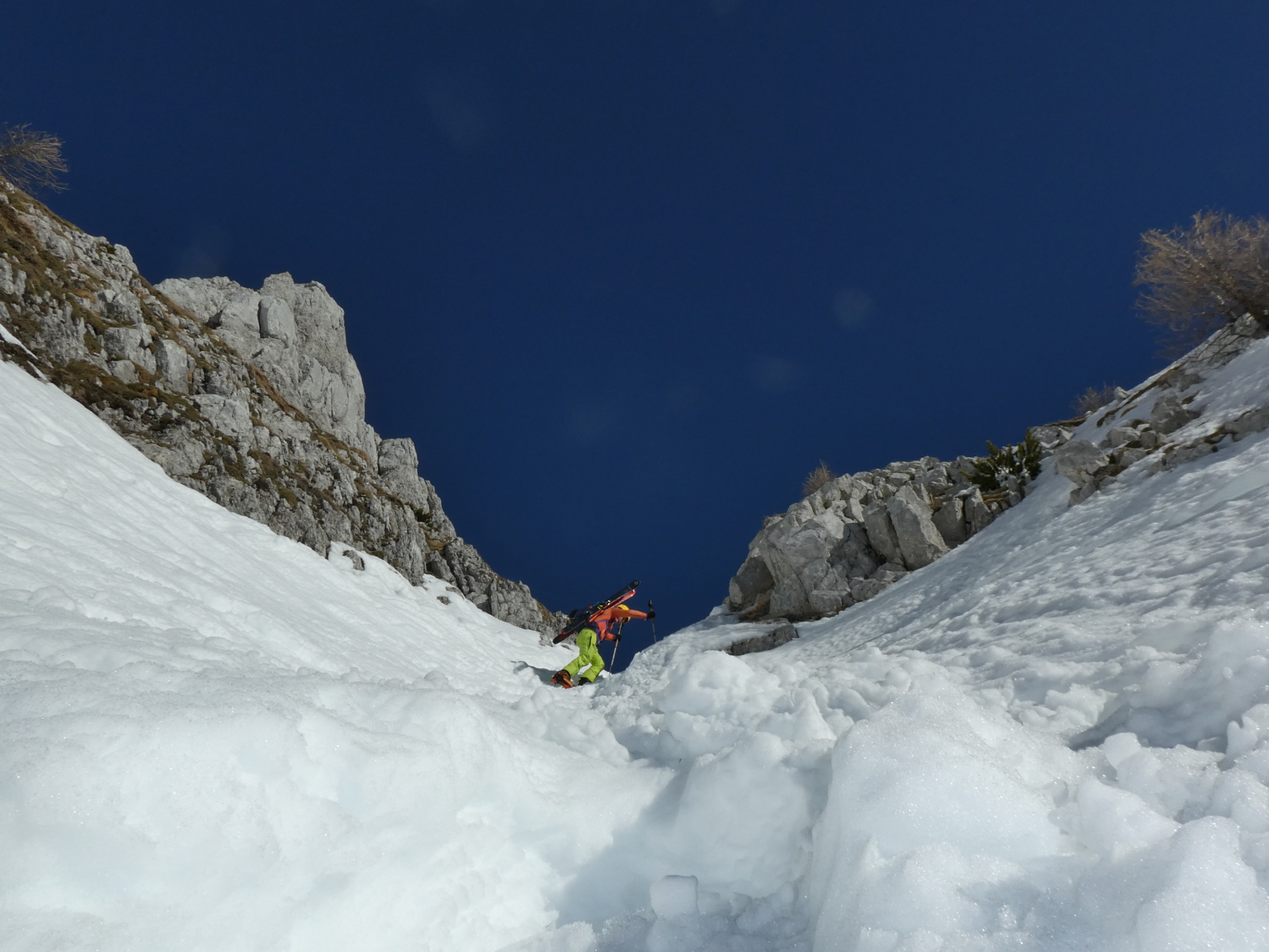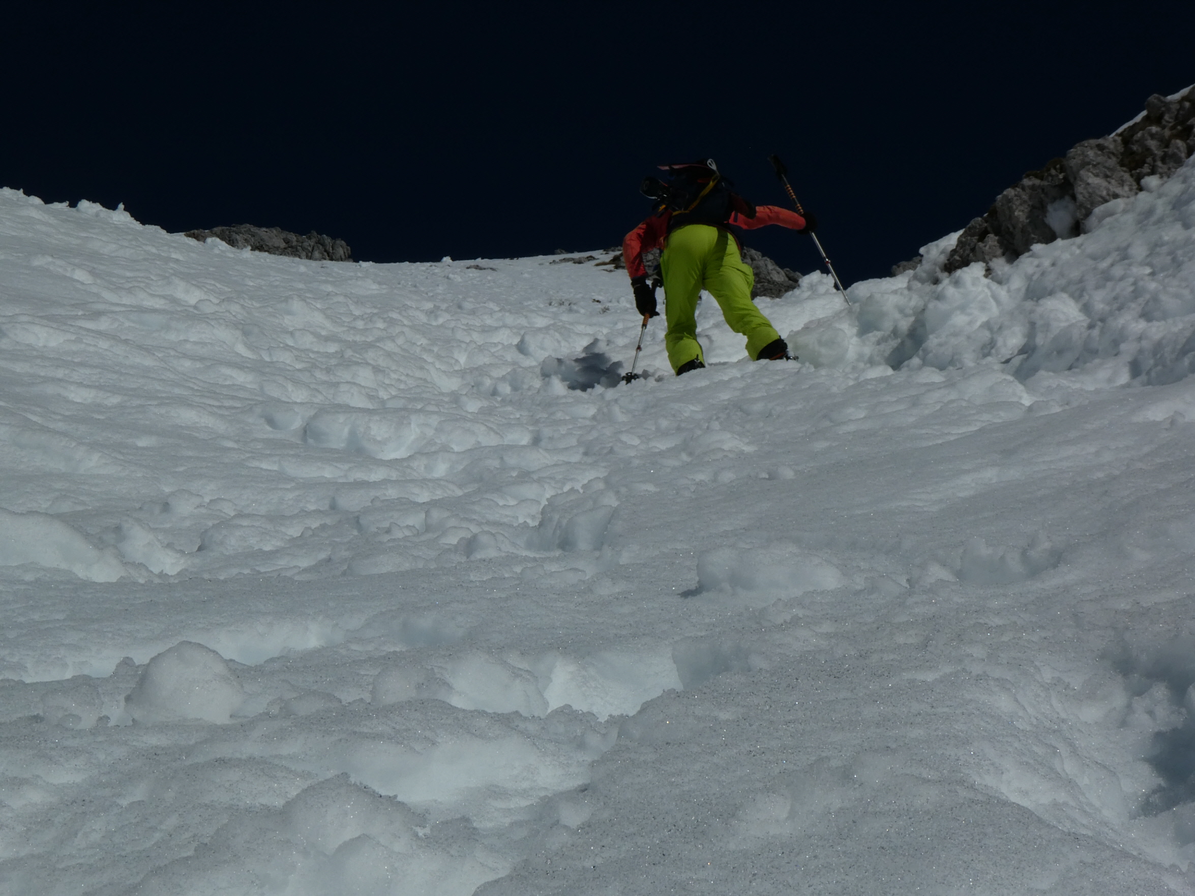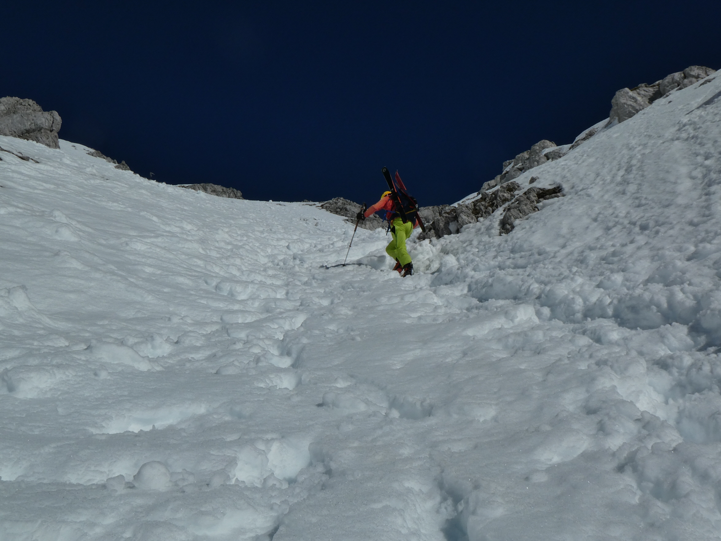 Dann sind wir in die Rinne eingestiegen. Bald einmal haben wir bemerkt, dass diese ob der vielen Trittstufen, Schleifrinnen und hineingerutschten Schneeknollen sicher kein gutes Skigelände für die spätere Abfahrt sein wird. Wir haben angefangen, uns nach Alternativmöglichkeiten umzusehen. Die Flanke oberhalb der die Rinne begrenzenden Felsabbrüche hat schon alte Skispuren aufgewiesen und jedenfalls einladender ausgeschaut als die Rinne.