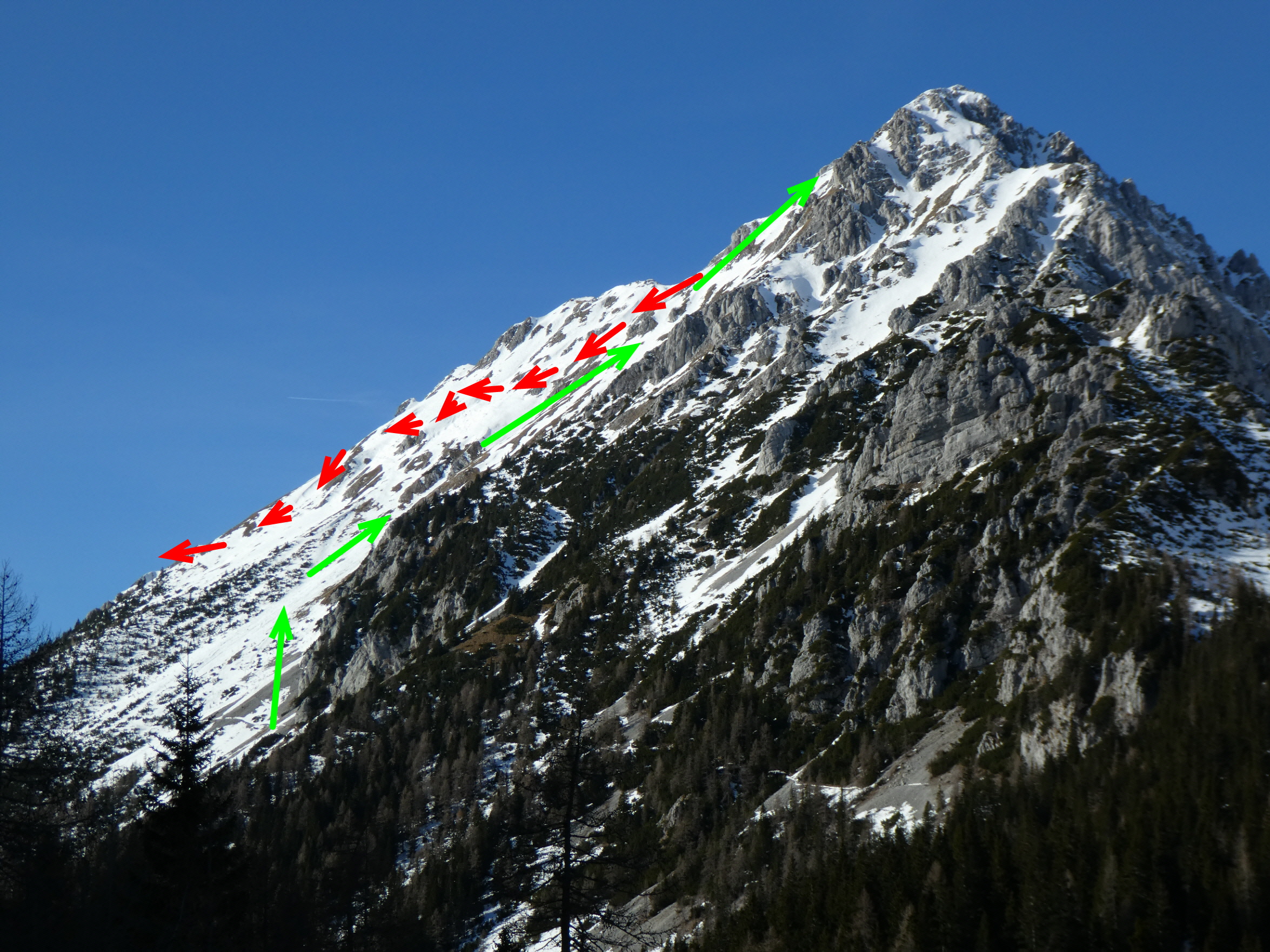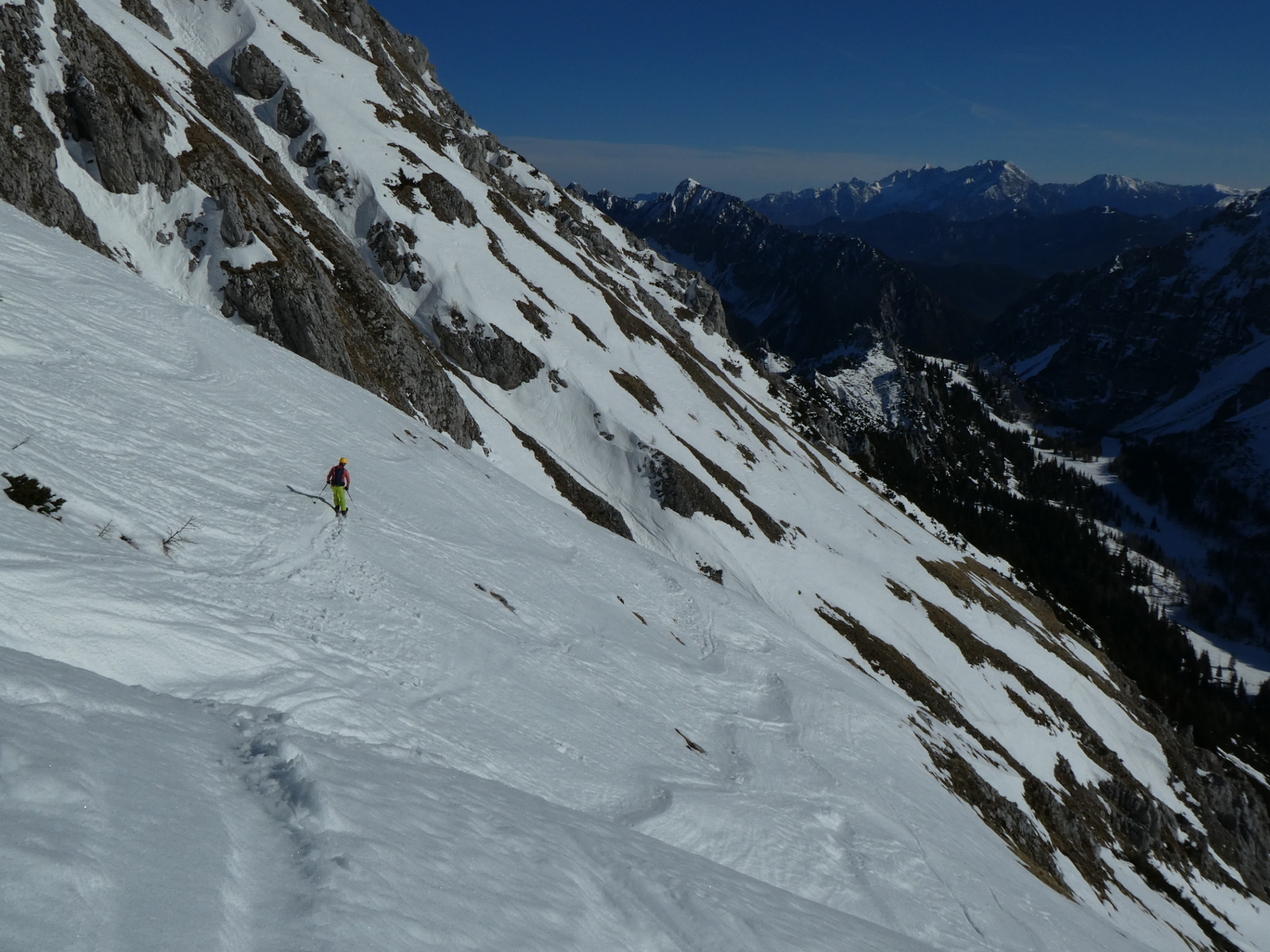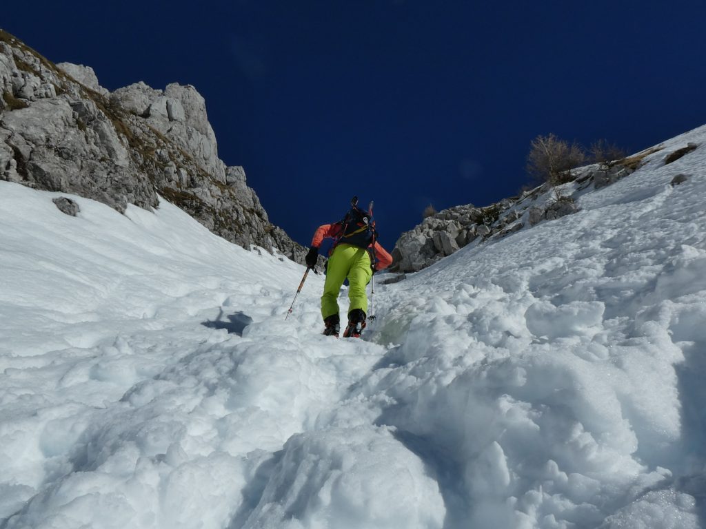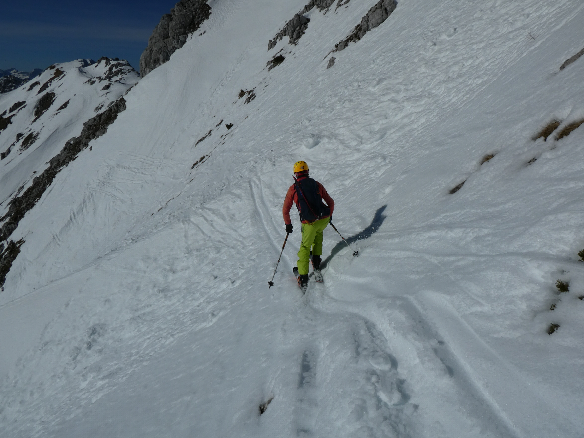 Dann sind wir in die Rinne eingestiegen. Bald einmal haben wir bemerkt, dass diese ob der vielen Trittstufen, Schleifrinnen und hineingerutschten Schneeknollen sicher kein gutes Skigelände für die spätere Abfahrt sein wird. Wir haben angefangen, uns nach Alternativmöglichkeiten umzusehen. Die Flanke oberhalb der die Rinne begrenzenden Felsabbrüche hat schon alte Skispuren aufgewiesen und jedenfalls einladender ausgeschaut als die Rinne.