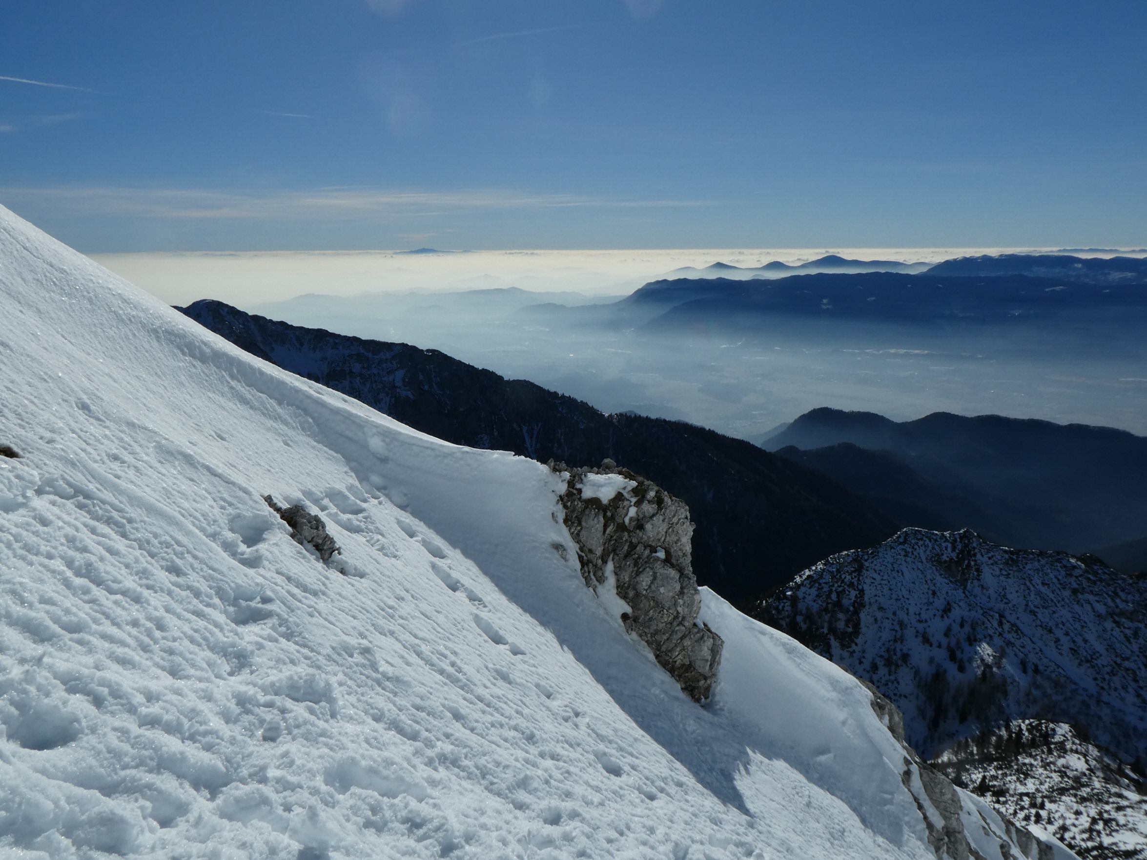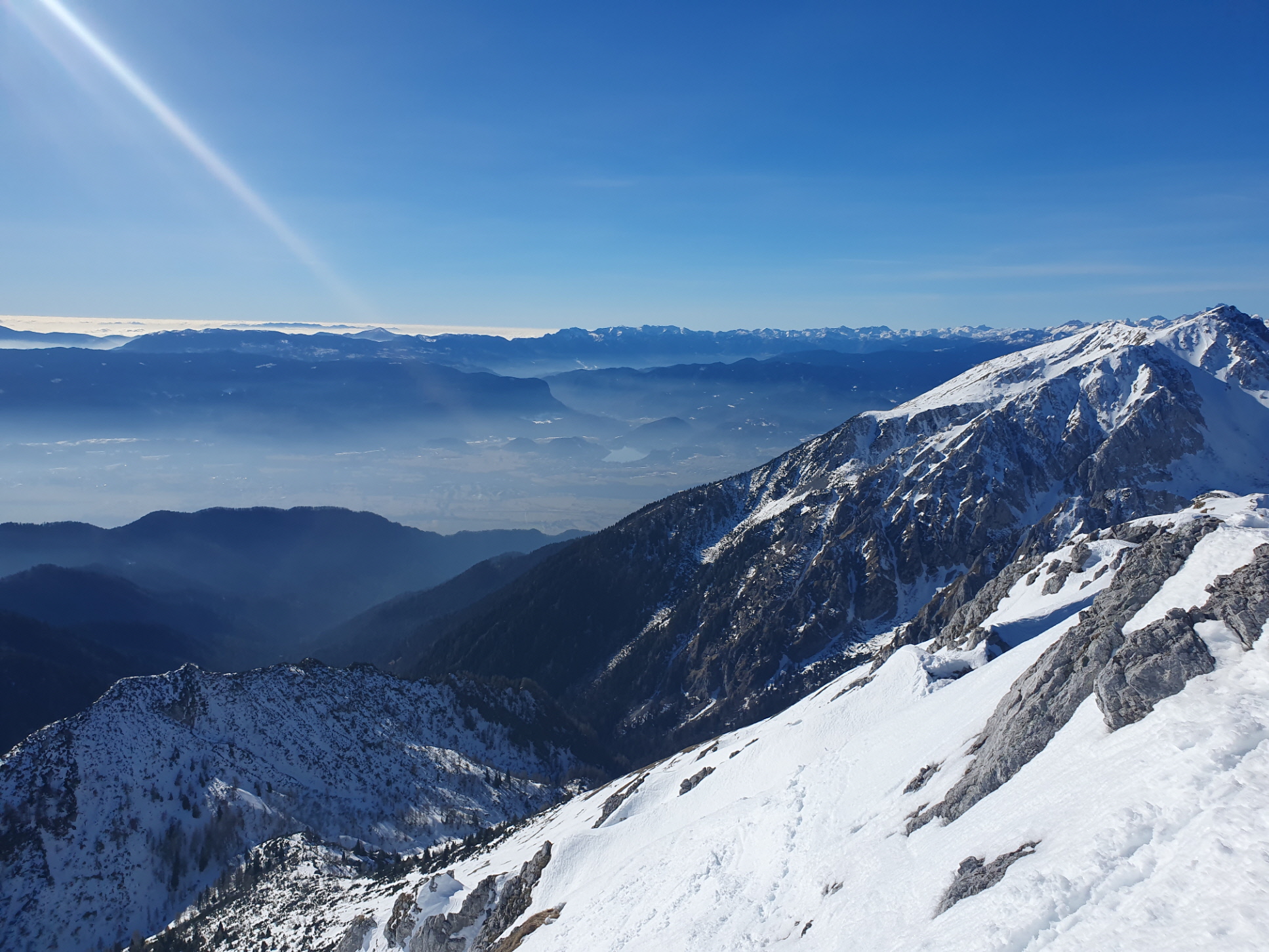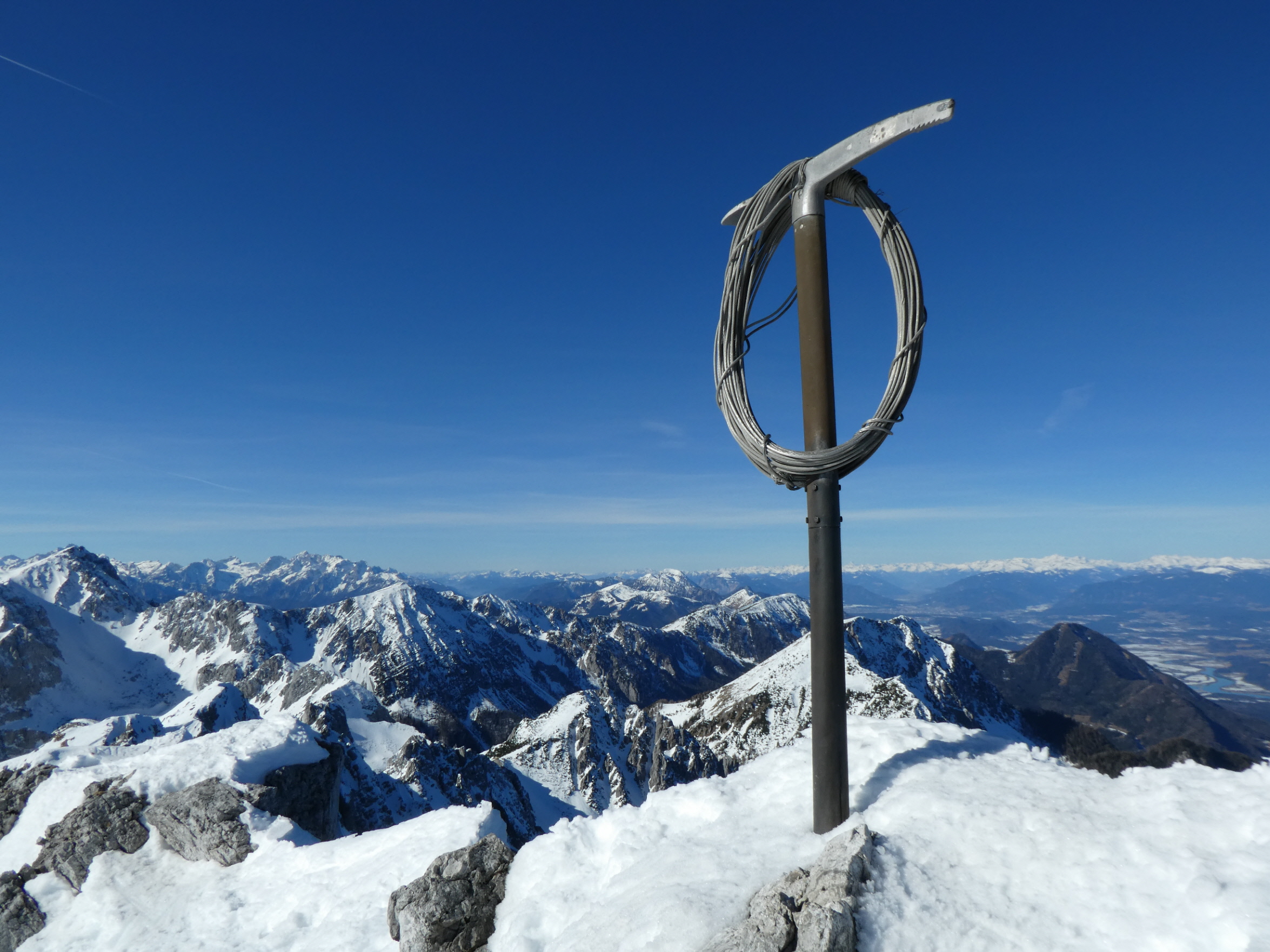 Nach3 Std 50 min Aufstiegszeit (mit Pausen) waren wir wieder einmal am Gipfel des zweithöchsten Berges der Karawanken mit seinem unverwechselbaren Gipfelzeichen, einen stählernen Pickel mit einem aufgerollten Kletterseil, ebenso aus Stahl. Die leichte Brise aus dem Norden war nur unmittelbar am Grat, der hier auch die Staatsgrenze zwischen Österreich und Slowenien bildet, spürbar. Zwei Meter darunter haben wir an der Südseite bei vollkommener Windstille unseren Gipfelaufenthalt zelebriert.
