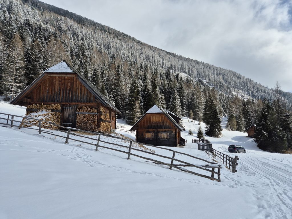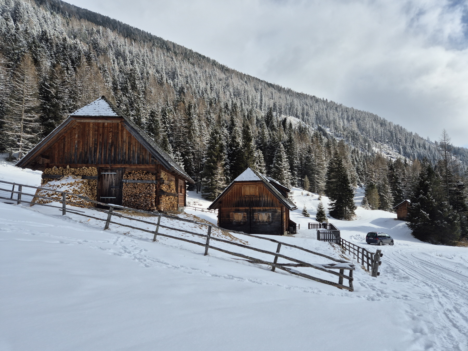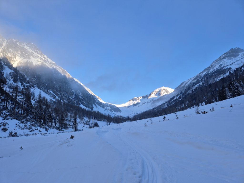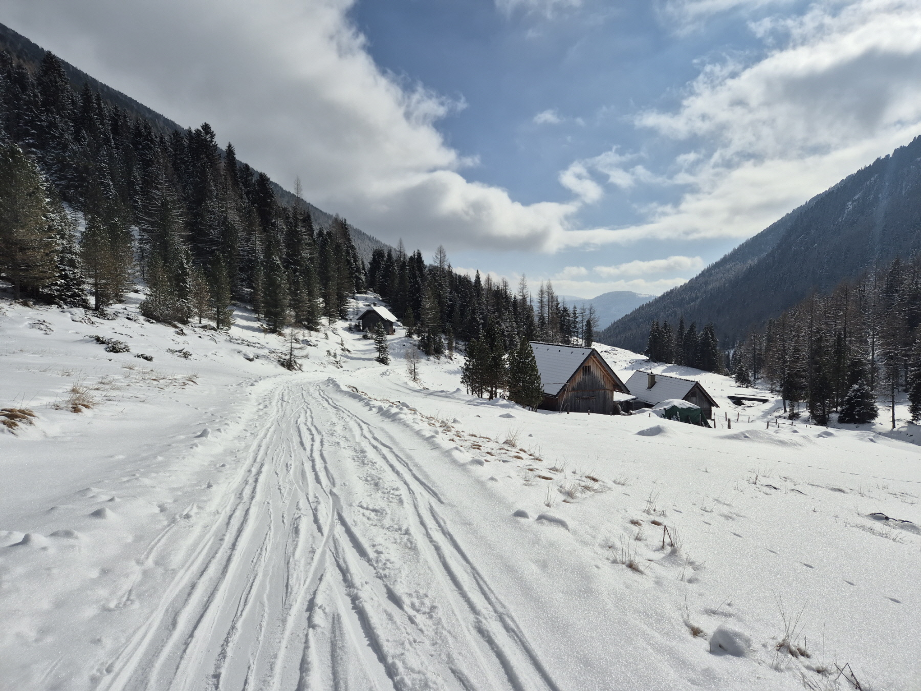 Vorbei an den vielen Almhütten danach bin ich entlang des Weges angestiegen. Bei der letzten Wegkehre bin ich in der direkten Linie hinauf zum Rantensee weitergegangen. Während es beim Tourenstart mit minus 10 Grad noch vergleichsweise „warm“ war, habe ich dort minus 19 Grad gemessen. Da habe ich kurzzeitig überlegt, das Daunengilet aus dem Rucksack zu holen und mir noch überzuziehen.