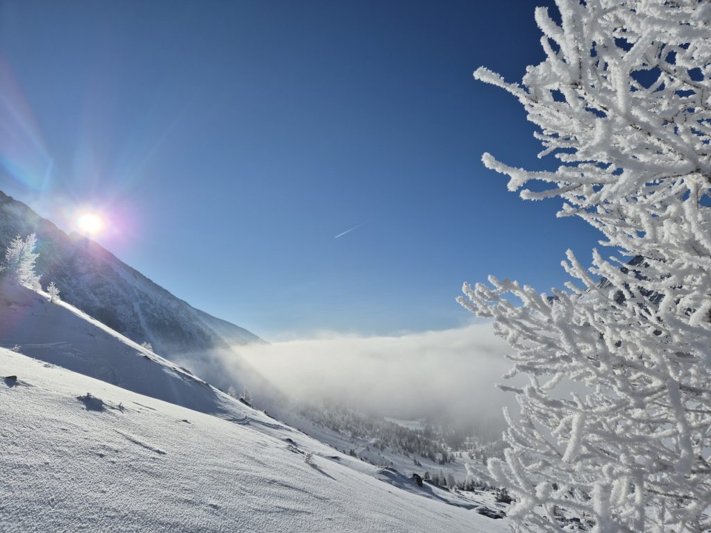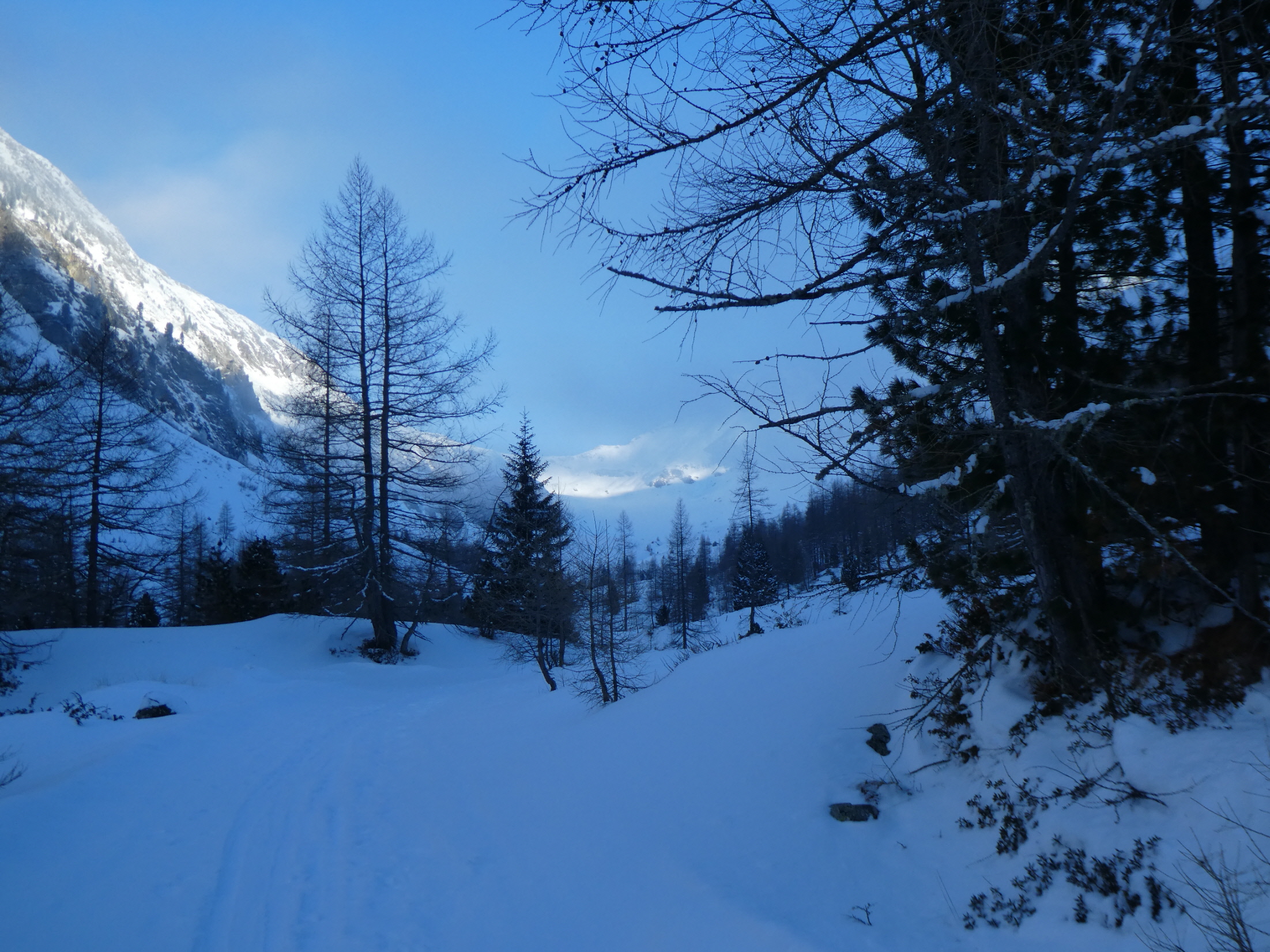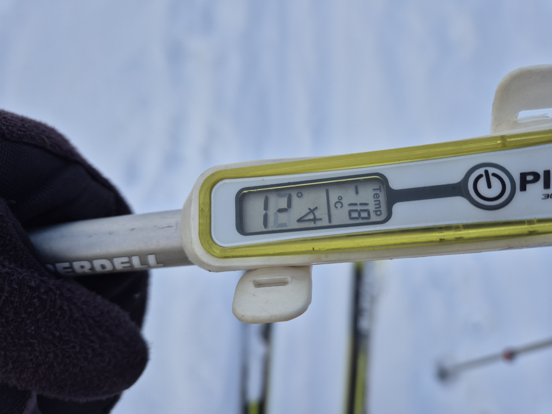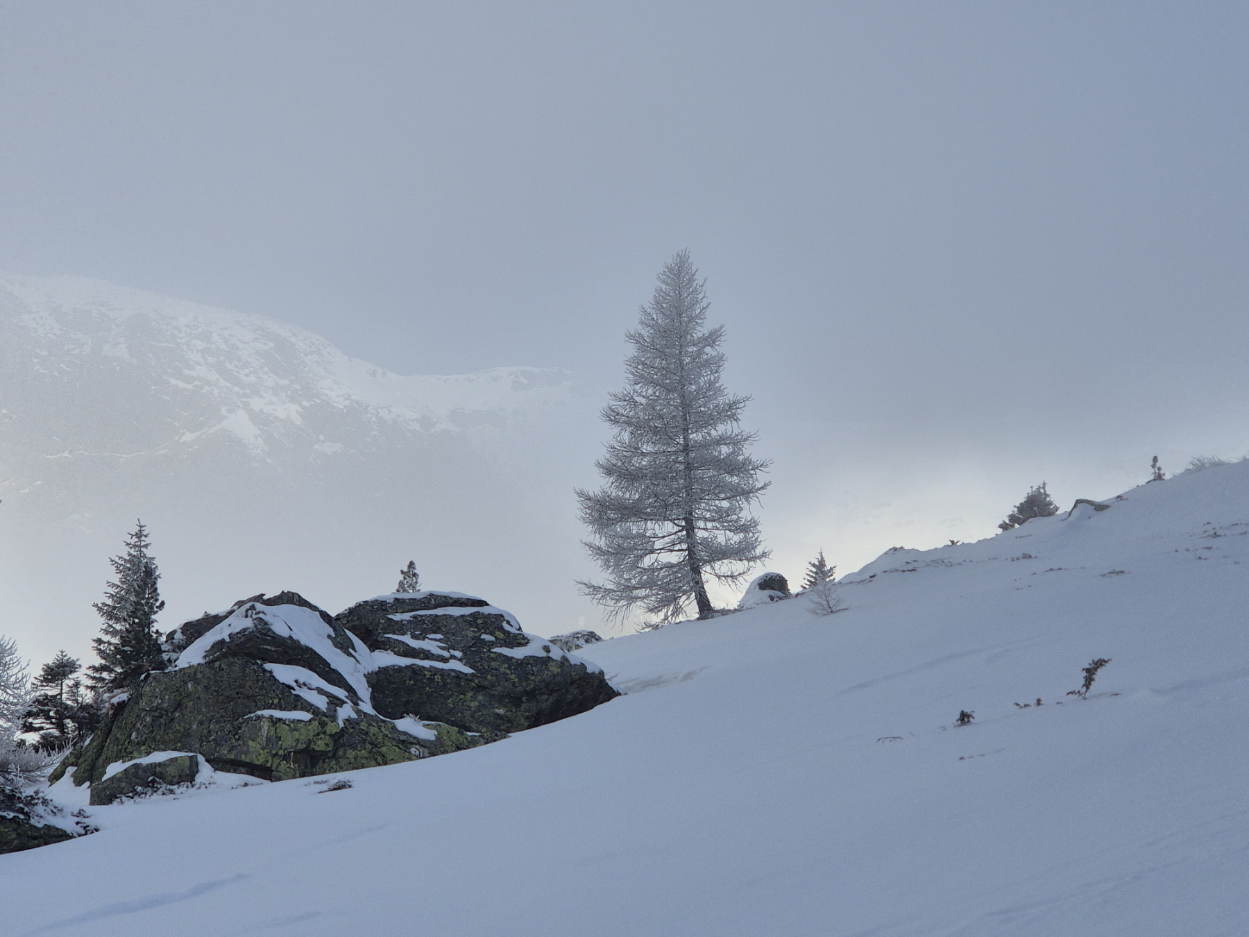 Vorbei an den vielen Almhütten danach bin ich entlang des Weges angestiegen. Bei der letzten Wegkehre bin ich in der direkten Linie hinauf zum Rantensee weitergegangen. Während es beim Tourenstart mit minus 10 Grad noch vergleichsweise „warm“ war, habe ich dort minus 19 Grad gemessen. Da habe ich kurzzeitig überlegt, das Daunengilet aus dem Rucksack zu holen und mir noch überzuziehen.