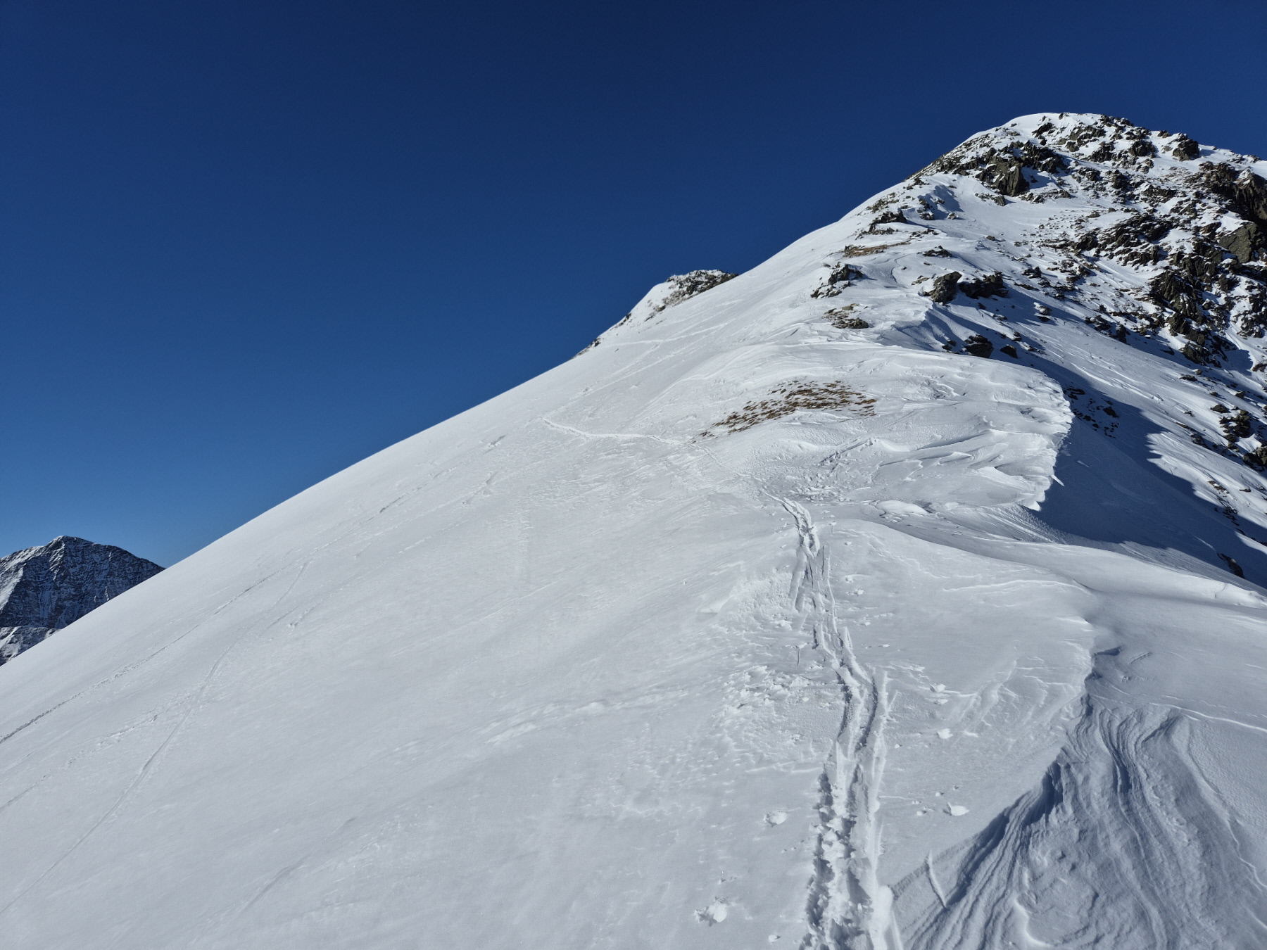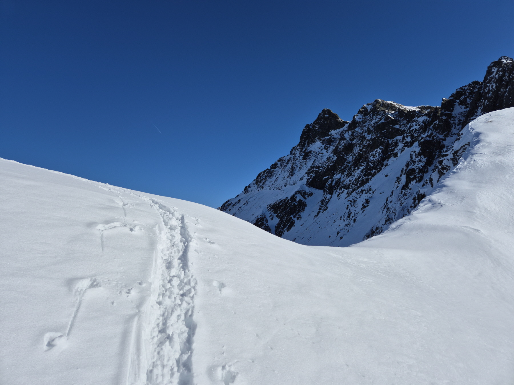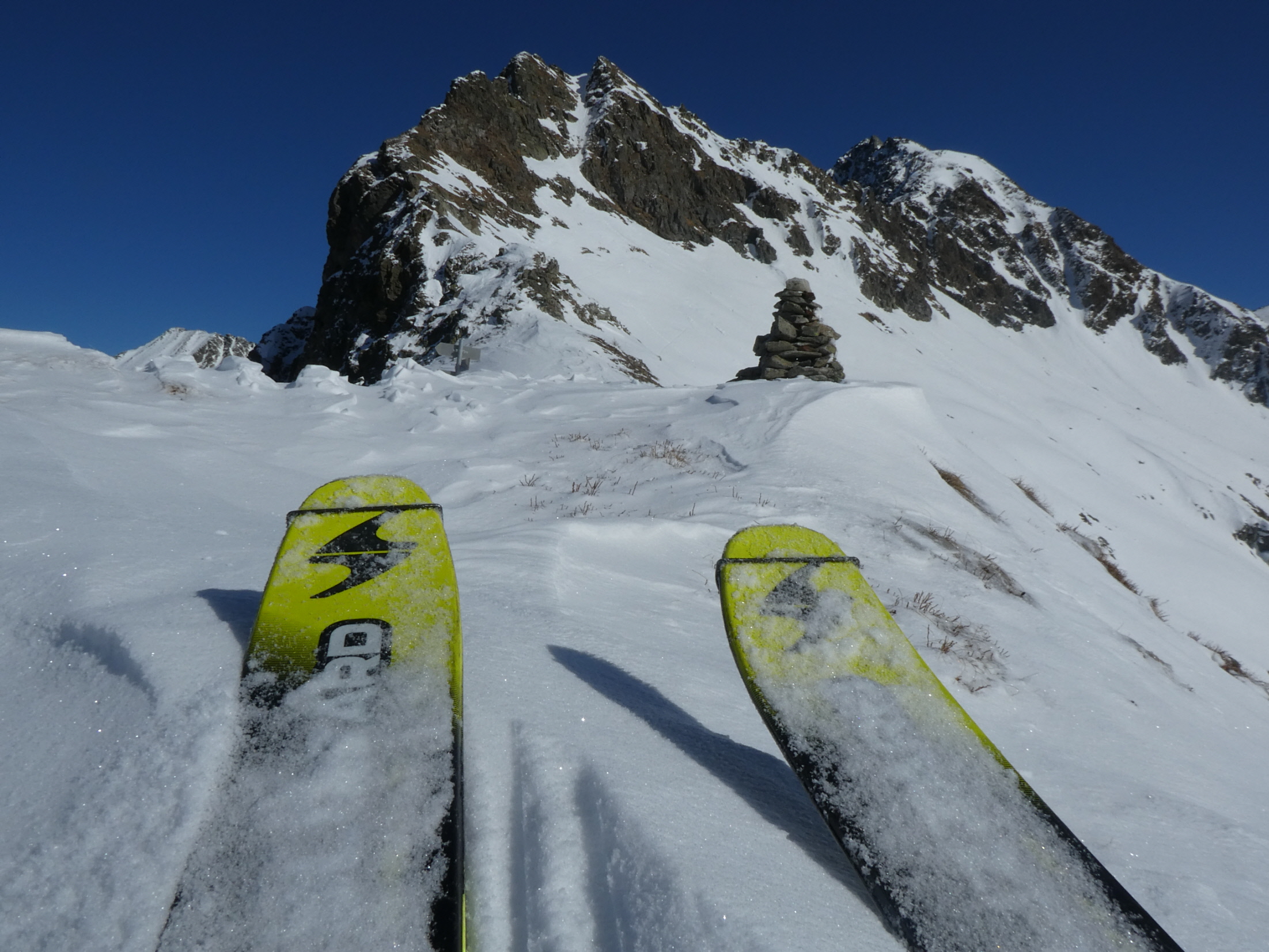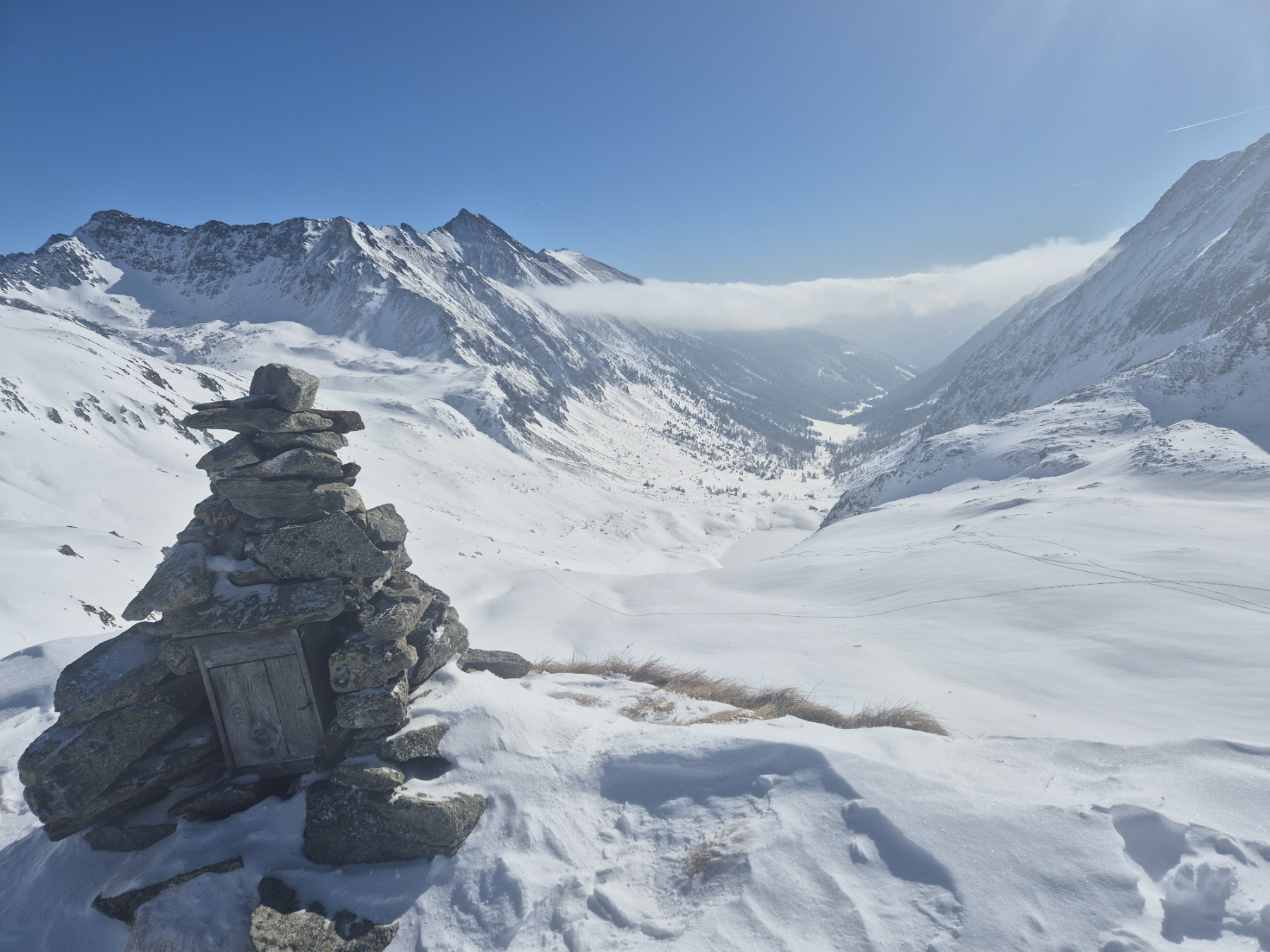 Einer bestehenden Spur folgend bin ich dann bis auf die Toreben angestiegen. Dort habe ich die Spur, die in Richtung Knarrenspitze links abgebogen ist, verlassen und bin geradeaus weiter auf das Rantentörl aufgestiegen. Ich habe abgefellt, gegessen und – wieder – getrunken 😊. Das war dann aber auch der Rest vom Schützenfest. Mit dem letzten Schluck aus der Thermoskanne habe ich auch den kurzzeitigen Plan, anschließend noch einen dritten Anstieg auf die Knarrenspitze draufzupacken, verworfen.