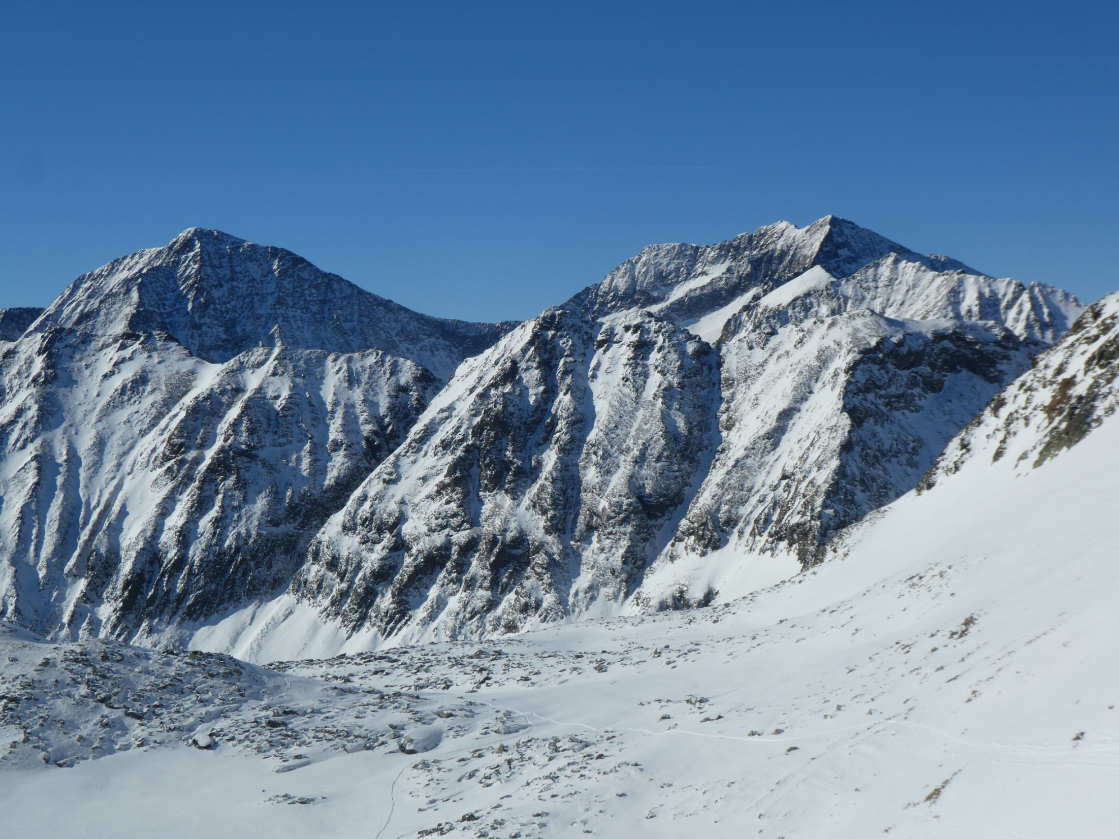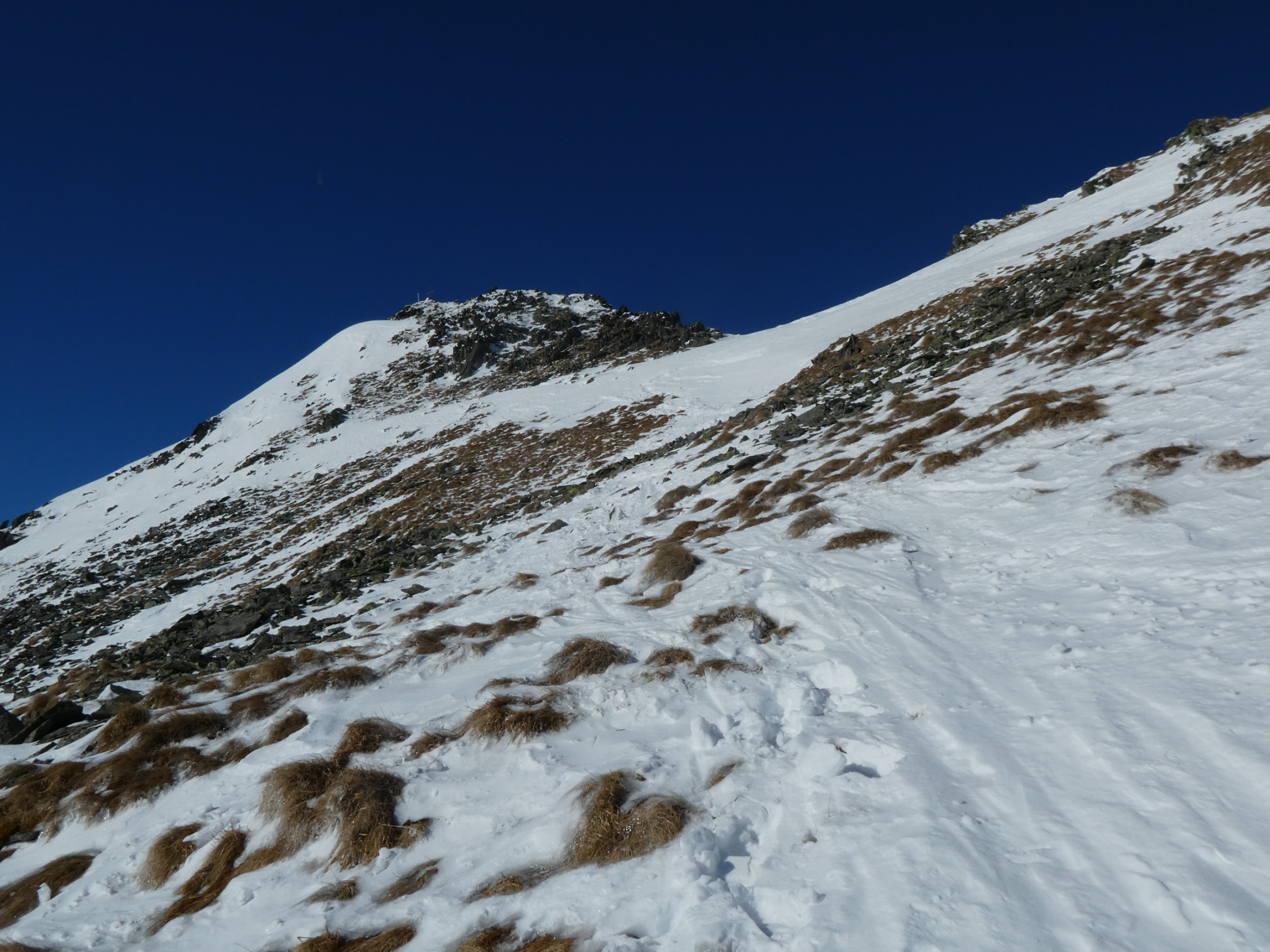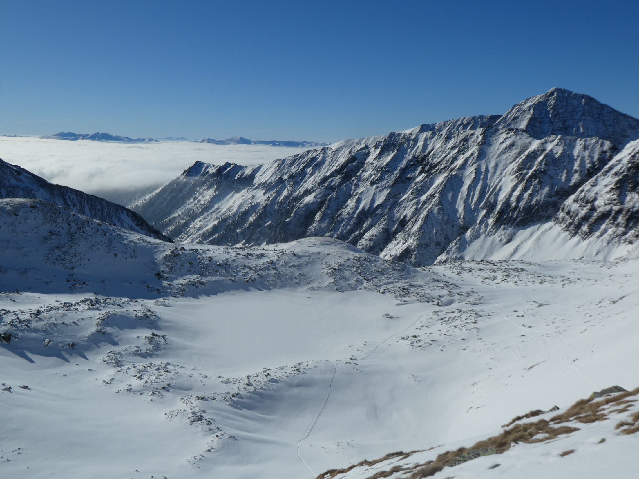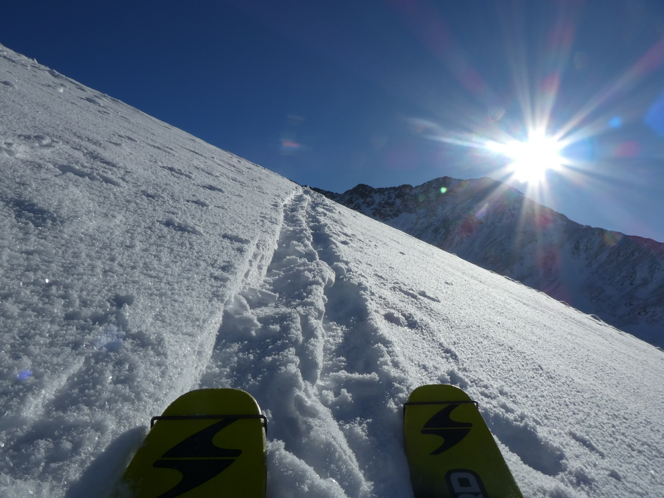 Einer bestehenden Spur folgend bin ich dann bis auf die Toreben angestiegen. Dort habe ich die Spur, die in Richtung Knarrenspitze links abgebogen ist, verlassen und bin geradeaus weiter auf das Rantentörl aufgestiegen. Ich habe abgefellt, gegessen und – wieder – getrunken 😊. Das war dann aber auch der Rest vom Schützenfest. Mit dem letzten Schluck aus der Thermoskanne habe ich auch den kurzzeitigen Plan, anschließend noch einen dritten Anstieg auf die Knarrenspitze draufzupacken, verworfen.