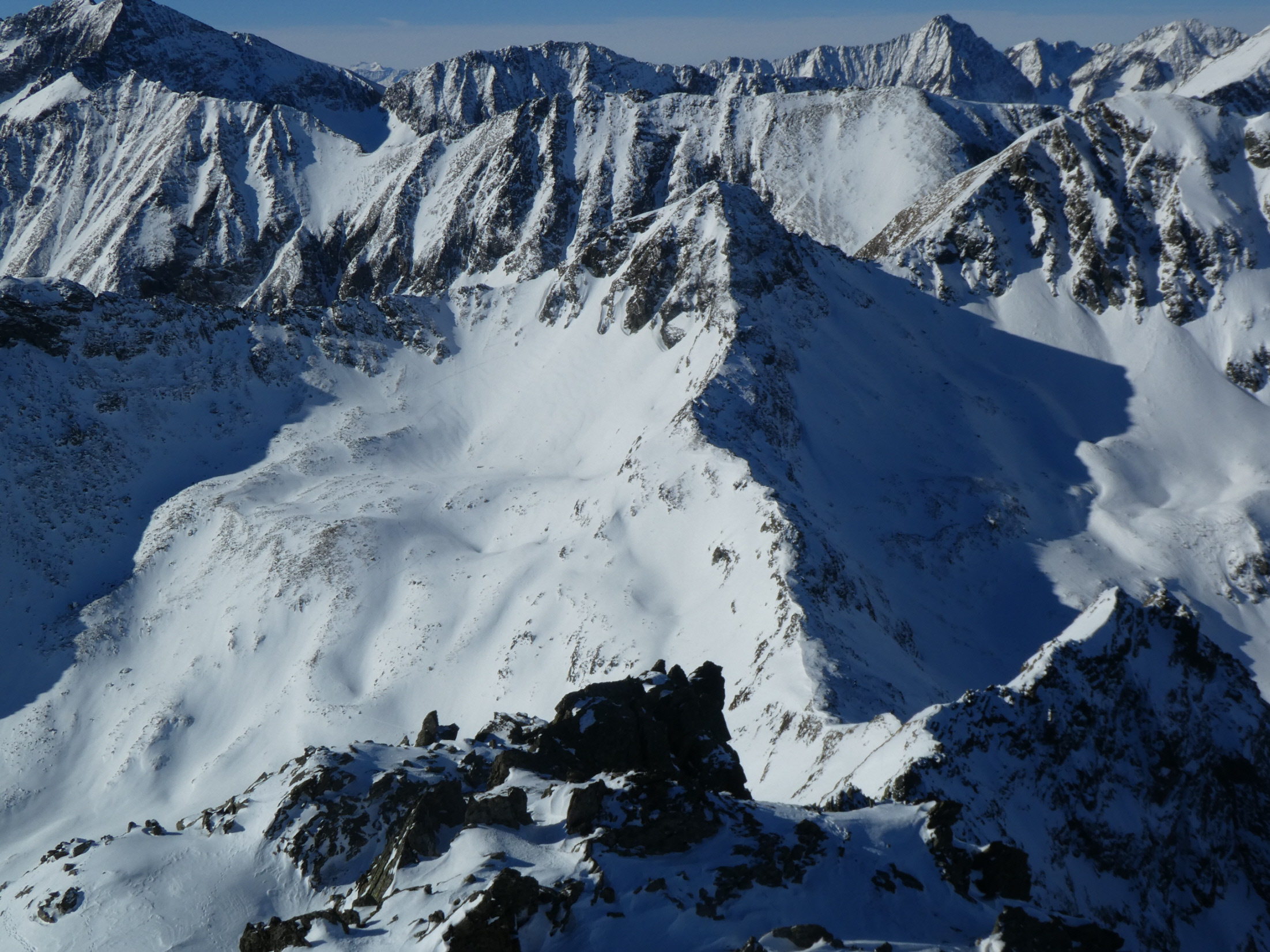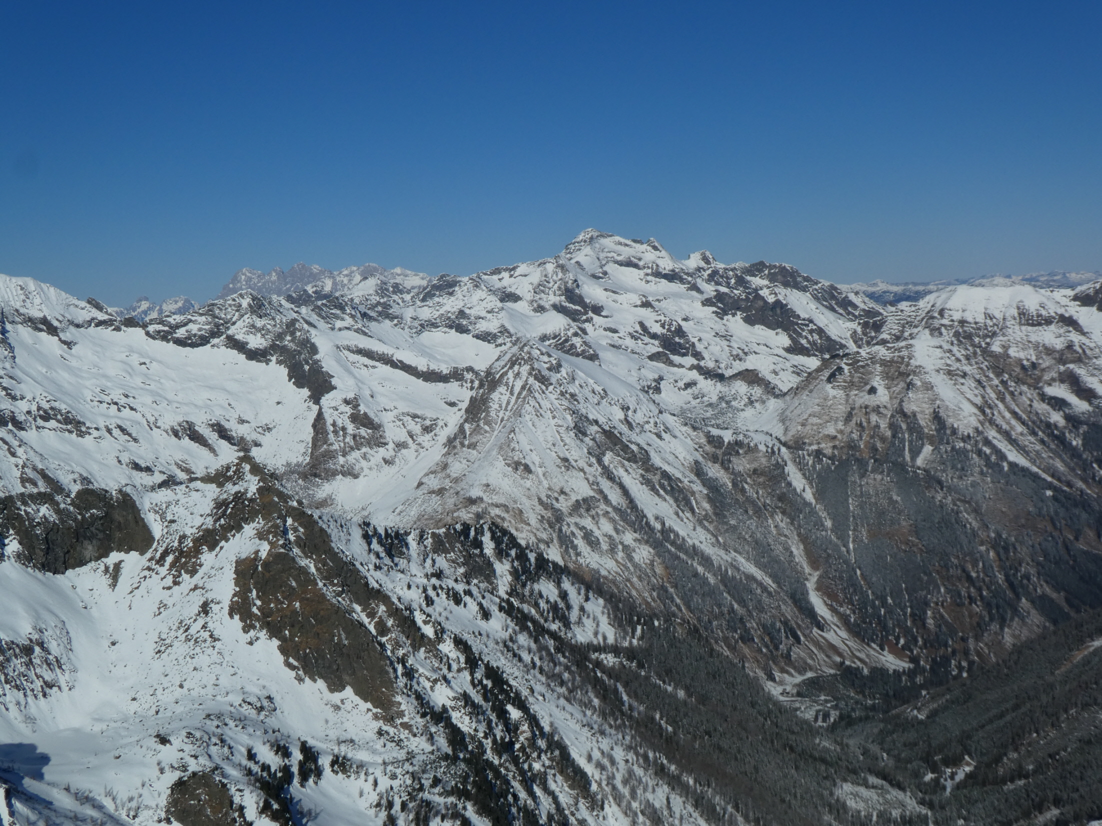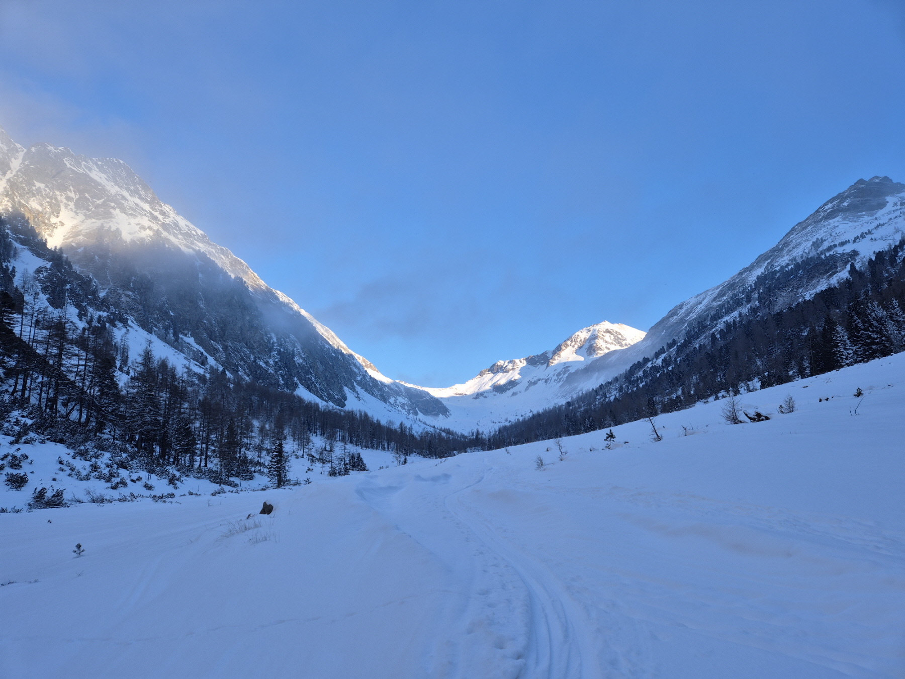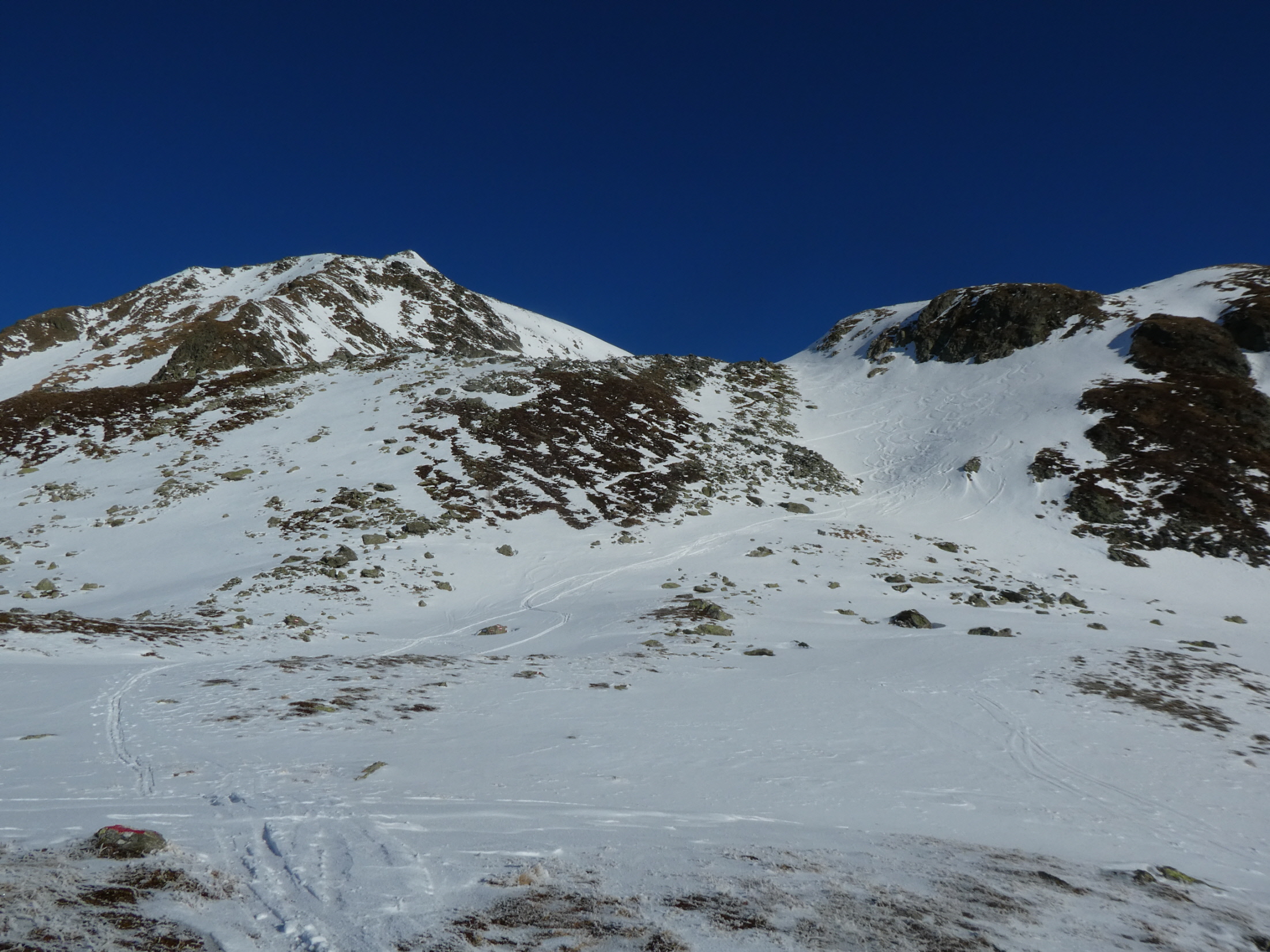 Einer bestehenden Spur folgend bin ich dann bis auf die Toreben angestiegen. Dort habe ich die Spur, die in Richtung Knarrenspitze links abgebogen ist, verlassen und bin geradeaus weiter auf das Rantentörl aufgestiegen. Ich habe abgefellt, gegessen und – wieder – getrunken 😊. Das war dann aber auch der Rest vom Schützenfest. Mit dem letzten Schluck aus der Thermoskanne habe ich auch den kurzzeitigen Plan, anschließend noch einen dritten Anstieg auf die Knarrenspitze draufzupacken, verworfen.