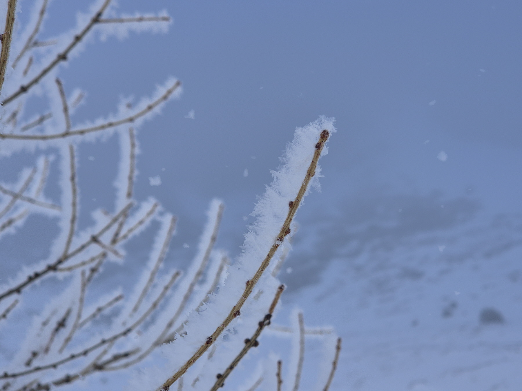 Im Anstieg hinauf ins Hinterkar, vorbei an herrlichen Raureifkunstwerken bin ich aber endlich unter der Hochnebeldecke heraus in die Sonne gekommen. Schlagartig ist mir durch die Strahlungswärme und die flotte Bewegung jetzt warm geworden. Obwohl wir am Vorabend sehr ausgiebig mit vergorenem Rebensaft vorhydriert hatten – oder vielleicht gerade deshalb 😉 – ist der Durst mit zunehmender Temperatur gestiegen. Entsprechend viel habe ich beim weiteren Anstieg hinauf ins Wiegenkar und nach dessen Durchquerung hinauf zum Wiegentörl schon getrunken.