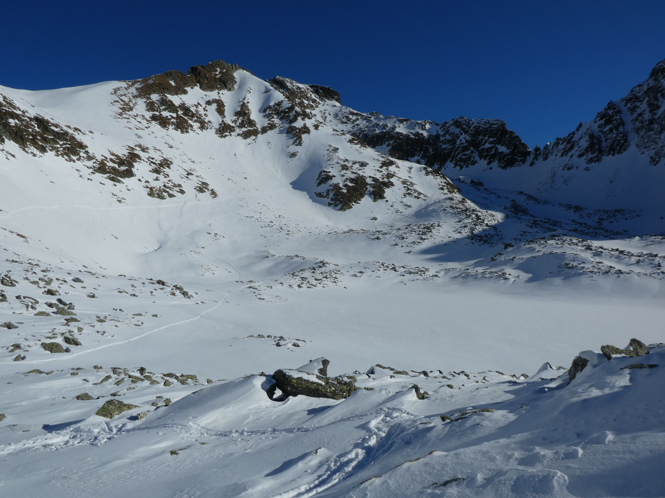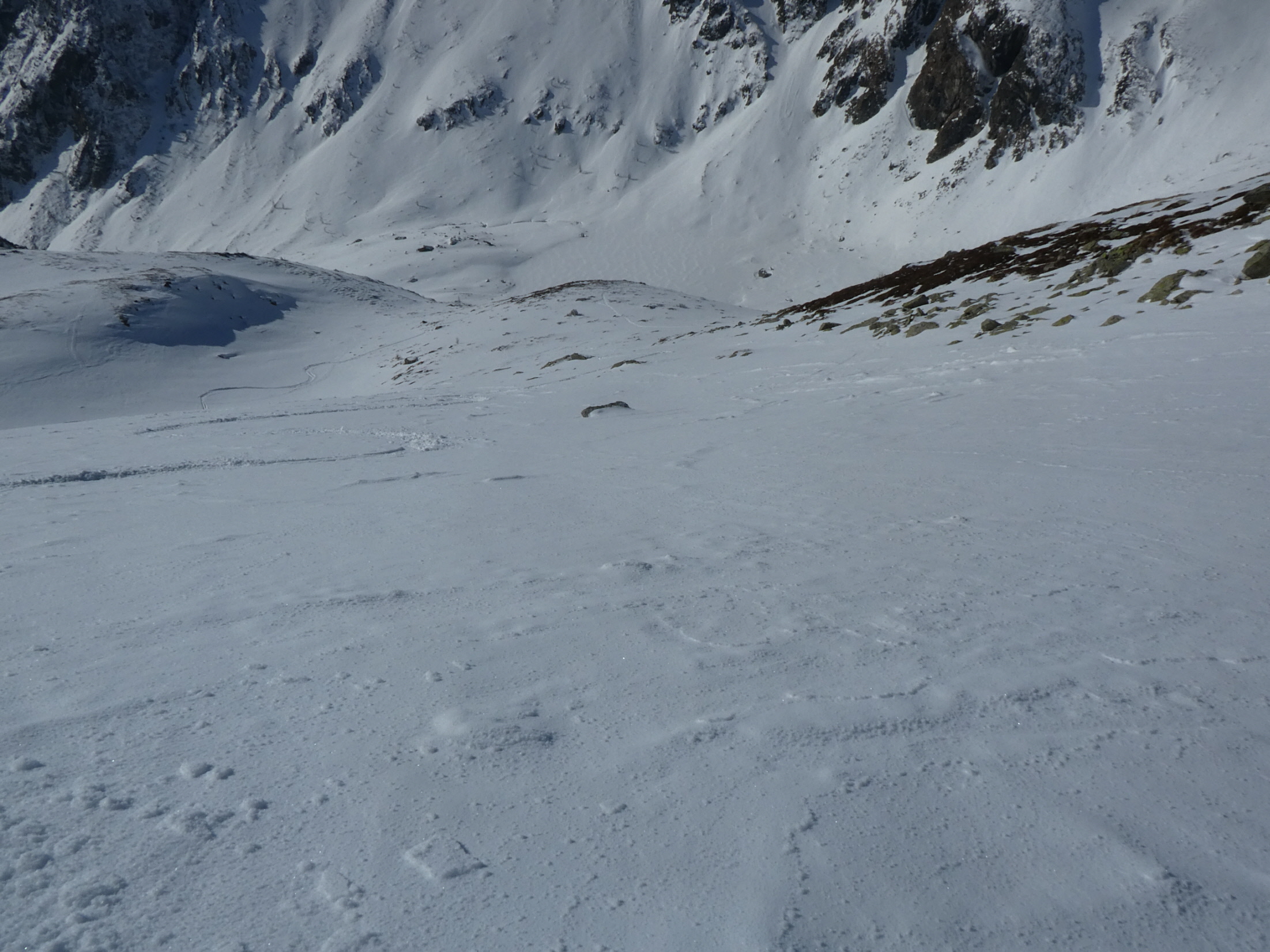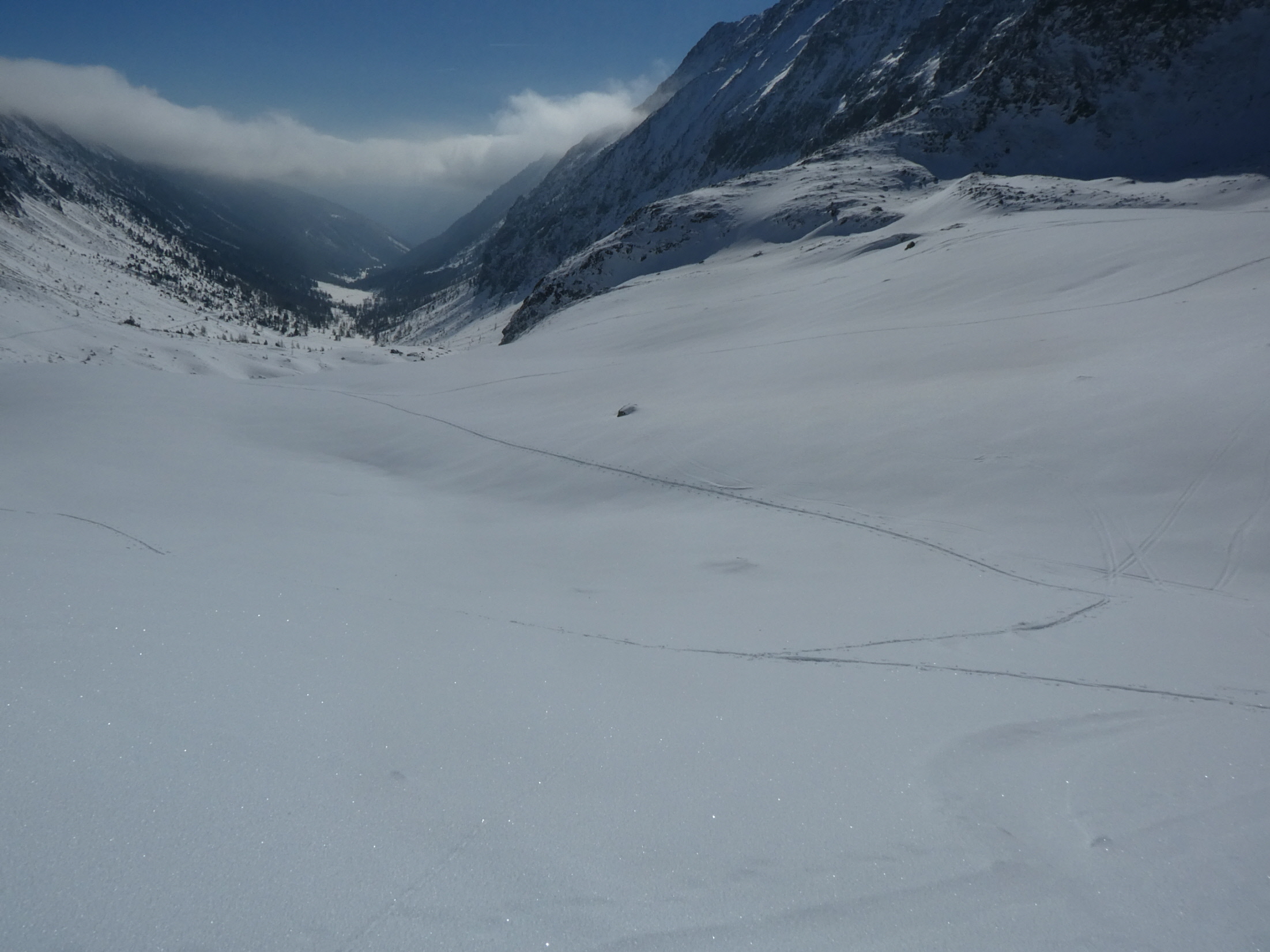 Sehr genussvoll war ich bald wieder im Wiegenkar. Mit einer langen Schrägfahrt bin ich noch bis an den Eingang des Kars gequert, habe dort eine kurze Gegensteigung hinauf gestaffelt und bin danach ins Hinterkar abgefahren. Von da ging es dann, Rinnen und Mulden, in denen die Schneeauflage jedenfalls dicker ist, nutzend weiter hinunter zum Rantensee. Knapp oberhalb vom zugefrorenen See habe ich dann abgeschwungen und wieder aufgefellt.