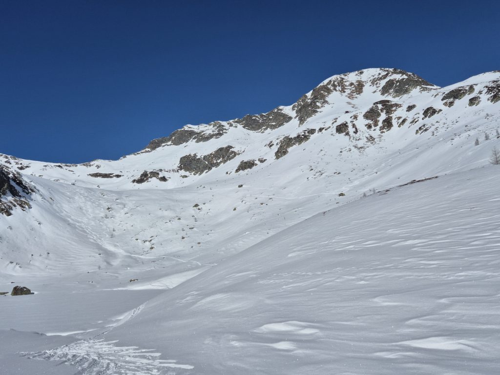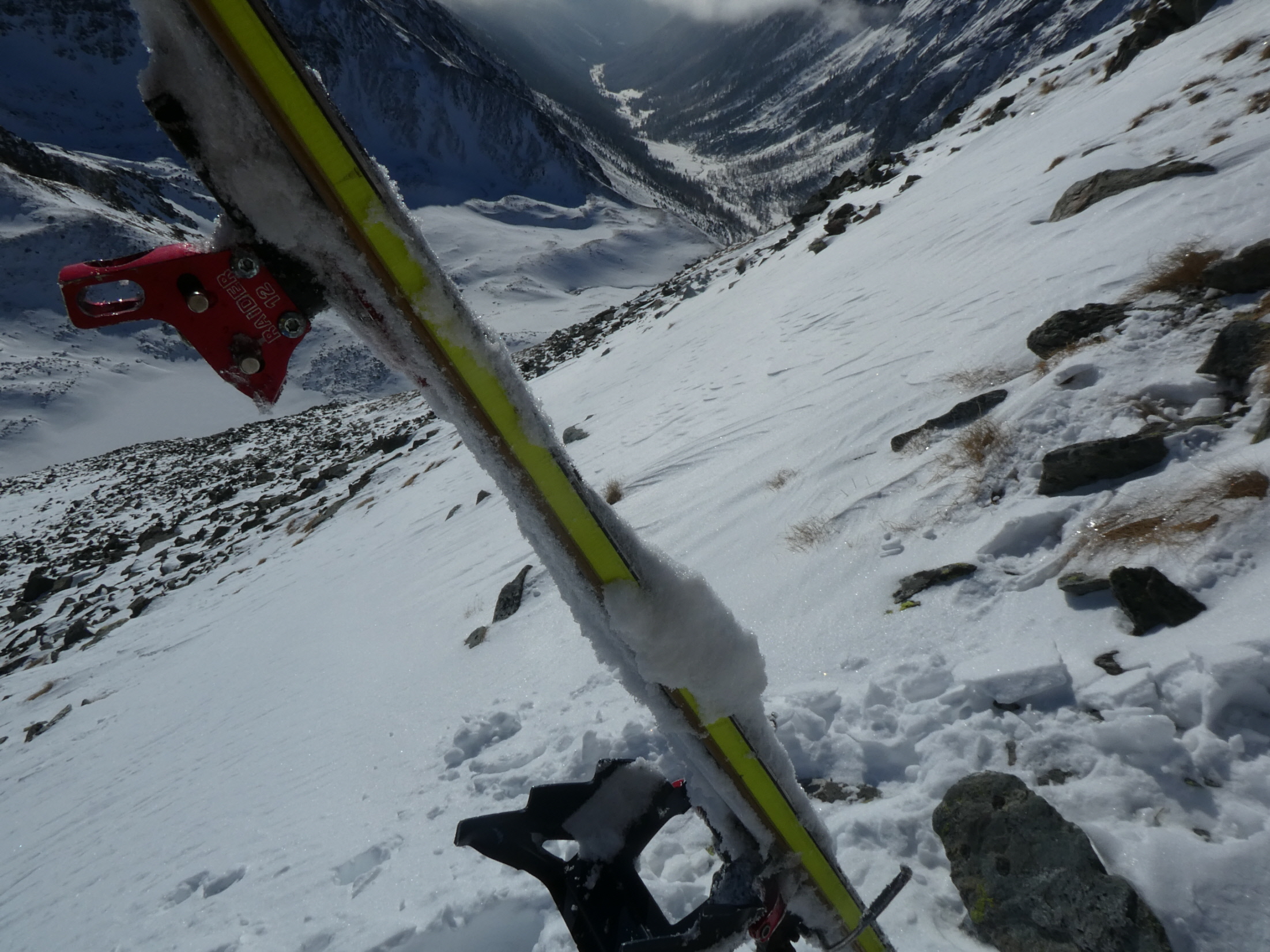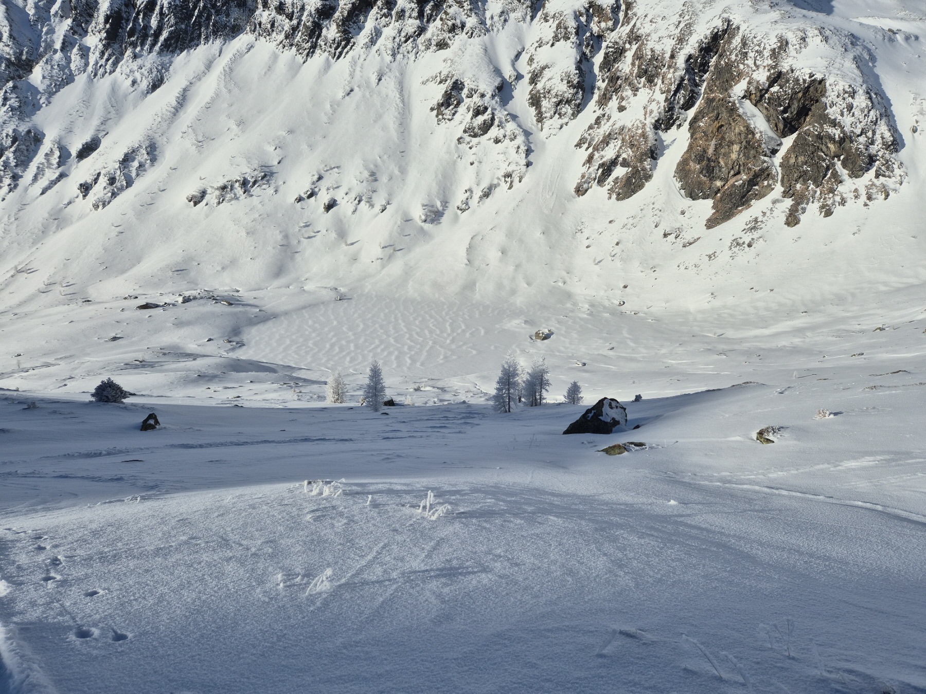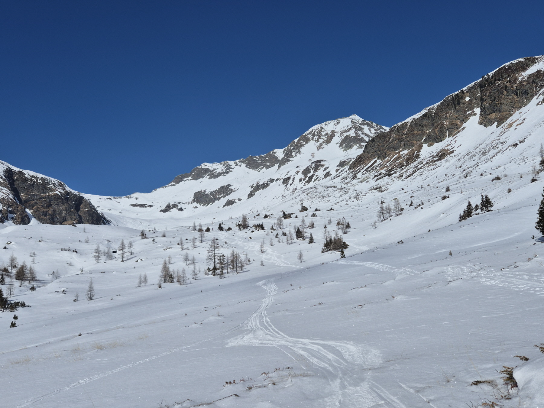 Sehr genussvoll war ich bald wieder im Wiegenkar. Mit einer langen Schrägfahrt bin ich noch bis an den Eingang des Kars gequert, habe dort eine kurze Gegensteigung hinauf gestaffelt und bin danach ins Hinterkar abgefahren. Von da ging es dann, Rinnen und Mulden, in denen die Schneeauflage jedenfalls dicker ist, nutzend weiter hinunter zum Rantensee. Knapp oberhalb vom zugefrorenen See habe ich dann abgeschwungen und wieder aufgefellt.