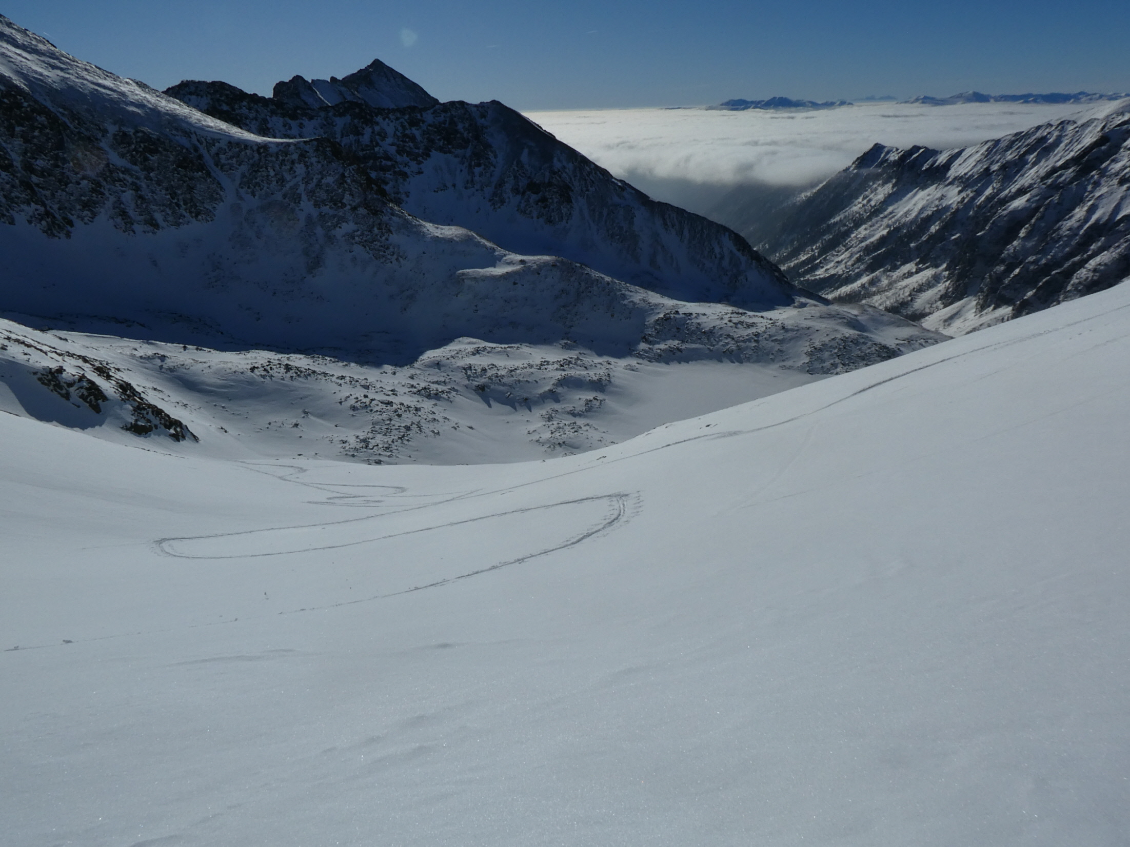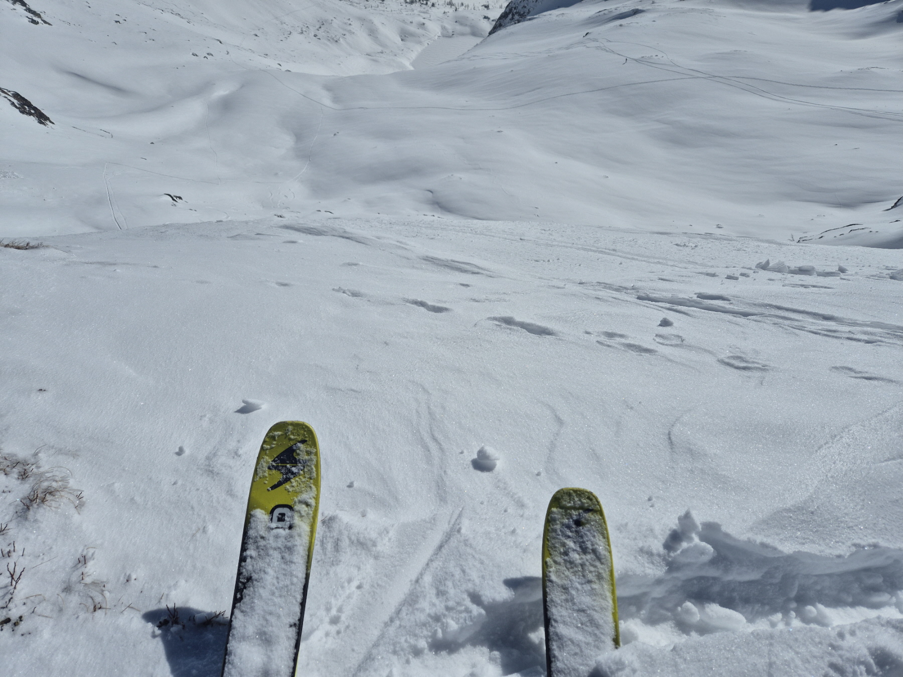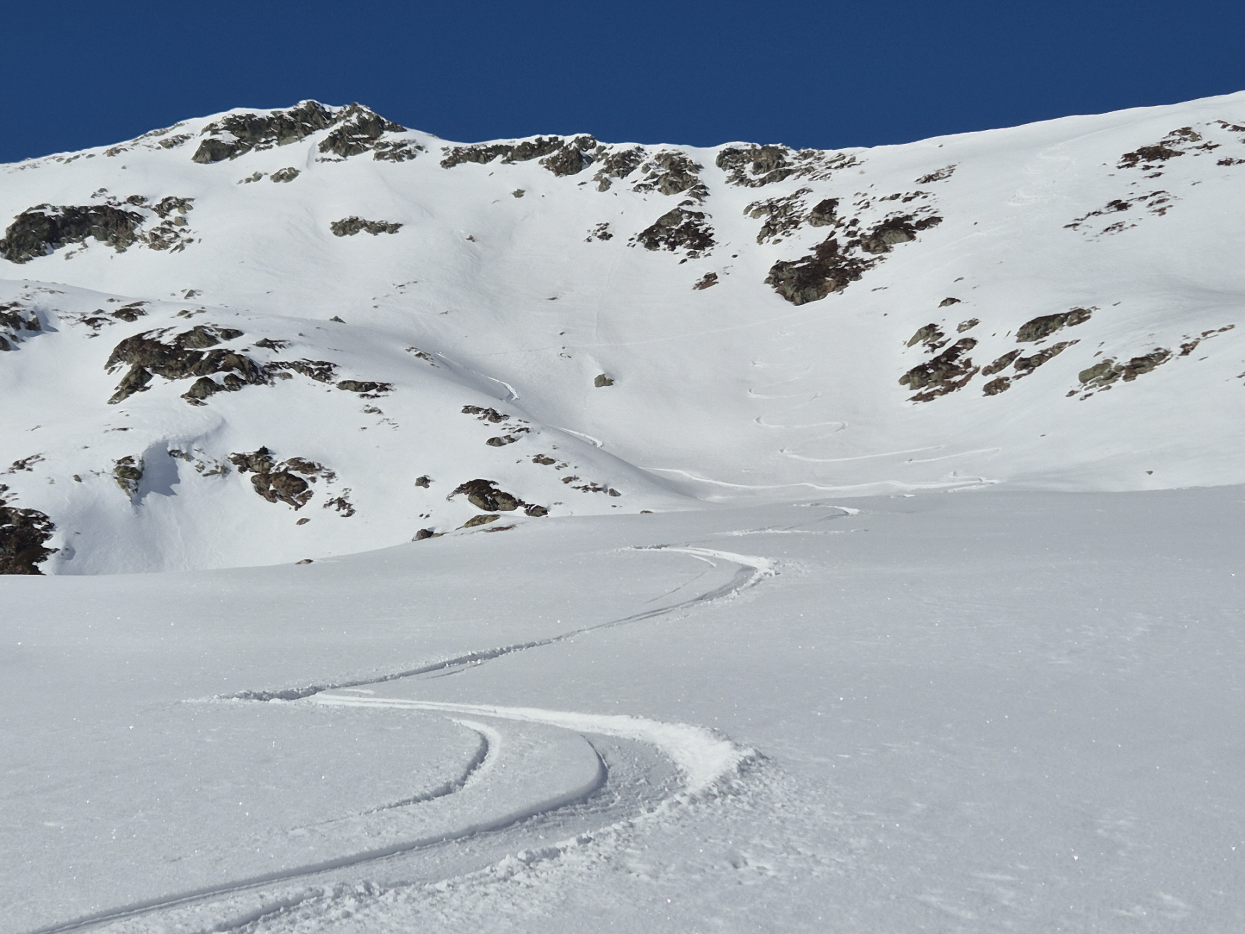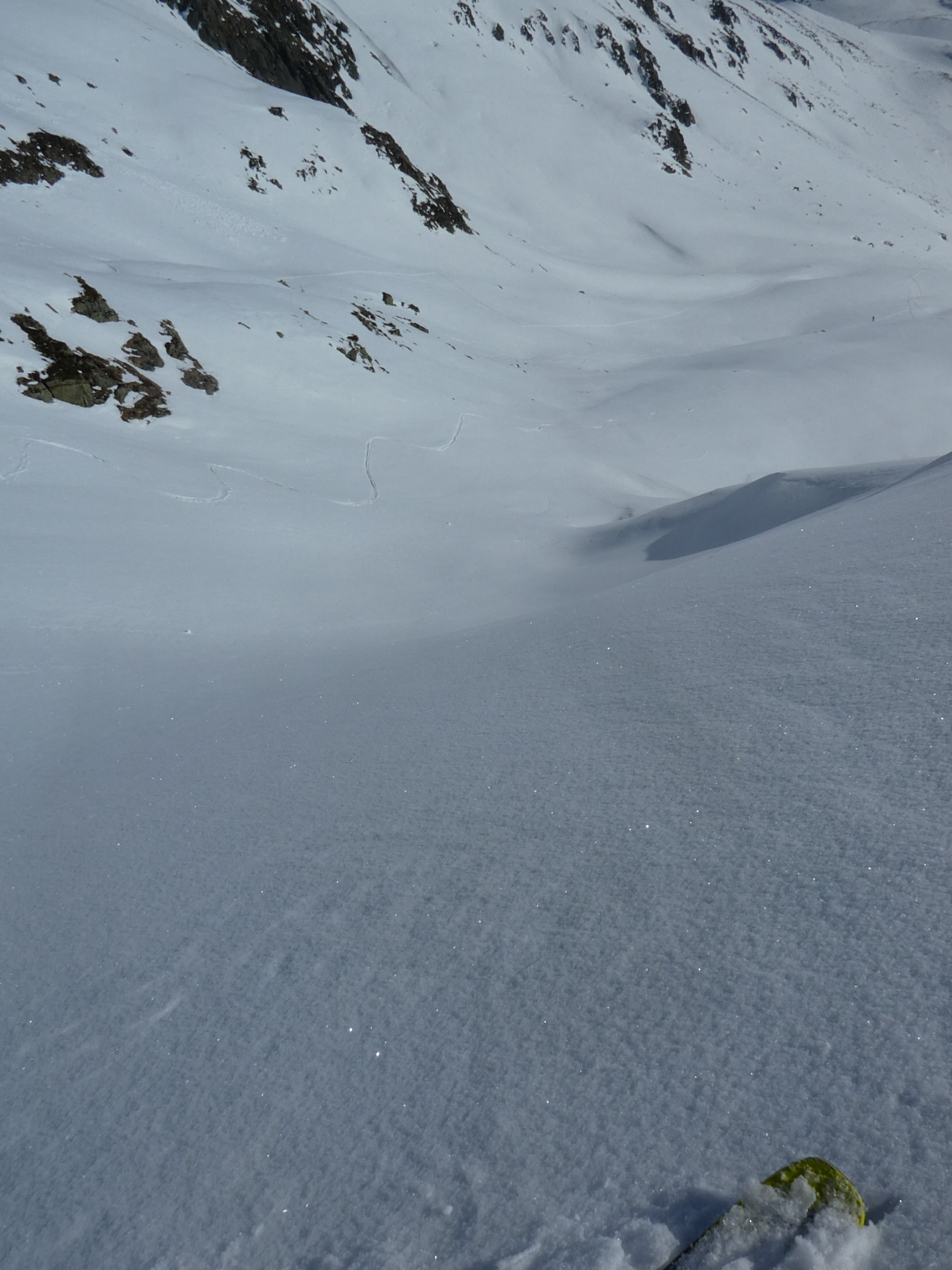Nach dem Umrüsten auf den Abfahrtsmodus bin ich zuerst die etwas steilere Flanke rechts vom Törl kurz in der Falllinie abgefahren und dann bei erstbester Gelegenheit nach rechts ausgequert. Die Schrägfahrt habe ich dann in einer ostseitig ausgerichteten Steilmulde beendet. Dort hatte ich schon im Anstieg besonders gut aussehenden Schnee ausgemacht. Ich habe mich nicht getäuscht und bin von dort bis zur und dann weiter über die Toreben in flaumigem Pulverschnee abgefahren.