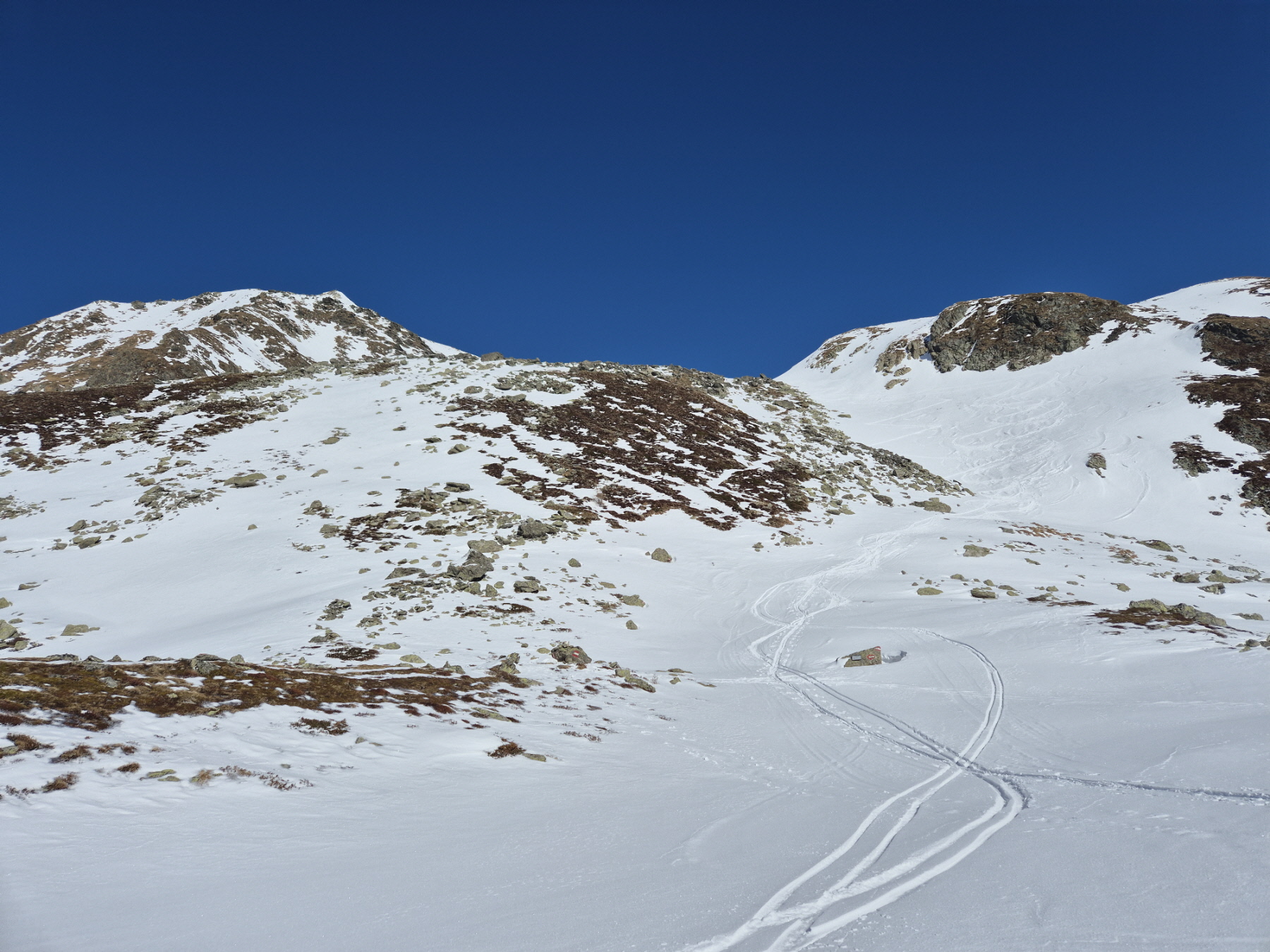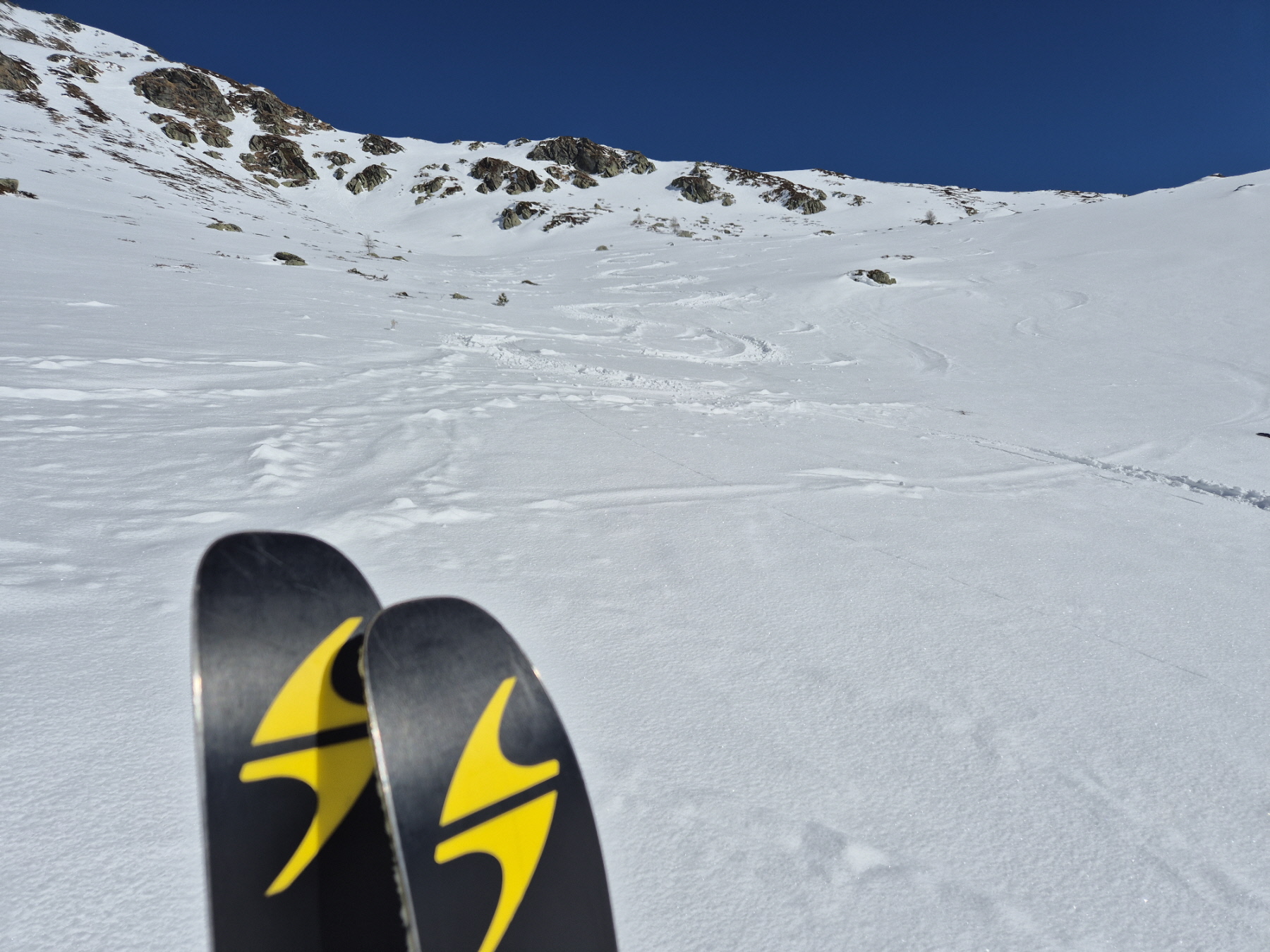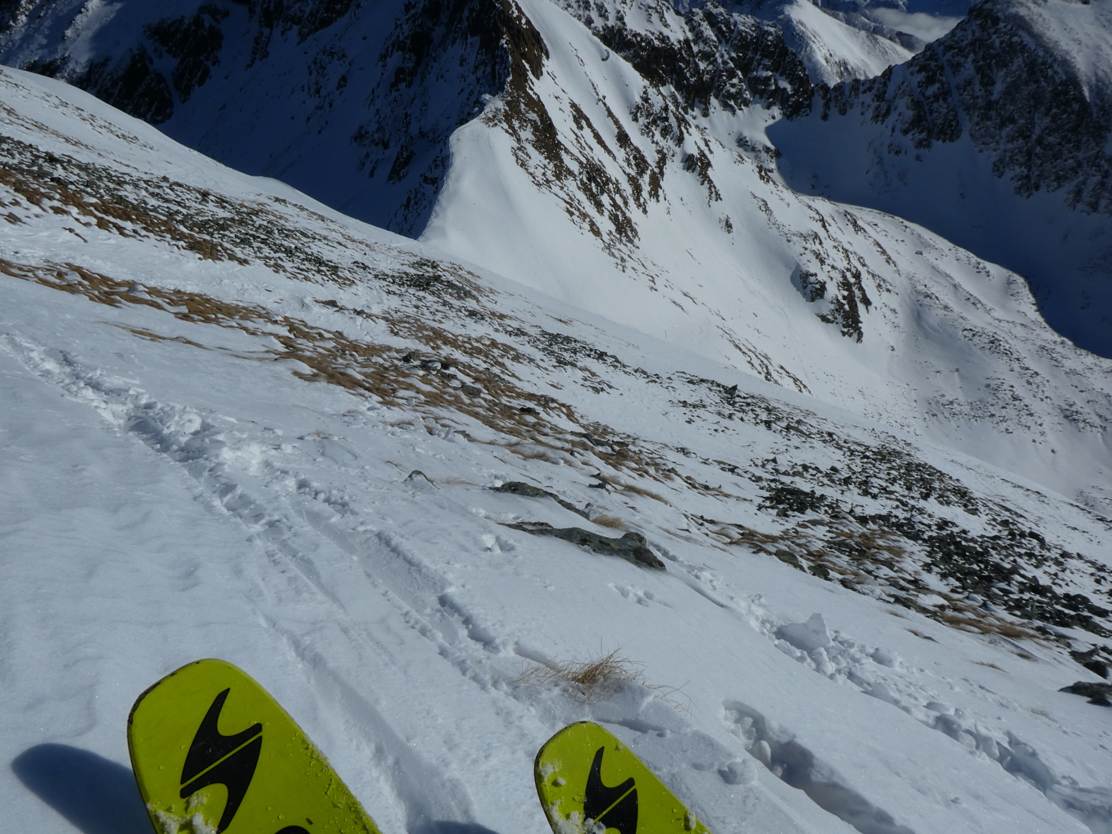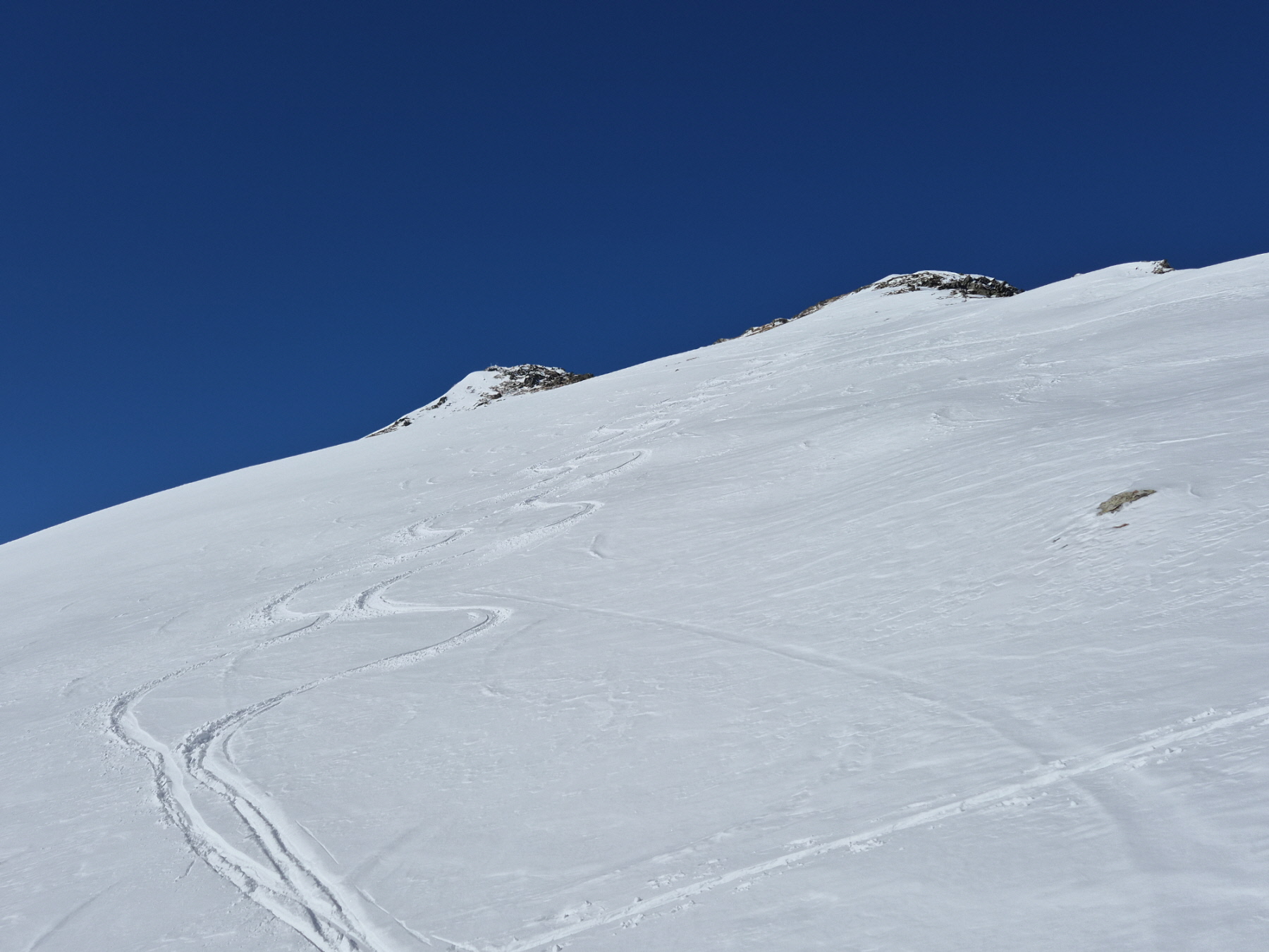 Nach dem Umrüsten auf den Abfahrtsmodus bin ich zuerst die etwas steilere Flanke rechts vom Törl kurz in der Falllinie abgefahren und dann bei erstbester Gelegenheit nach rechts ausgequert. Die Schrägfahrt habe ich dann in einer ostseitig ausgerichteten Steilmulde beendet. Dort hatte ich schon im Anstieg besonders gut aussehenden Schnee ausgemacht. Ich habe mich nicht getäuscht und bin von dort bis zur und dann weiter über die Toreben in flaumigem Pulverschnee abgefahren.