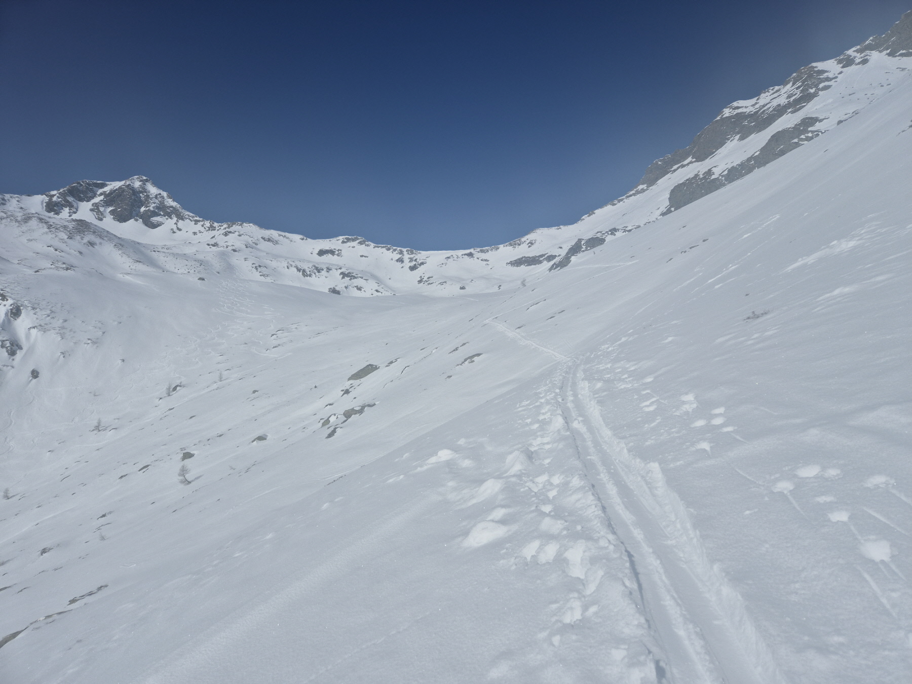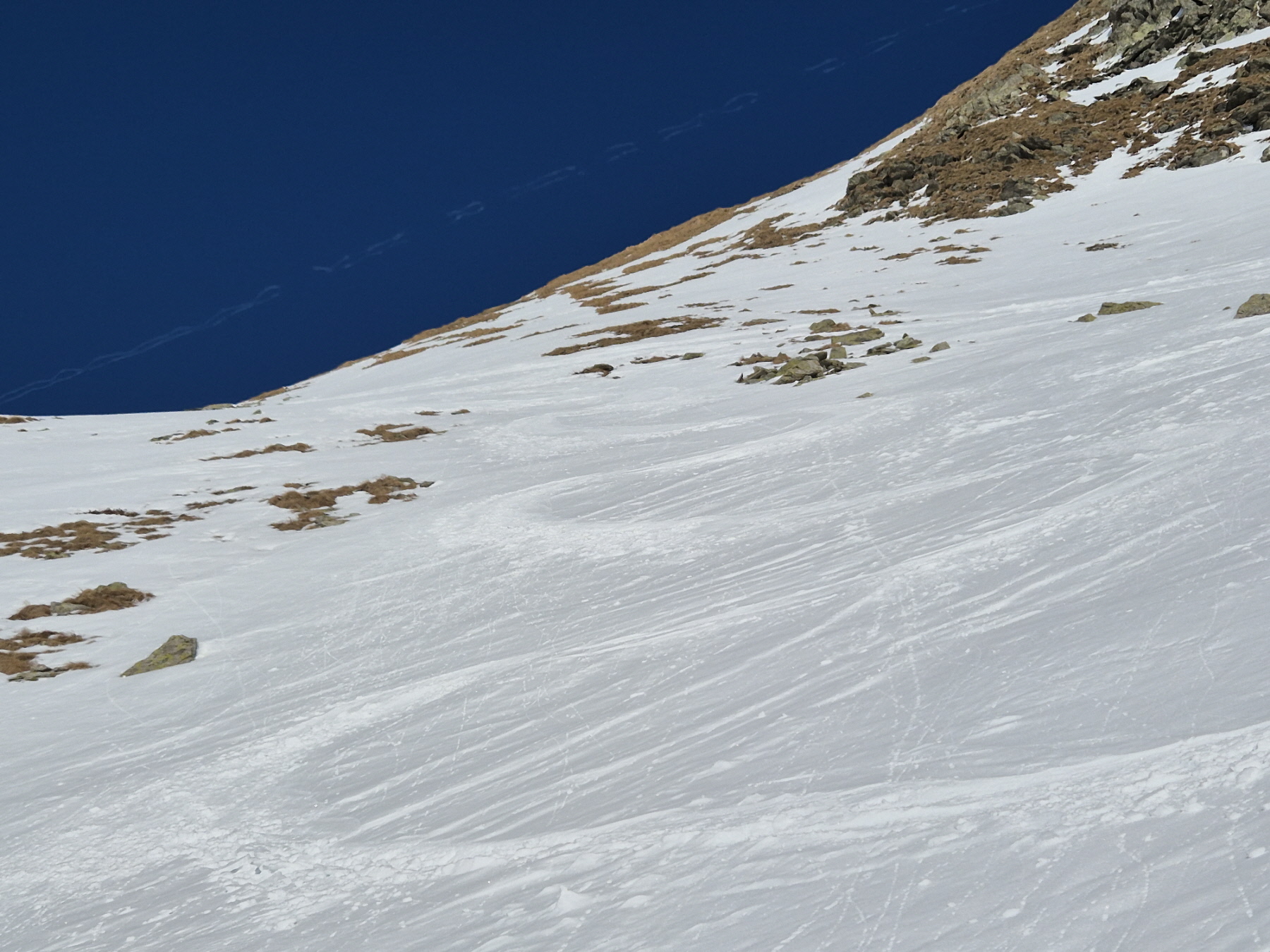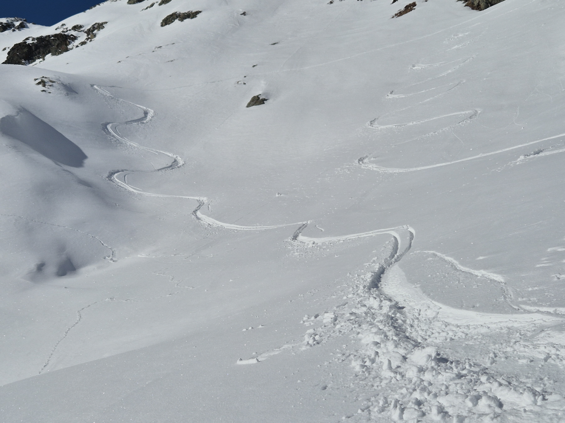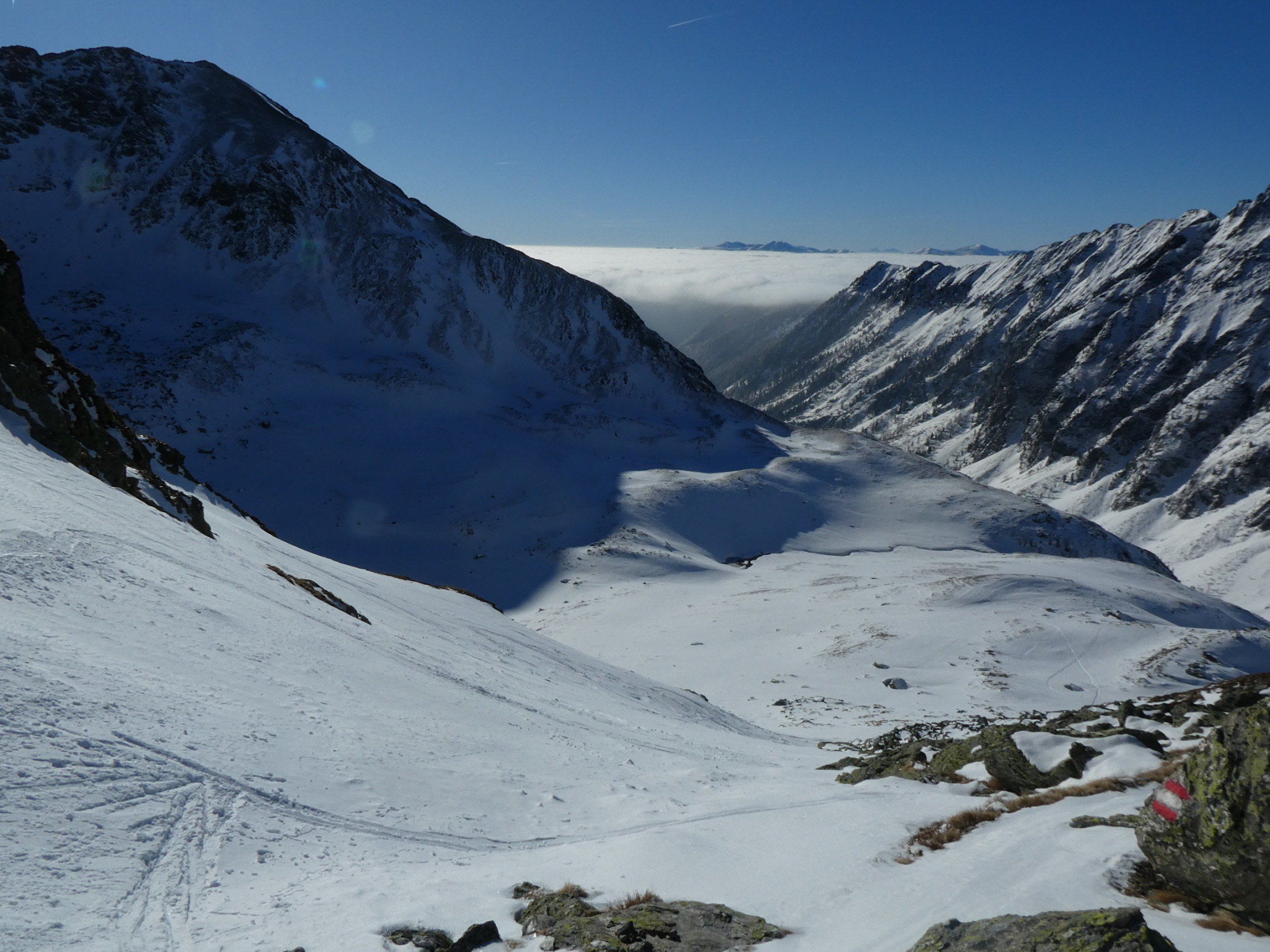 Nach dem Umrüsten auf den Abfahrtsmodus bin ich zuerst die etwas steilere Flanke rechts vom Törl kurz in der Falllinie abgefahren und dann bei erstbester Gelegenheit nach rechts ausgequert. Die Schrägfahrt habe ich dann in einer ostseitig ausgerichteten Steilmulde beendet. Dort hatte ich schon im Anstieg besonders gut aussehenden Schnee ausgemacht. Ich habe mich nicht getäuscht und bin von dort bis zur und dann weiter über die Toreben in flaumigem Pulverschnee abgefahren.
