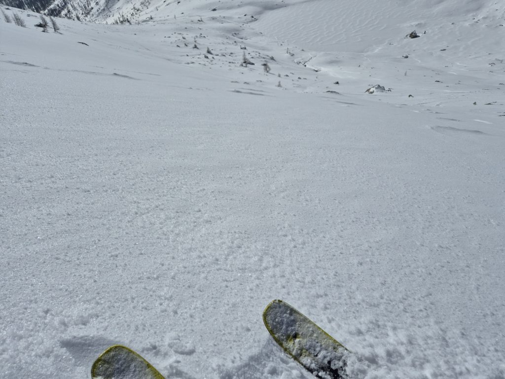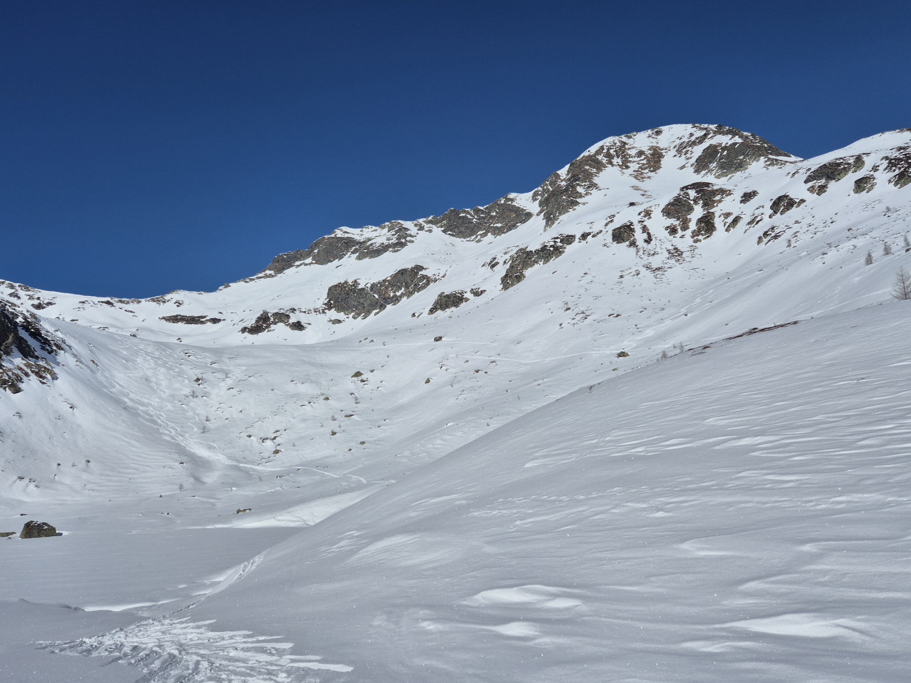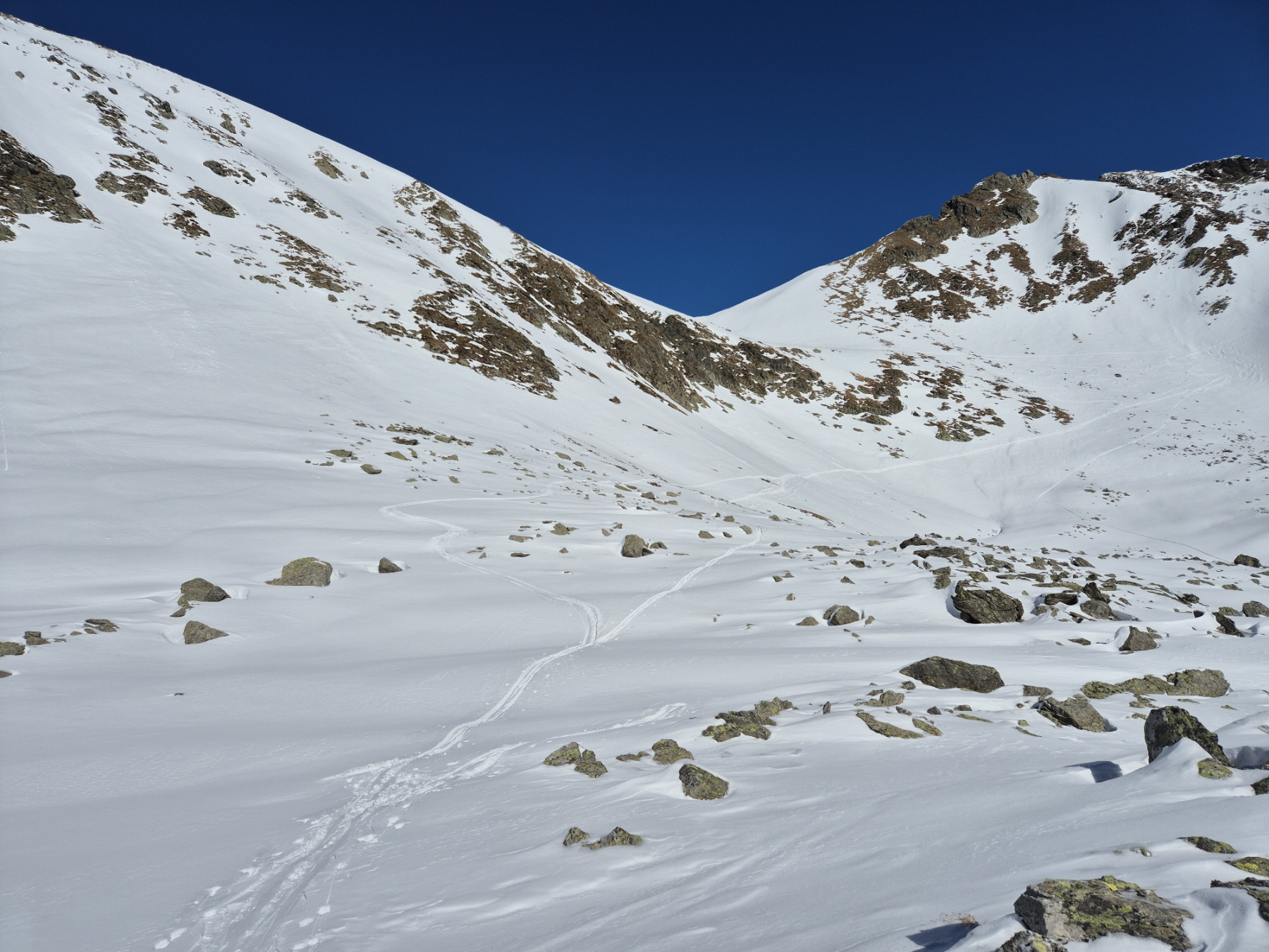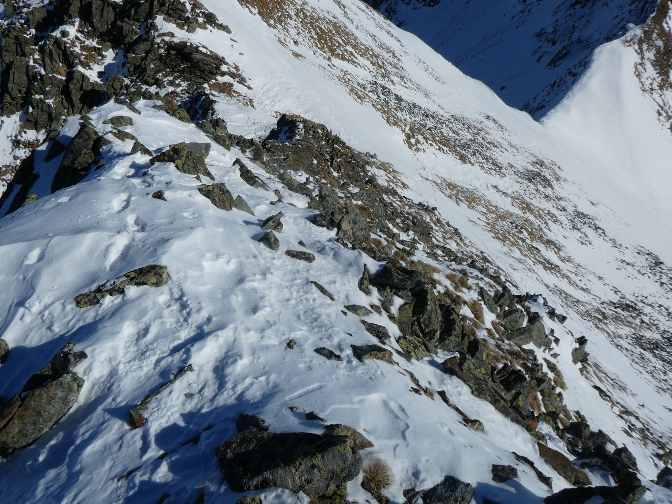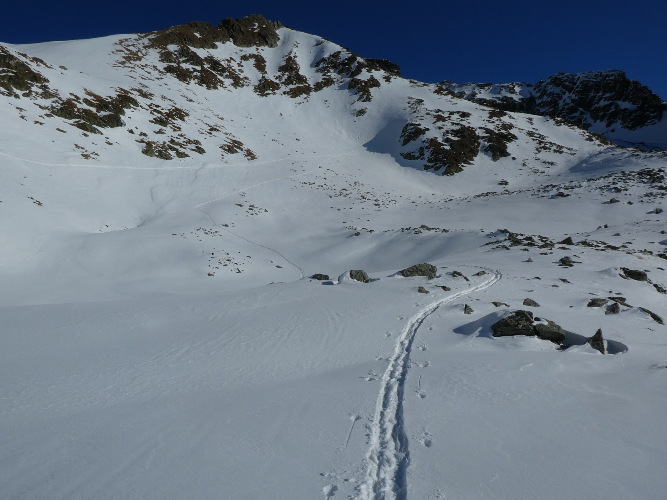 Nach dem Umrüsten auf den Abfahrtsmodus bin ich zuerst die etwas steilere Flanke rechts vom Törl kurz in der Falllinie abgefahren und dann bei erstbester Gelegenheit nach rechts ausgequert. Die Schrägfahrt habe ich dann in einer ostseitig ausgerichteten Steilmulde beendet. Dort hatte ich schon im Anstieg besonders gut aussehenden Schnee ausgemacht. Ich habe mich nicht getäuscht und bin von dort bis zur und dann weiter über die Toreben in flaumigem Pulverschnee abgefahren.