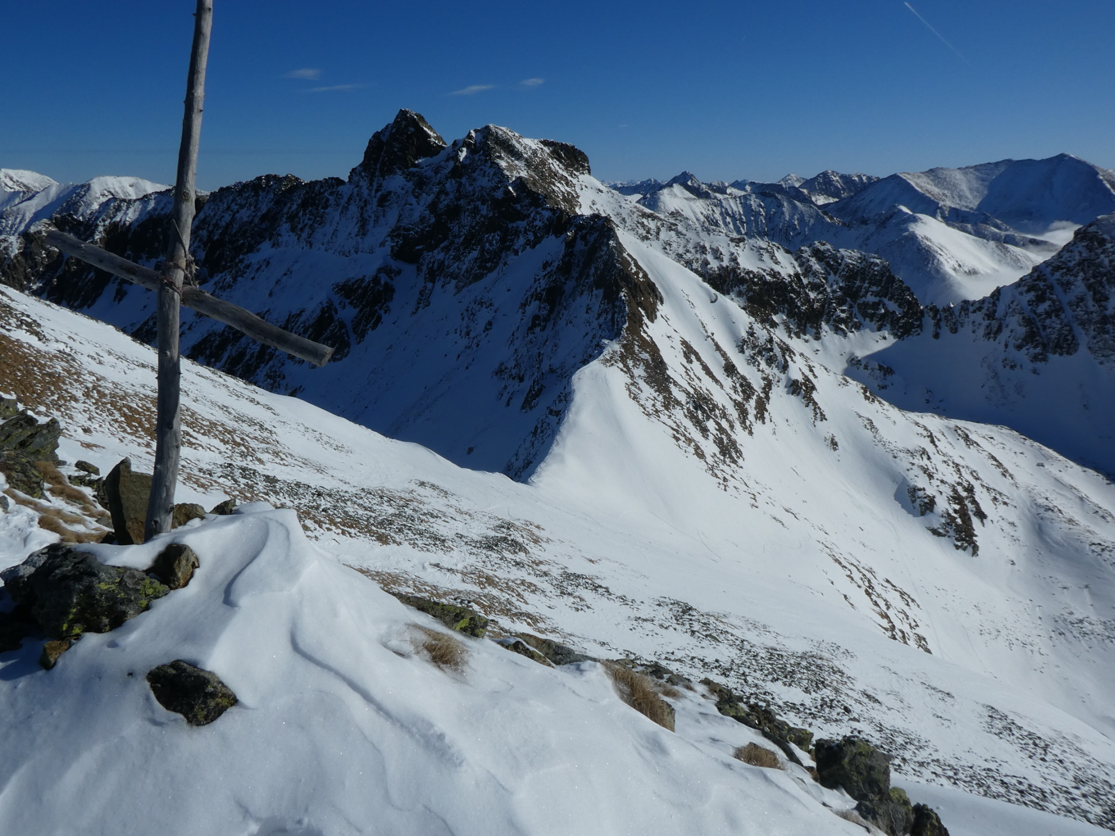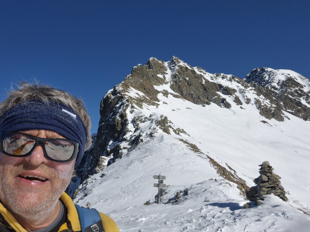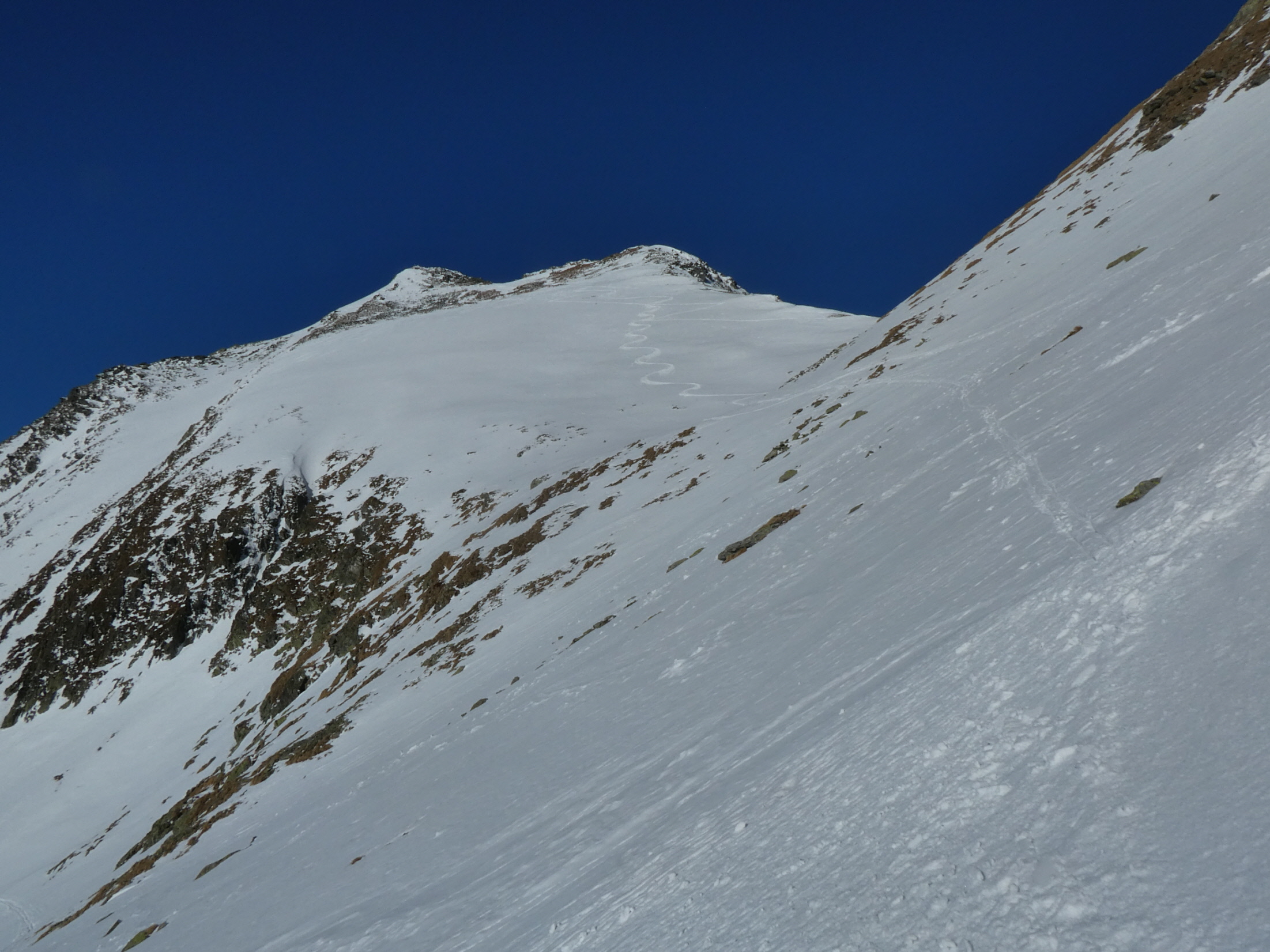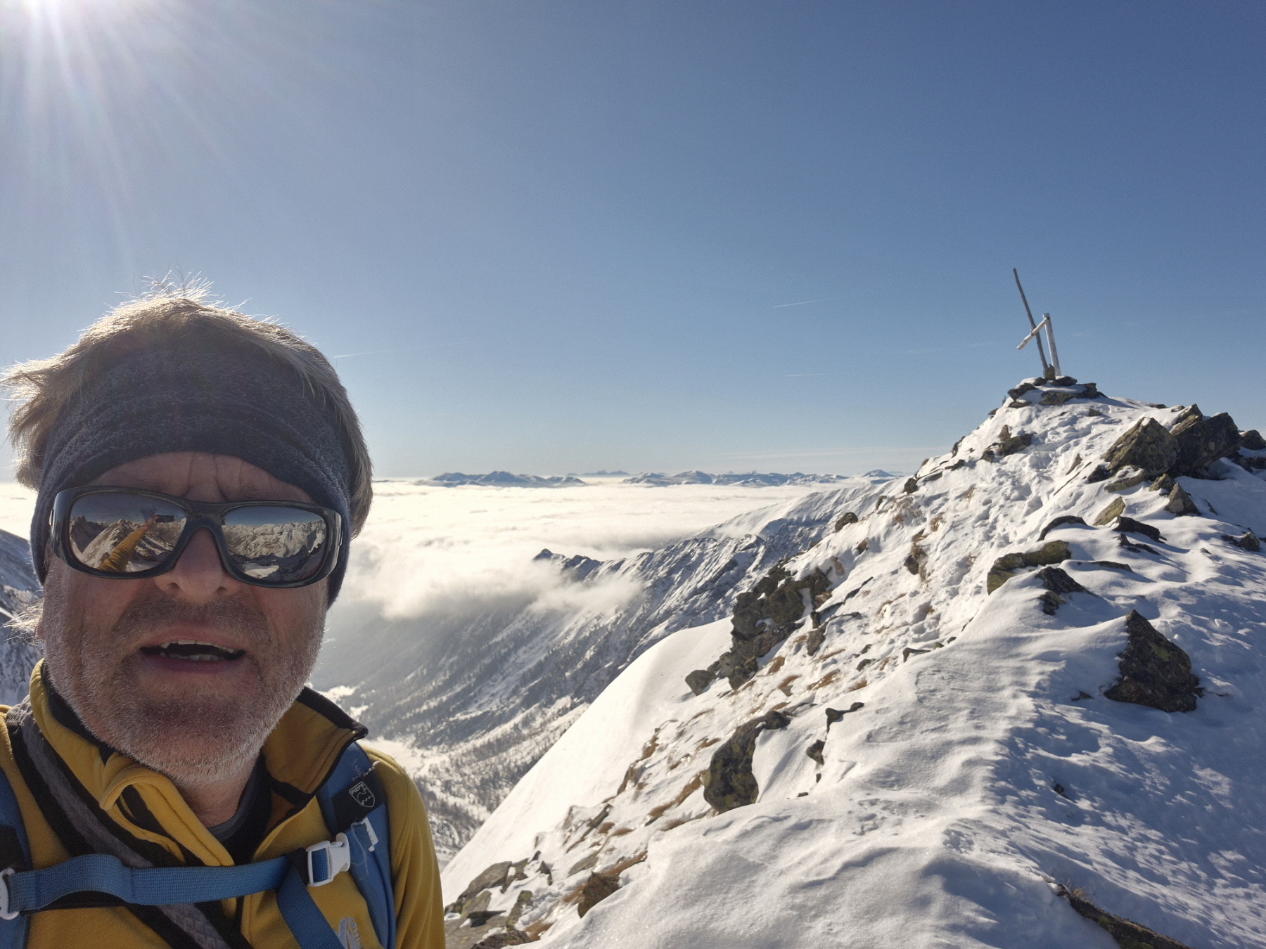 Vom Törl ging es dann in einigen langen Kehren hinauf bis unter den Gipfelaufbau. Dort habe ich die Skier deponiert und bin die letzten Meter zum Gipfel mit dem einfachen rustikalen Kreuz hinaufgestiegen. Es war nahezu windstill und daher habe ich den Gipfelaufenthalt zum Schauen und Jausnen und – wieder – Trinken zelebriert. Schließlich bin ich zum Skidepot abgestiegen, habe für die Abfahrt umgerüstet und bin in etwa entlang der Aufstiegsroute abgefahren.