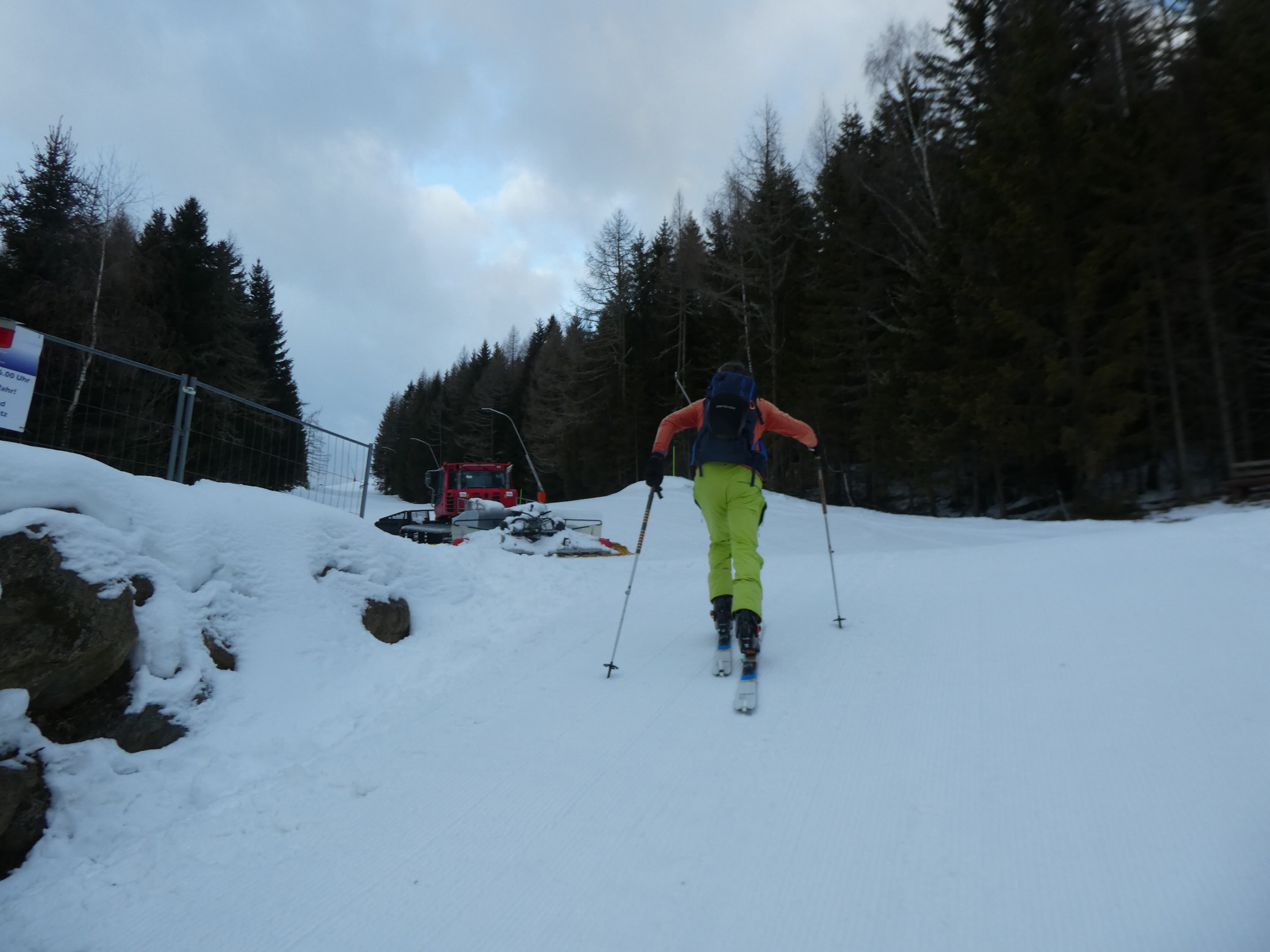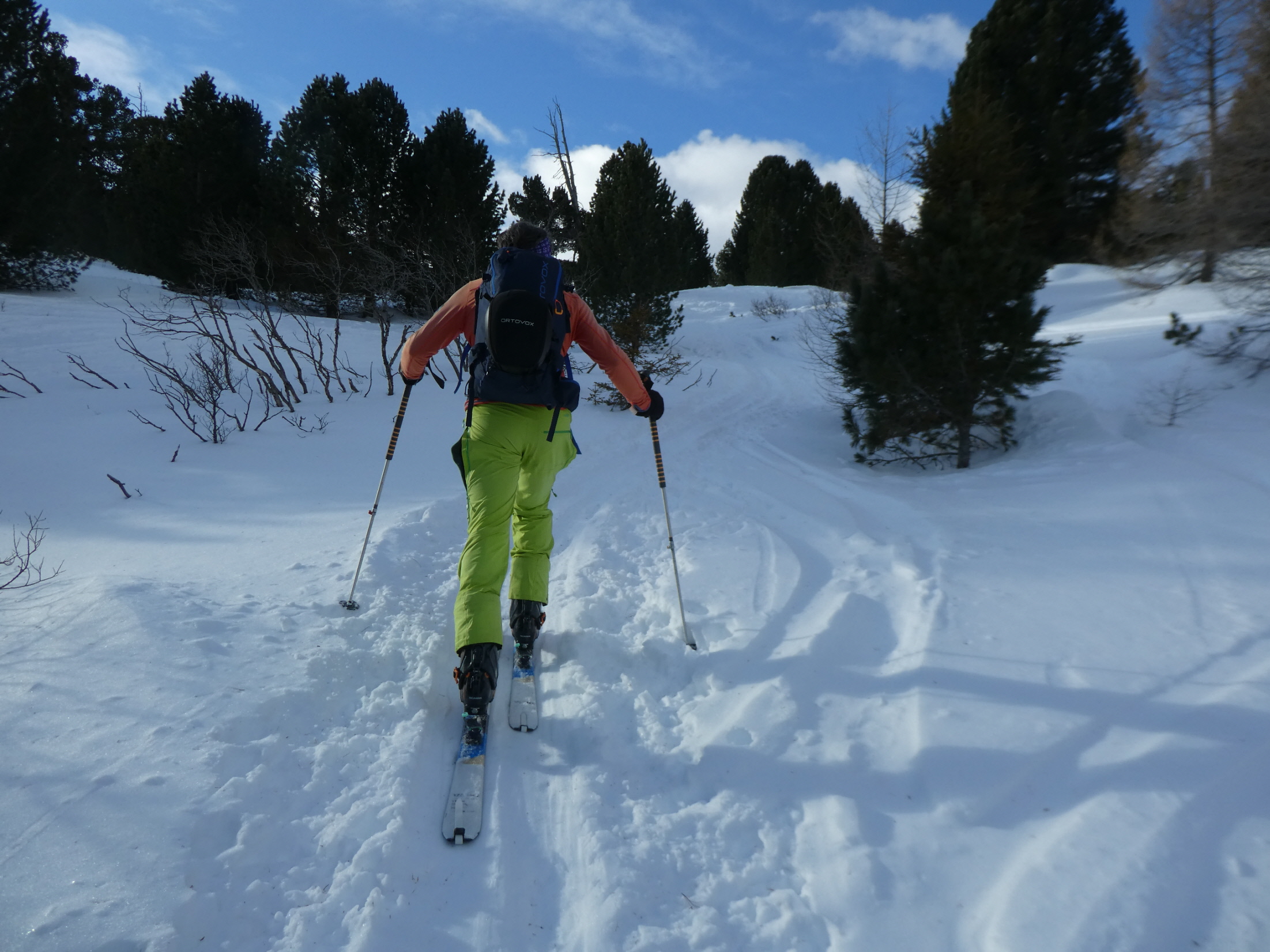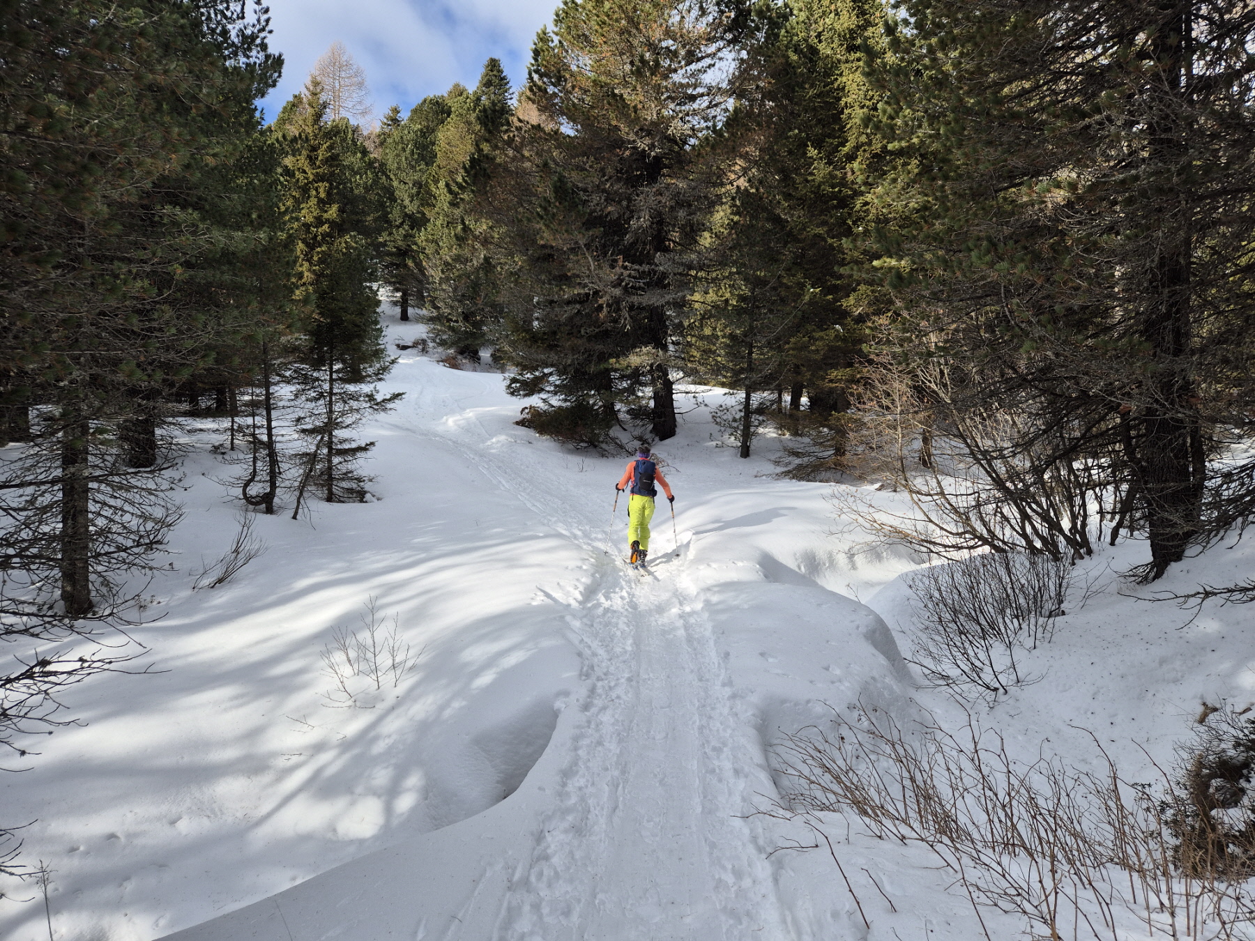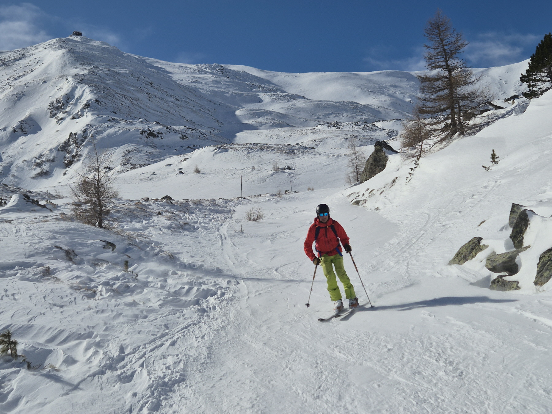 Sehr flott haben wir die zuvor schweißtreibend gewonnene Höhe wieder abgebaut. Am See vorbei ging es hinunter zur Waldgrenze und nach der anfänglichen kurzen Geländestufe im Zirbenwald sind wir im stellenweise recht glasigen Forstweg talwärts gebraust. Auf die kurze Gegensteigung bei der Wegkehre, die uns zur vormaligen Piste zur Sabathyhütte geführt hätte, haben wir verzichtet, weil wir uns dort keinen guten Schnee erwartet haben.