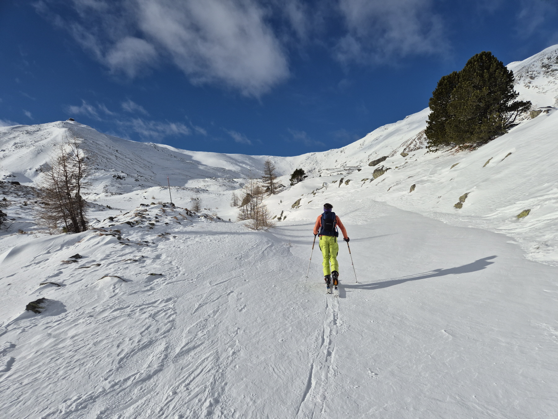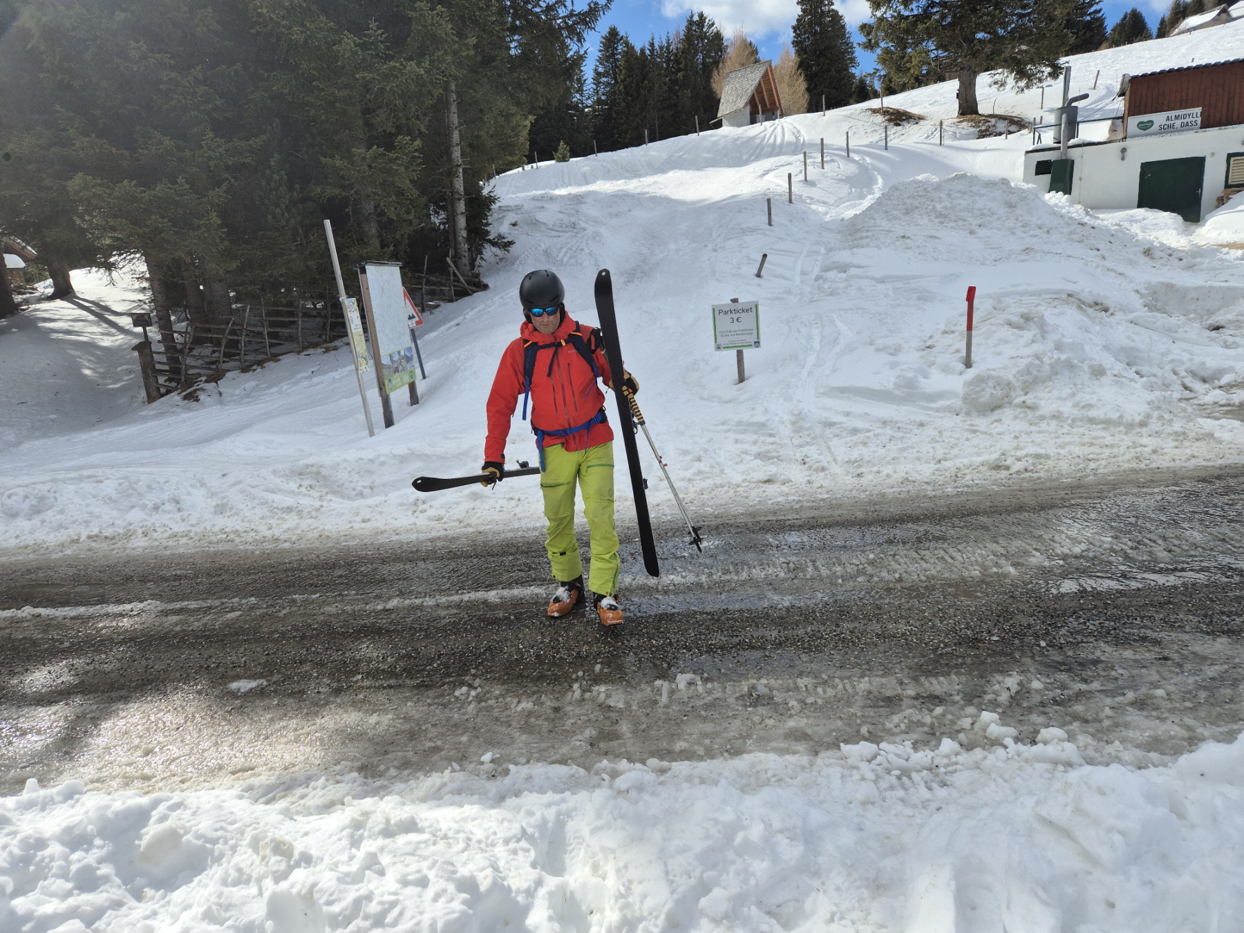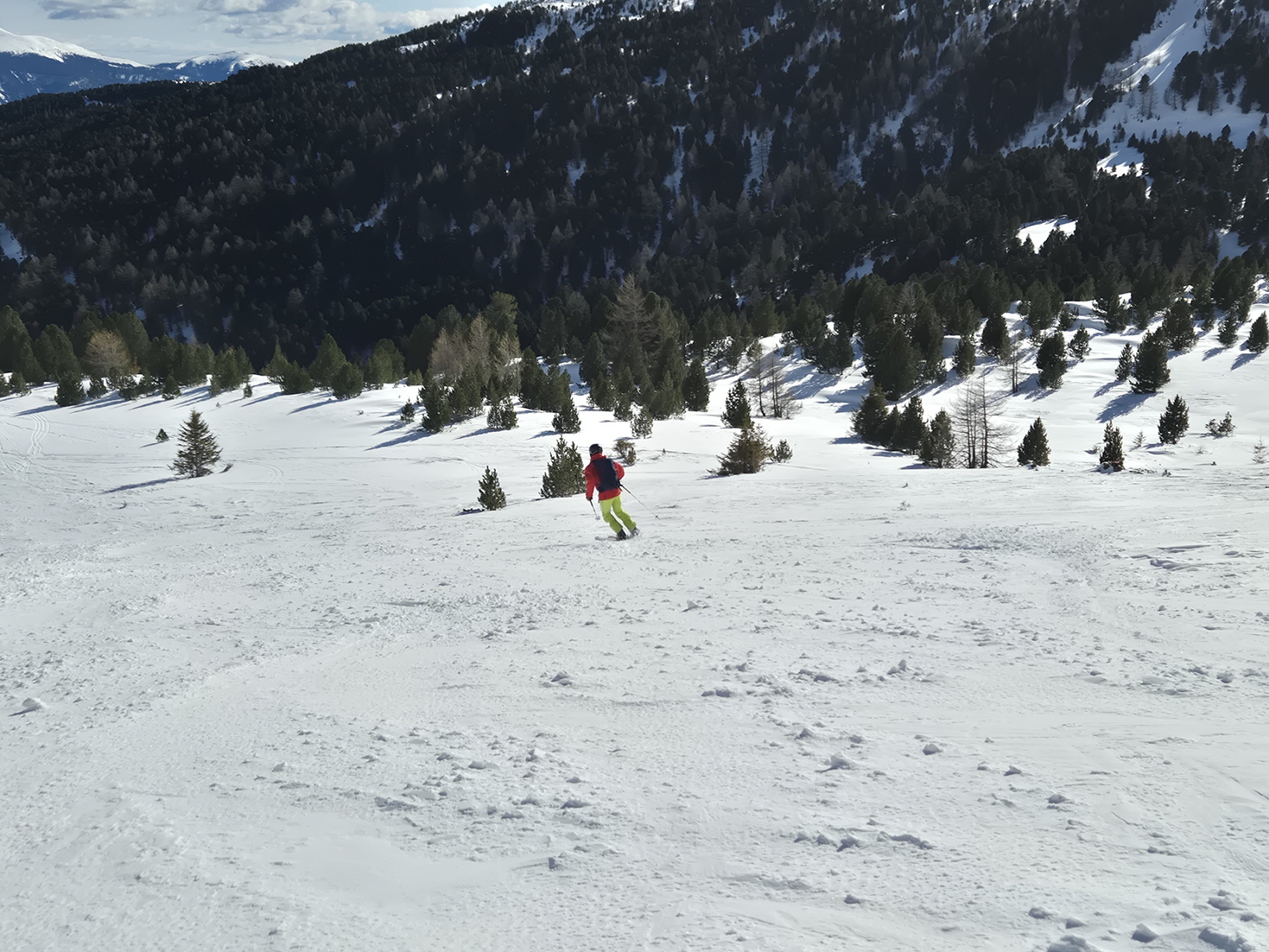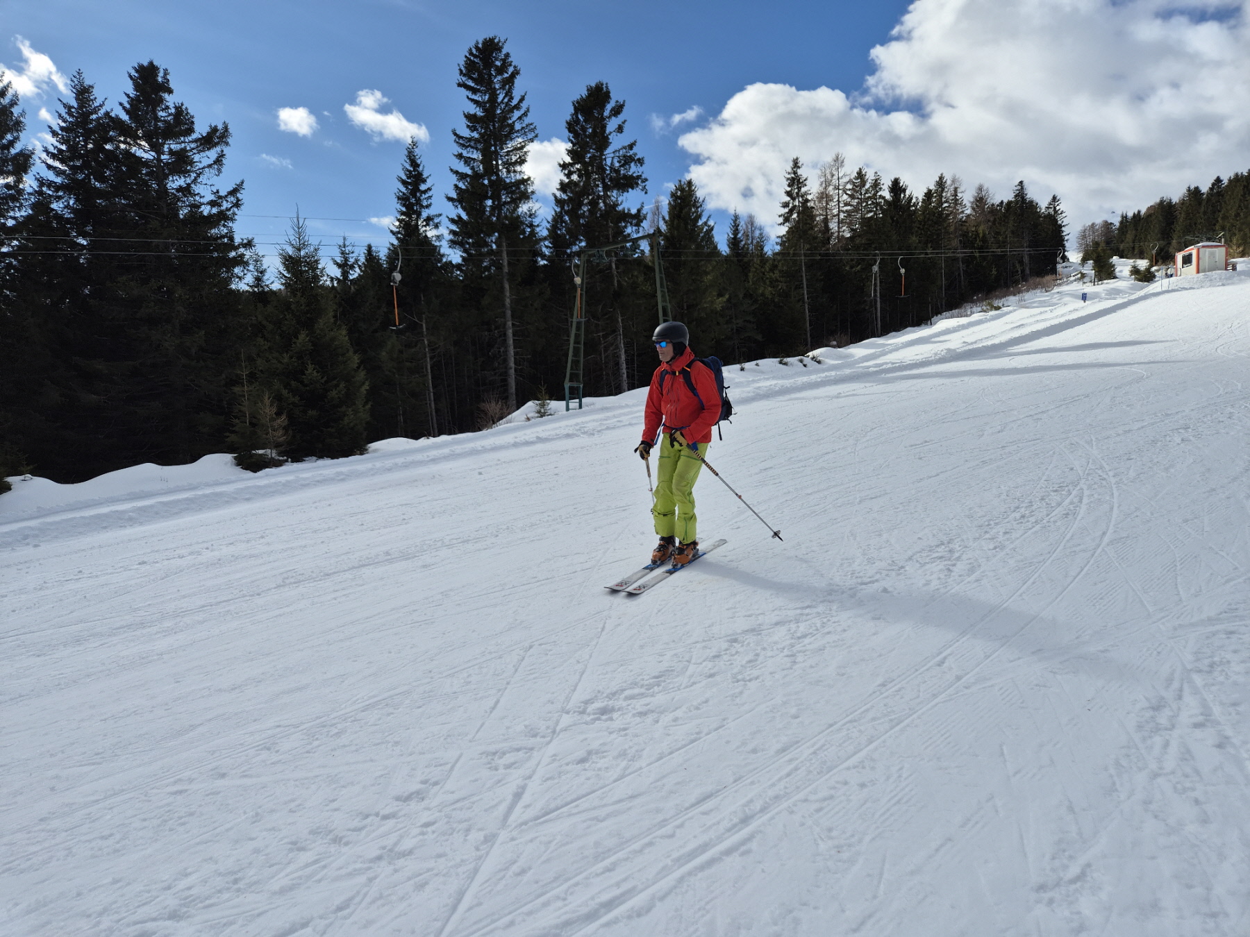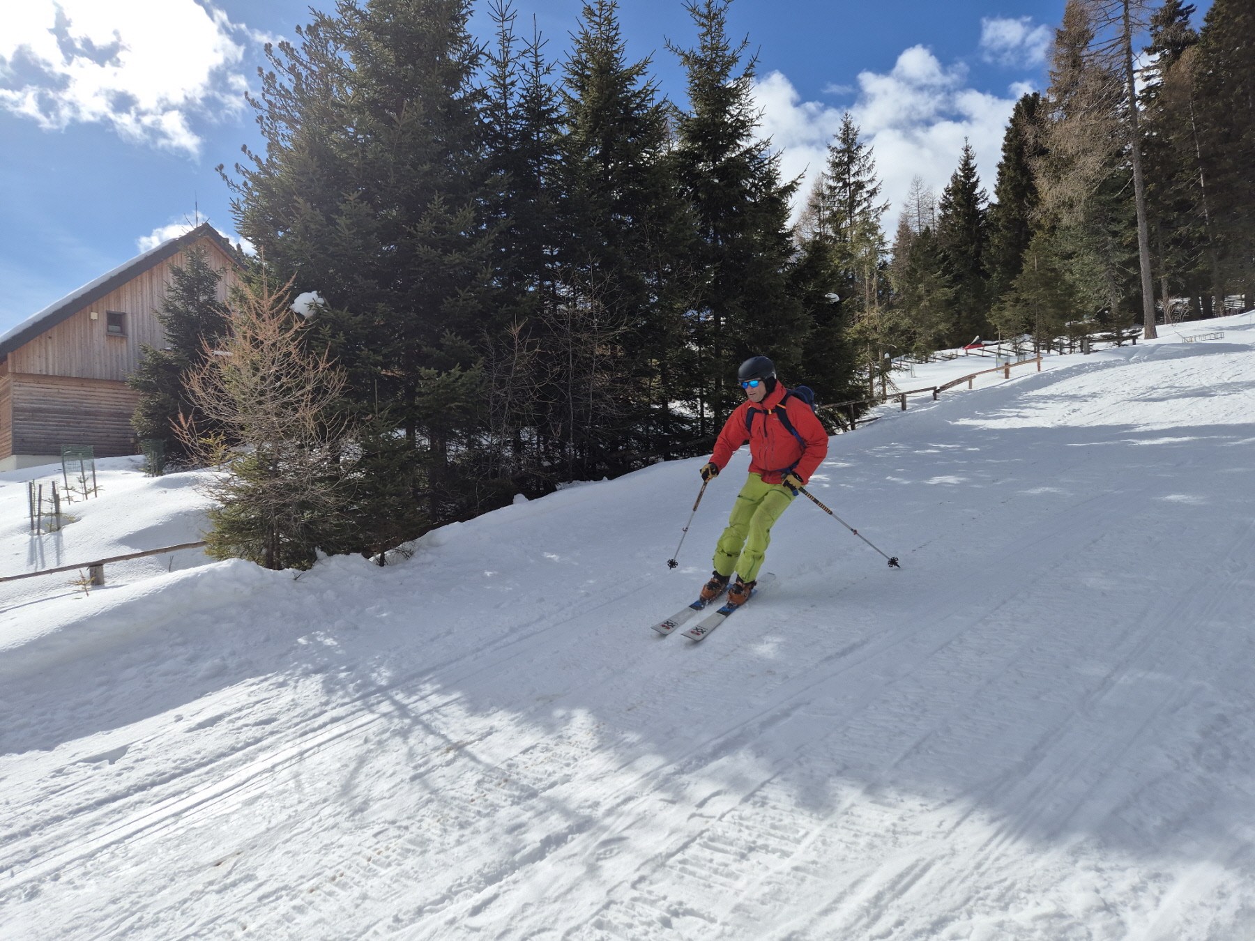 Sehr flott haben wir die zuvor schweißtreibend gewonnene Höhe wieder abgebaut. Am See vorbei ging es hinunter zur Waldgrenze und nach der anfänglichen kurzen Geländestufe im Zirbenwald sind wir im stellenweise recht glasigen Forstweg talwärts gebraust. Auf die kurze Gegensteigung bei der Wegkehre, die uns zur vormaligen Piste zur Sabathyhütte geführt hätte, haben wir verzichtet, weil wir uns dort keinen guten Schnee erwartet haben.