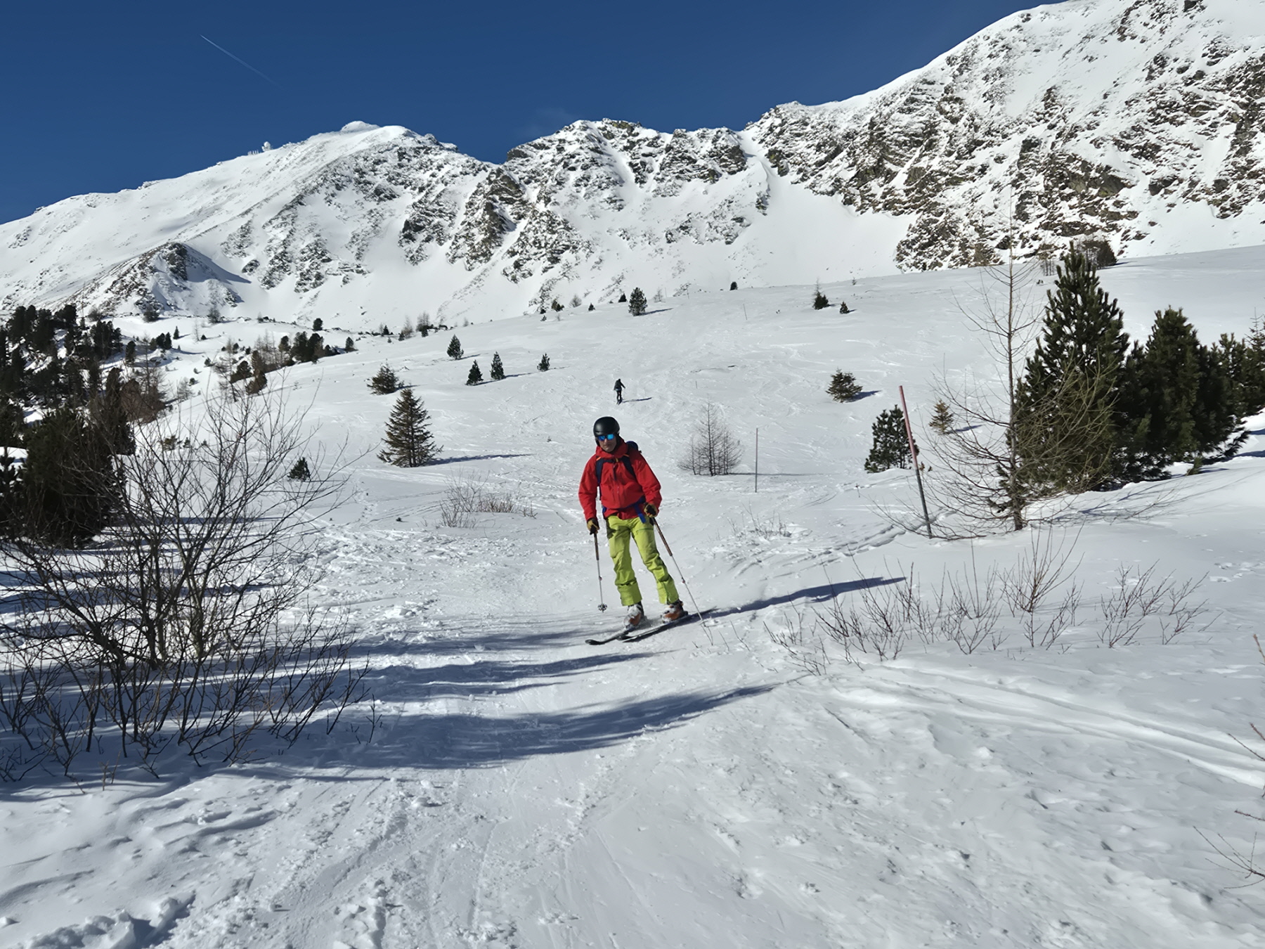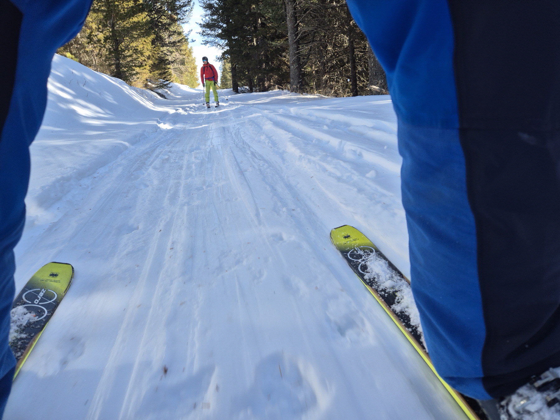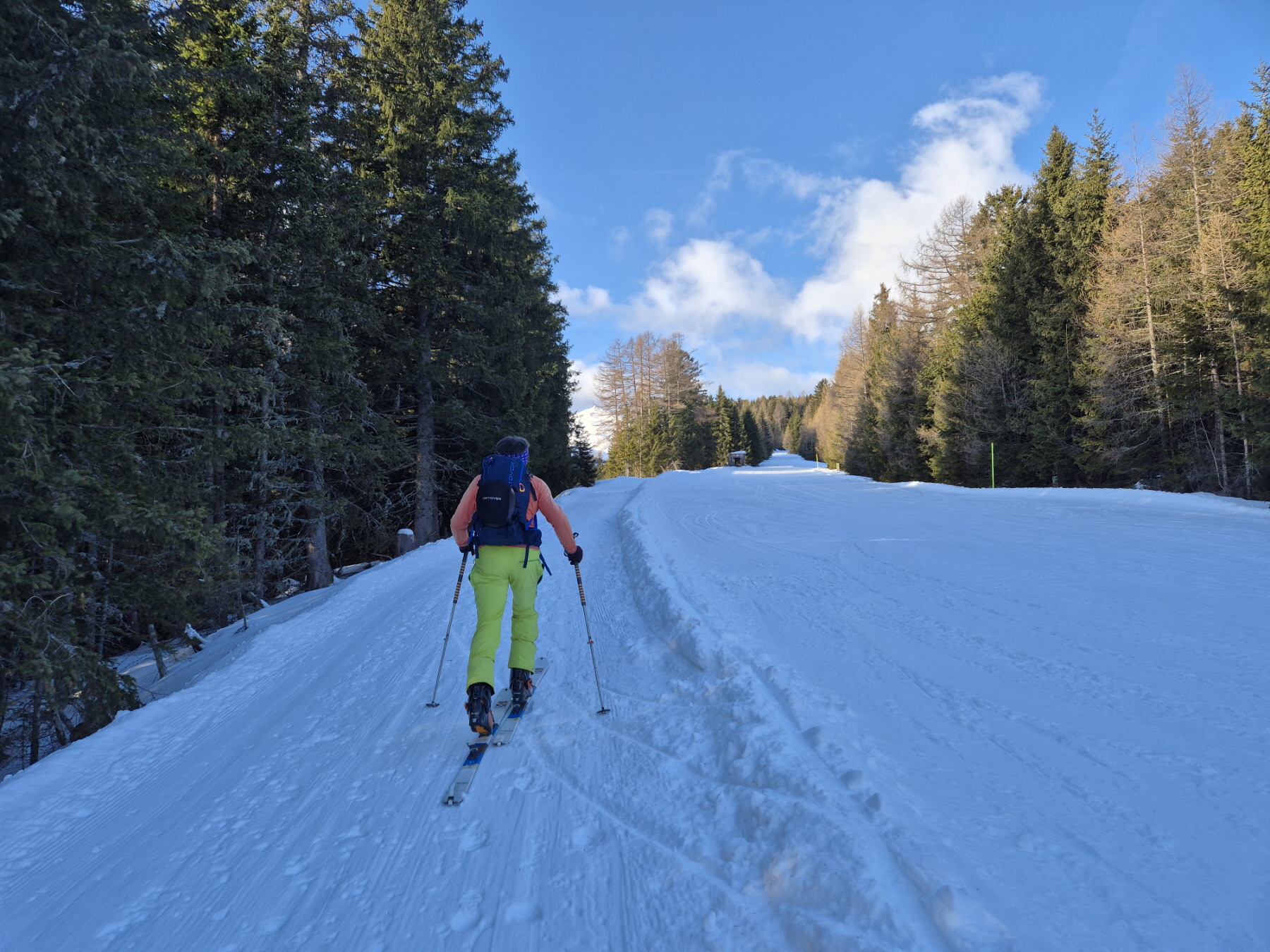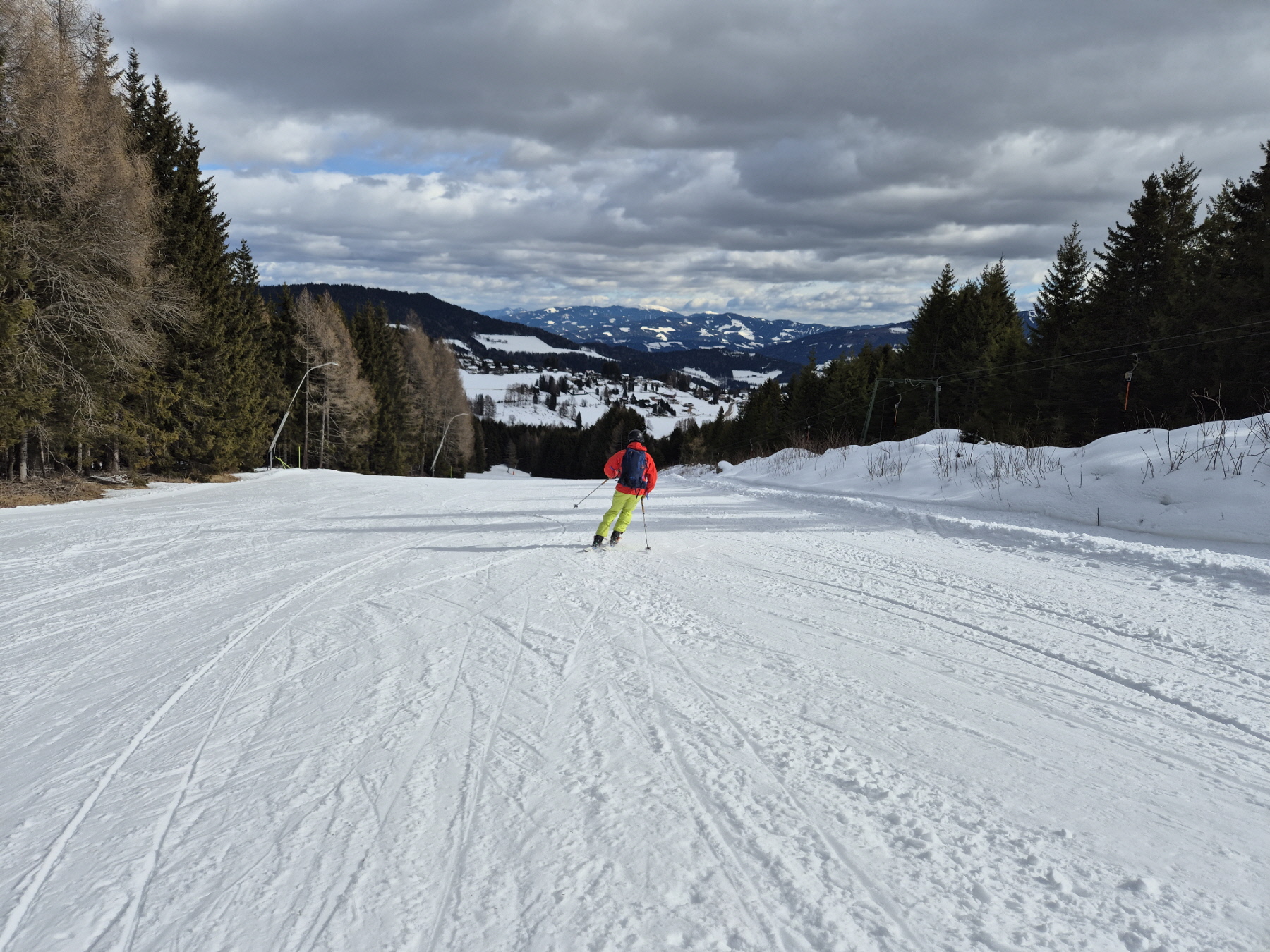 Sehr flott haben wir die zuvor schweißtreibend gewonnene Höhe wieder abgebaut. Am See vorbei ging es hinunter zur Waldgrenze und nach der anfänglichen kurzen Geländestufe im Zirbenwald sind wir im stellenweise recht glasigen Forstweg talwärts gebraust. Auf die kurze Gegensteigung bei der Wegkehre, die uns zur vormaligen Piste zur Sabathyhütte geführt hätte, haben wir verzichtet, weil wir uns dort keinen guten Schnee erwartet haben.
