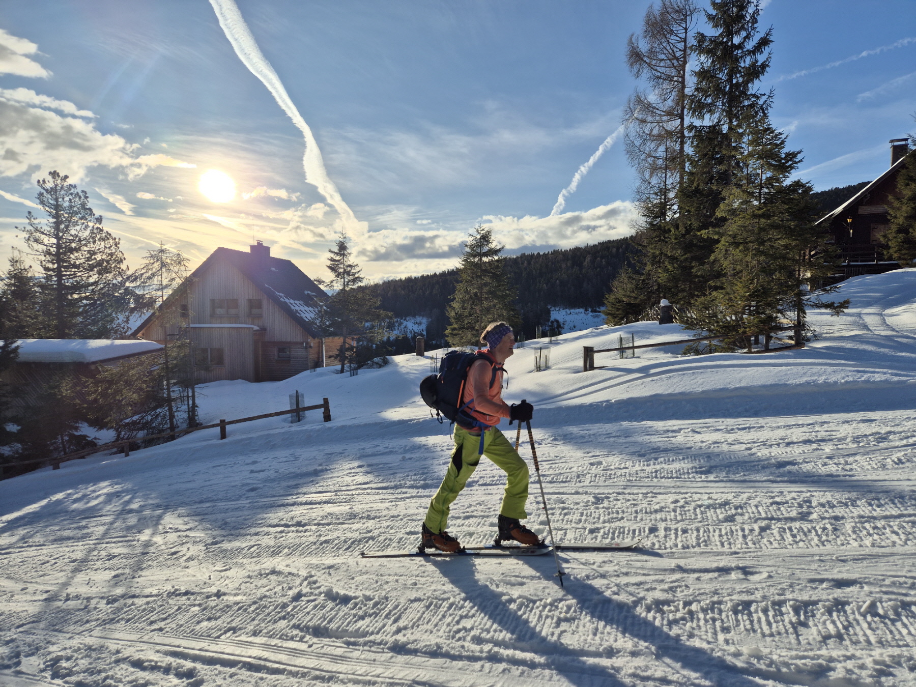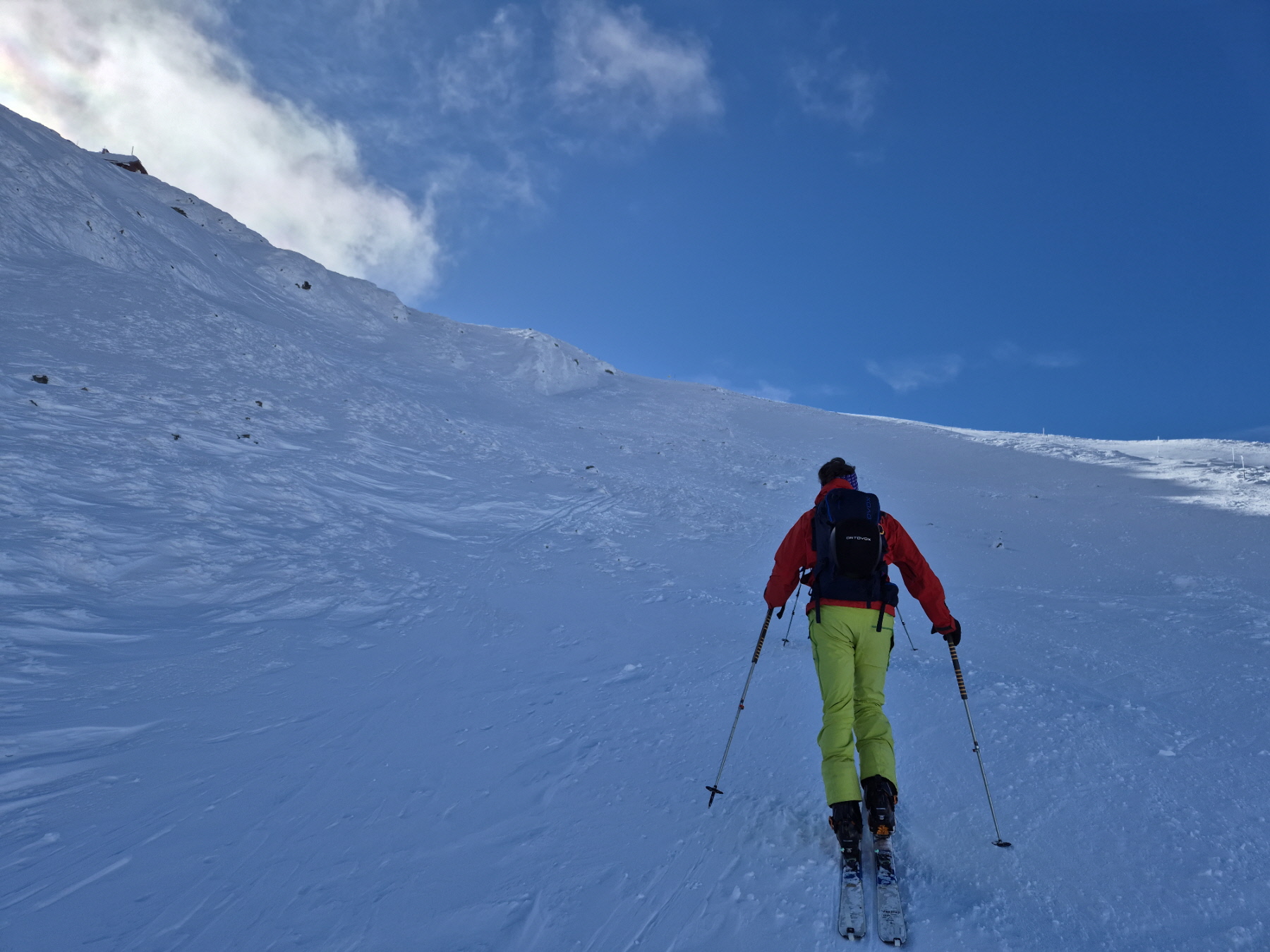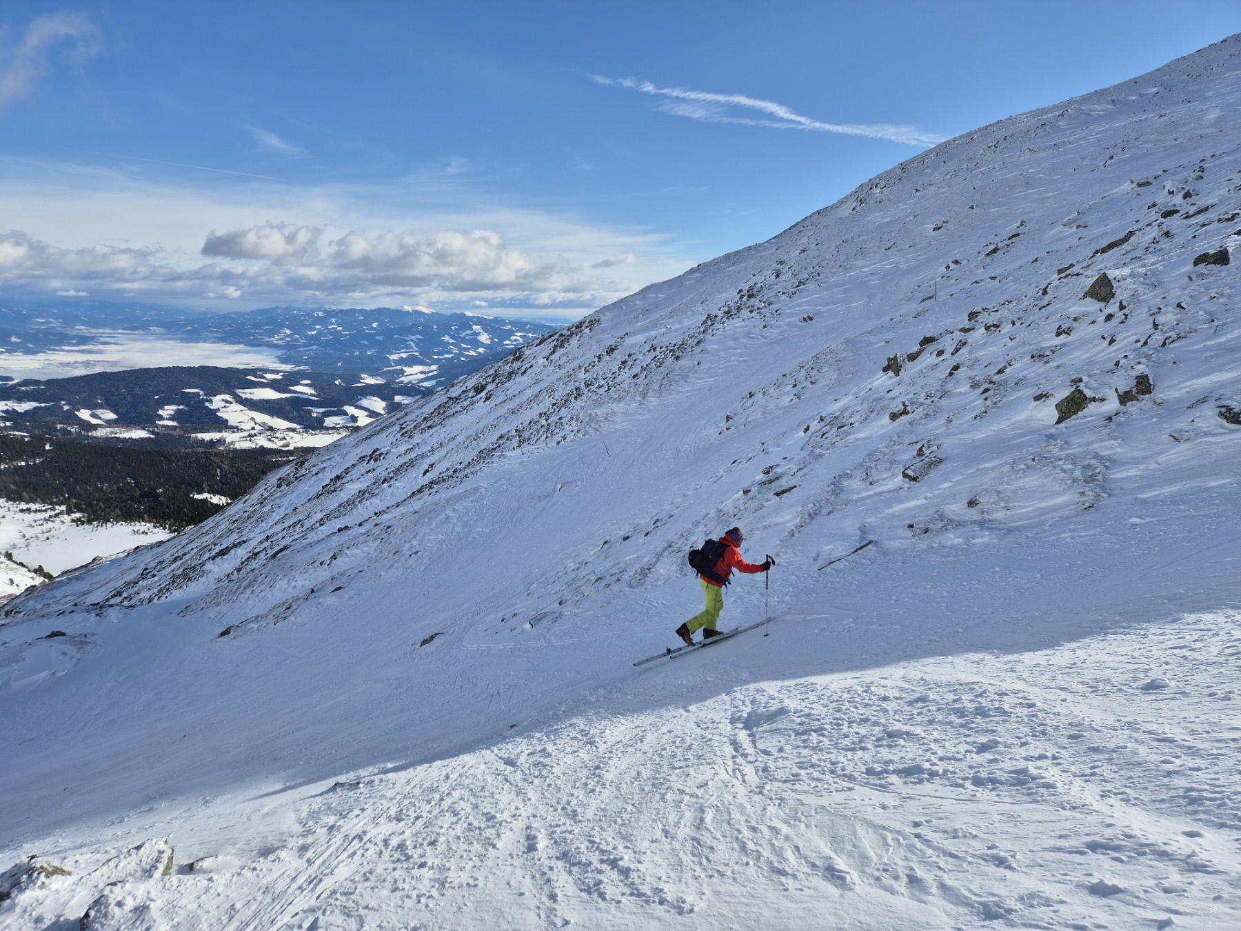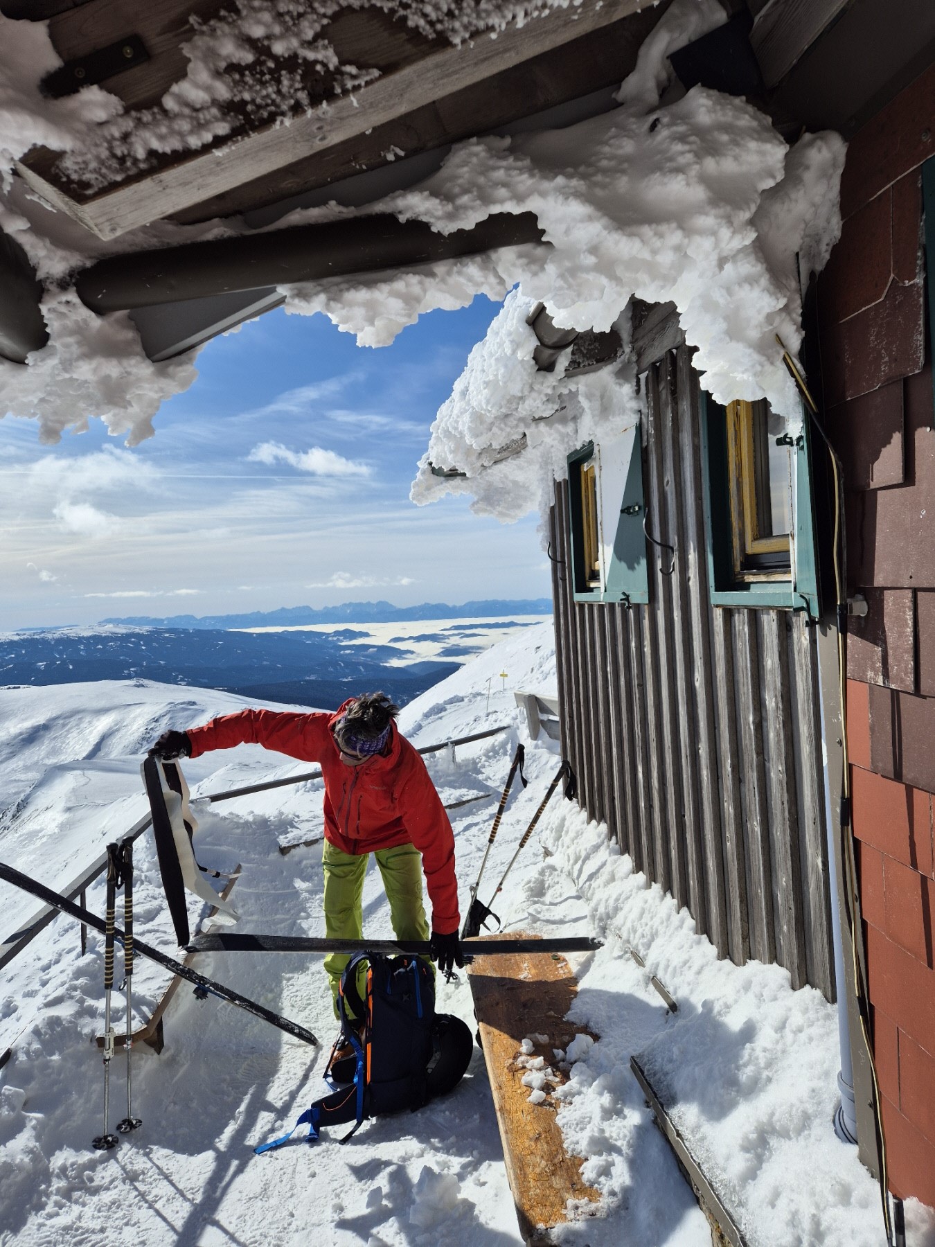 Jedenfalls sind wir gleich auf Fellen zum Schutzhaus hinunter gefahren und haben dort an der windgeschützten Südseite vor dem Winterraum abgefellt, uns gestärkt und uns darüber gewundert, wie wenig Schnee immer noch entlang des Aufstiegsweges von der Waldheimhütte liegt. Bis zu unserer Abfahrt ist von dieser Seite überhaupt niemand heraufgekommen.