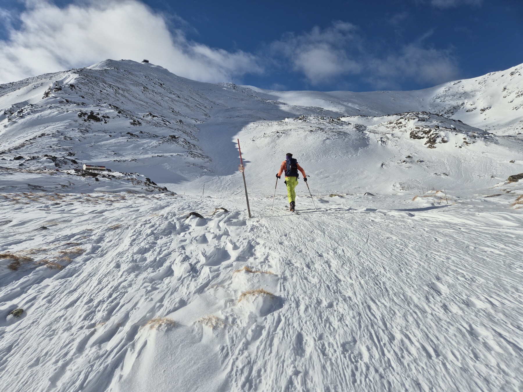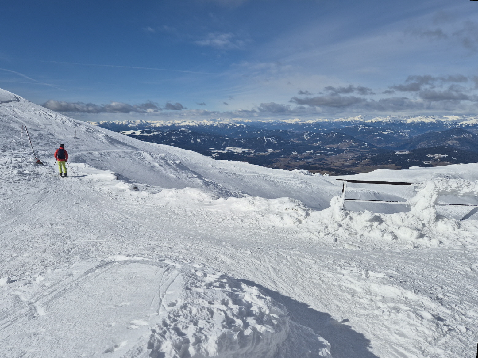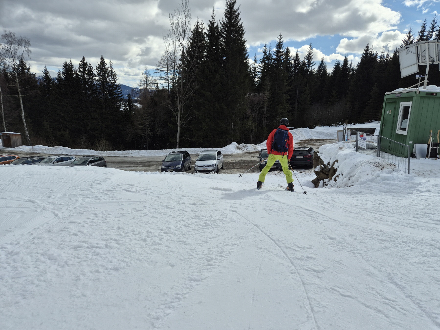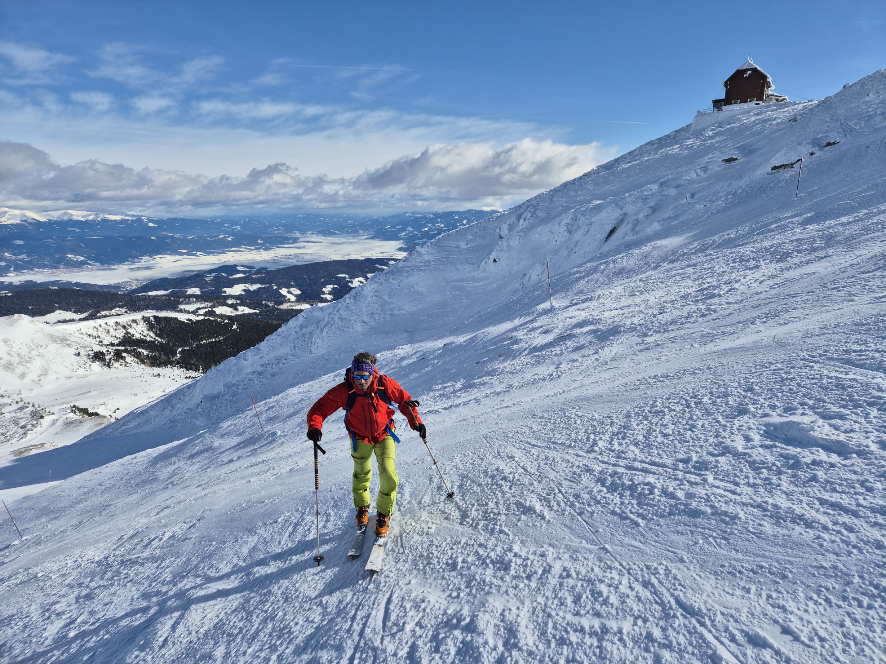 Jedenfalls sind wir gleich auf Fellen zum Schutzhaus hinunter gefahren und haben dort an der windgeschützten Südseite vor dem Winterraum abgefellt, uns gestärkt und uns darüber gewundert, wie wenig Schnee immer noch entlang des Aufstiegsweges von der Waldheimhütte liegt. Bis zu unserer Abfahrt ist von dieser Seite überhaupt niemand heraufgekommen.