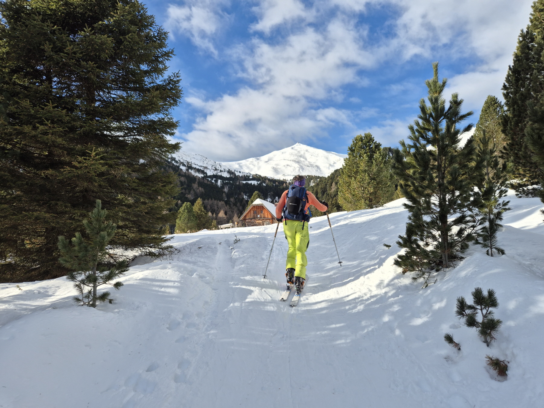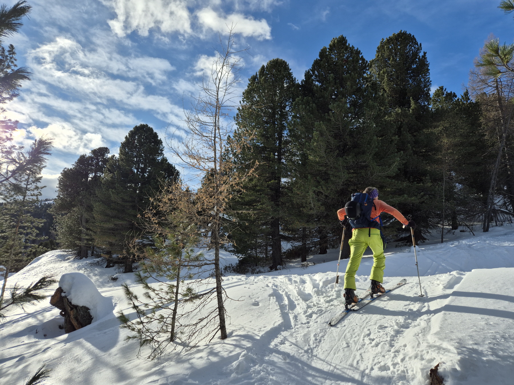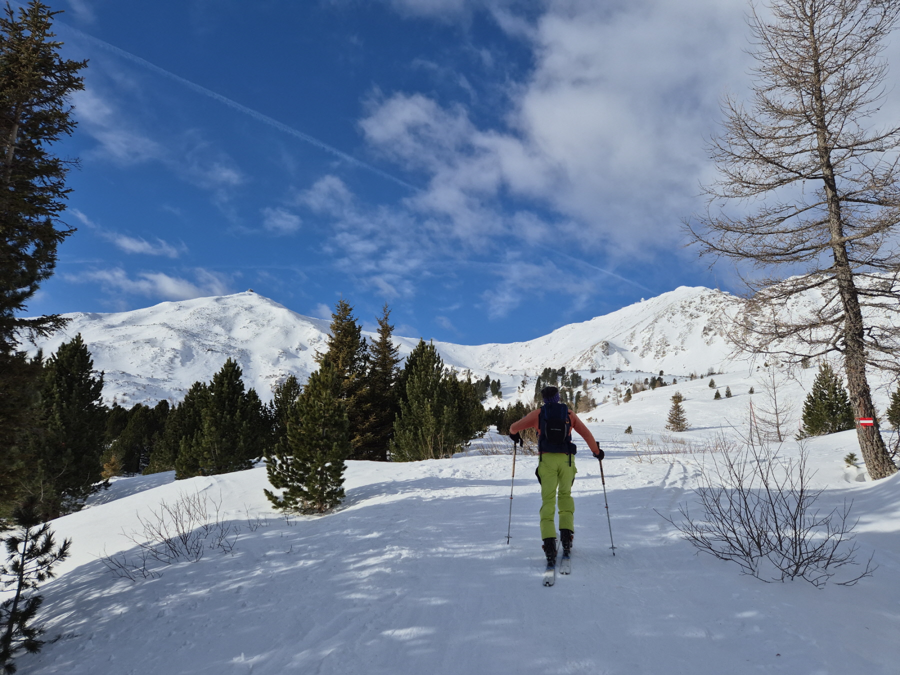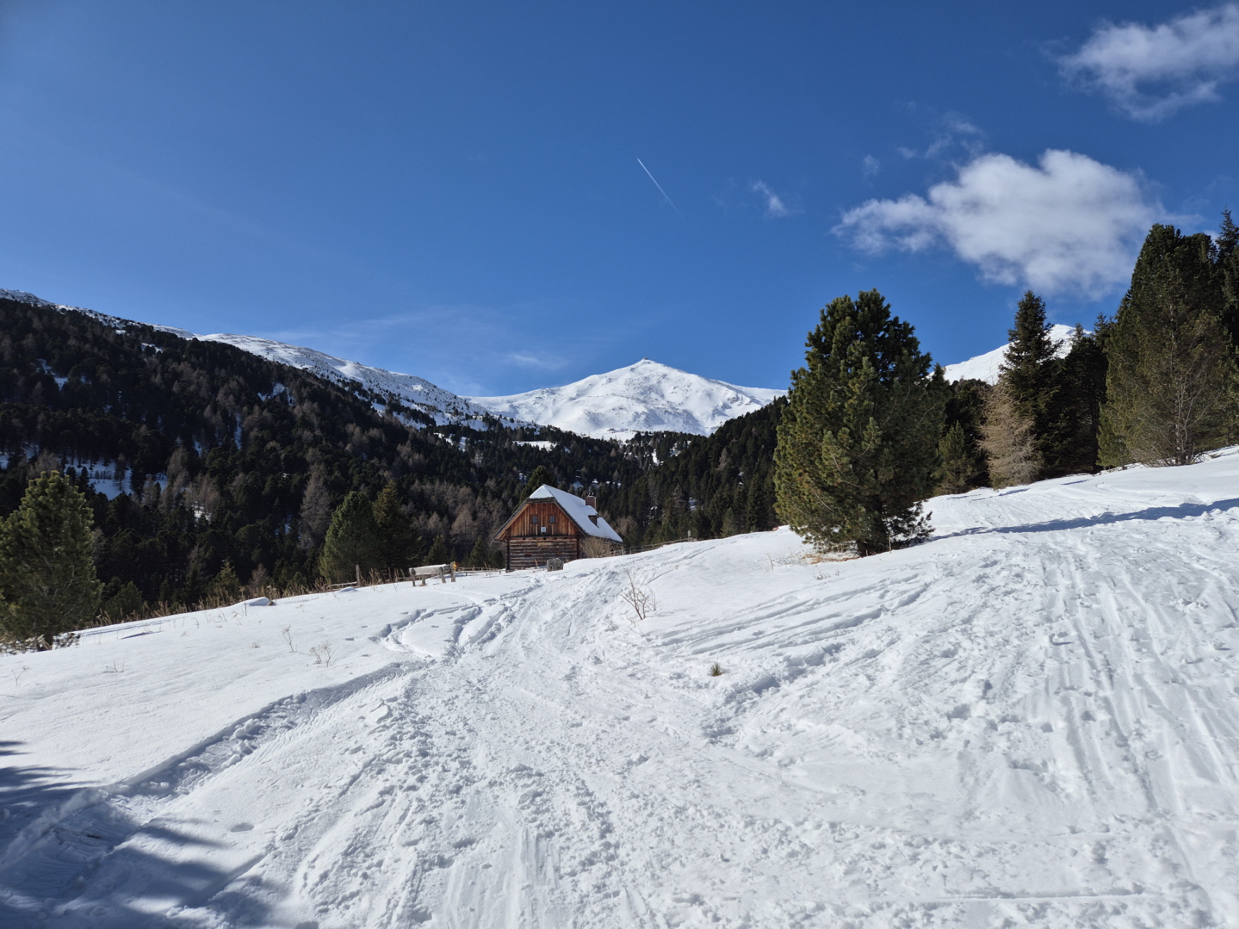 Nach dem Aufstieg entlang der Rieserlifte und in der Verlängerung vorbei an den Wochenendhäusern im Sabathygebiet haben wir unterhalb der Sabathyhütte die Zufahrtsstraße gequert und sind vorbei an der Zirbenkapelle weiter angestiegen. Flach ging es hinein zur Linderhütte und ab da entlang der obligaten Route durch den Zirbenbestand weiter hinauf zur Waldgrenze.