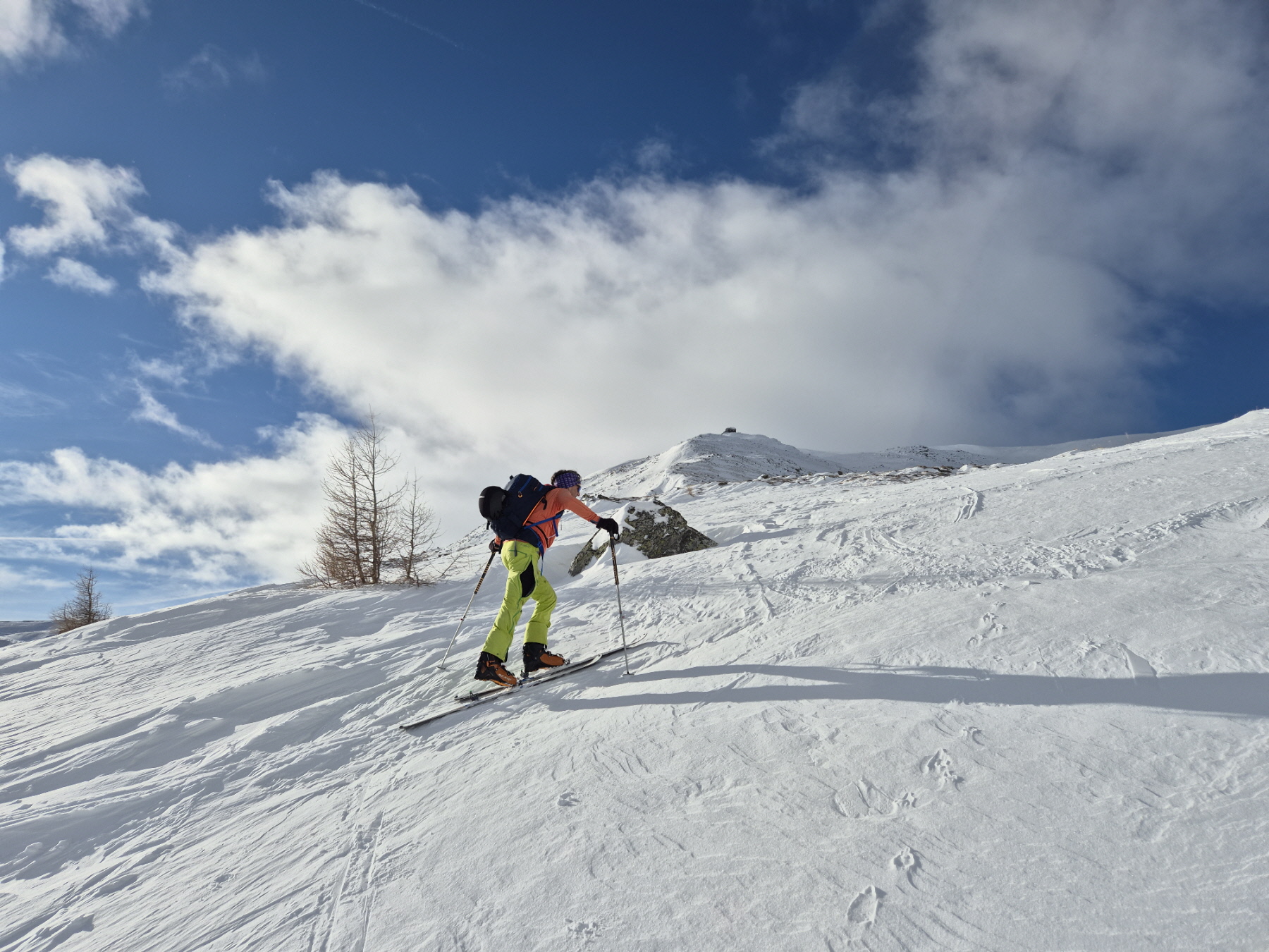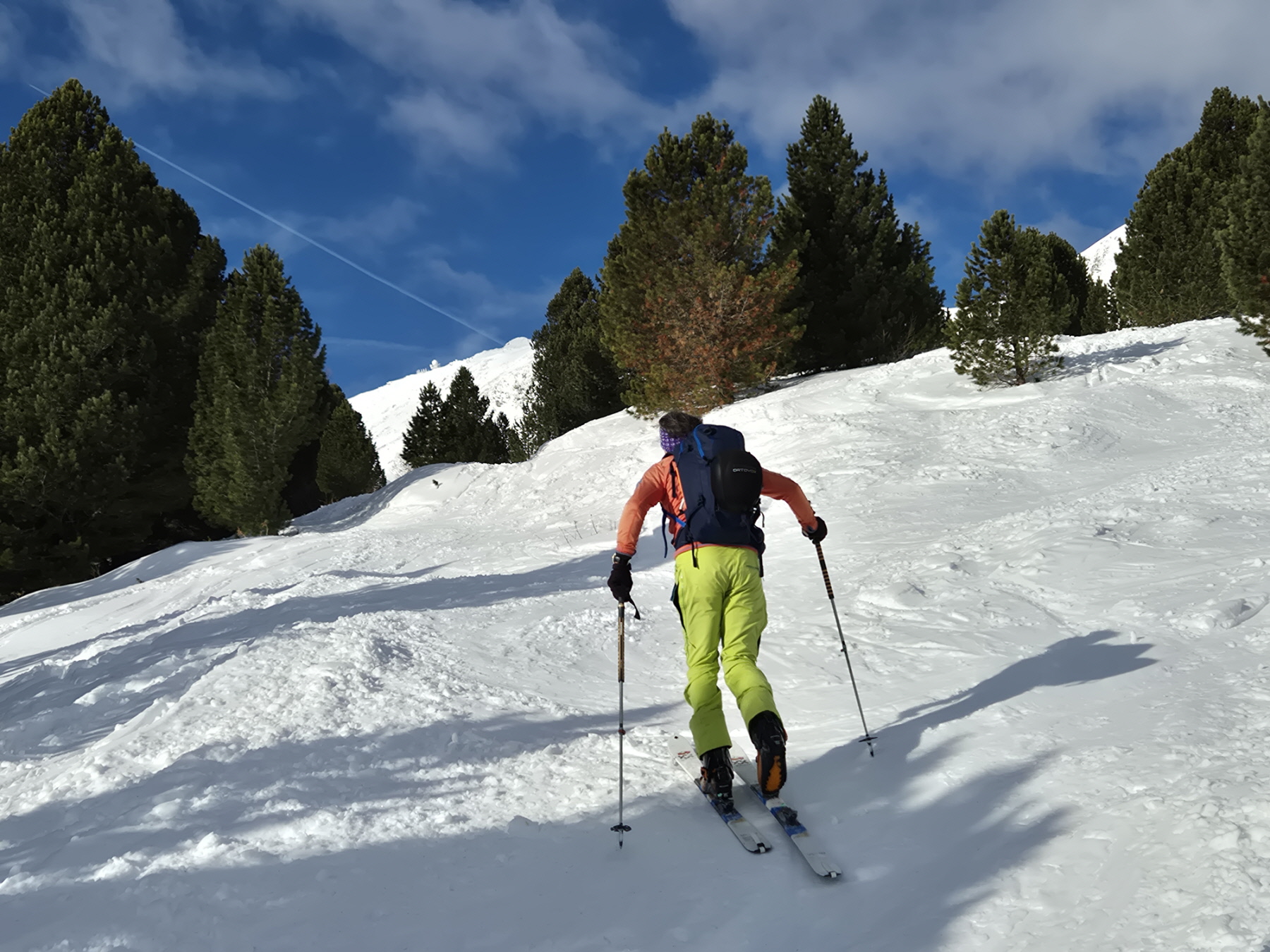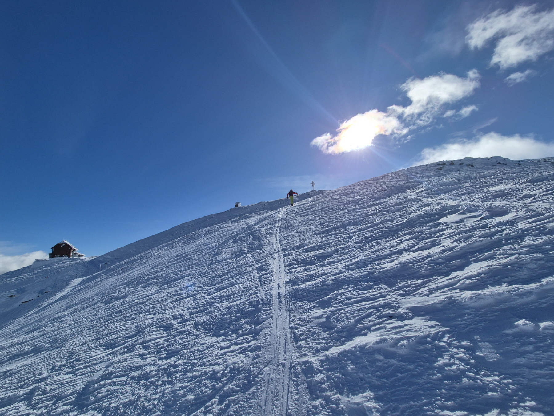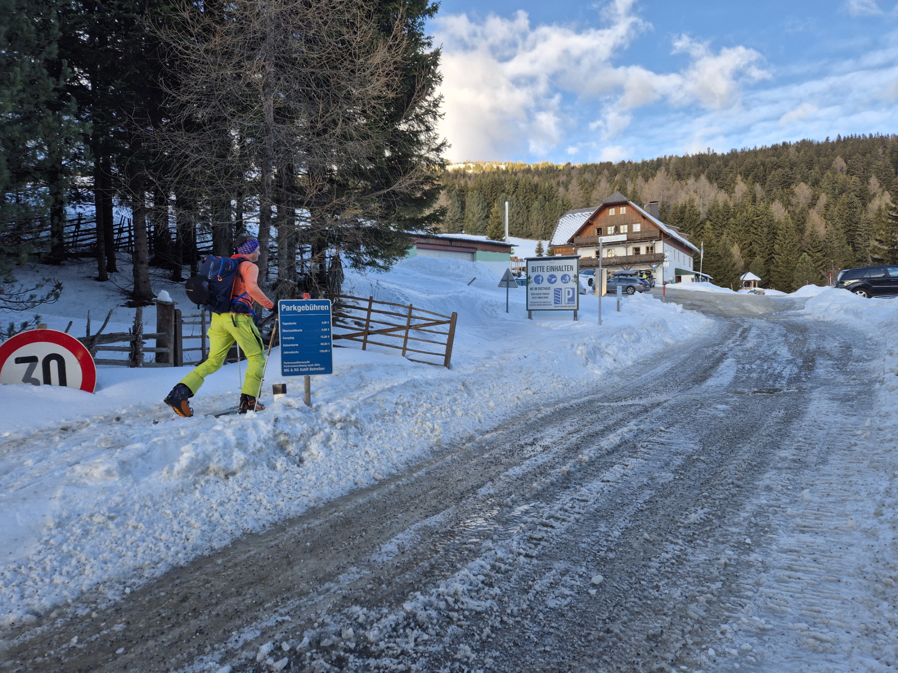 Nach dem Aufstieg entlang der Rieserlifte und in der Verlängerung vorbei an den Wochenendhäusern im Sabathygebiet haben wir unterhalb der Sabathyhütte die Zufahrtsstraße gequert und sind vorbei an der Zirbenkapelle weiter angestiegen. Flach ging es hinein zur Linderhütte und ab da entlang der obligaten Route durch den Zirbenbestand weiter hinauf zur Waldgrenze.