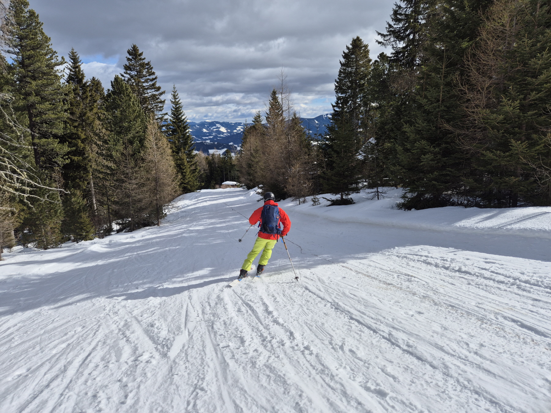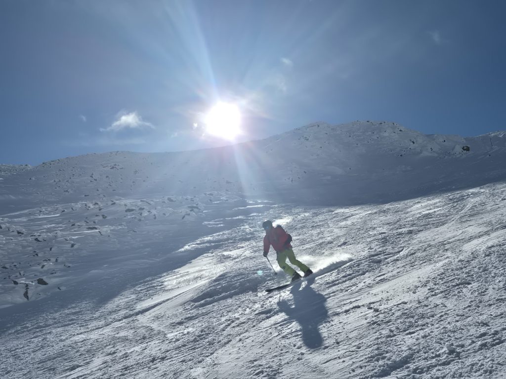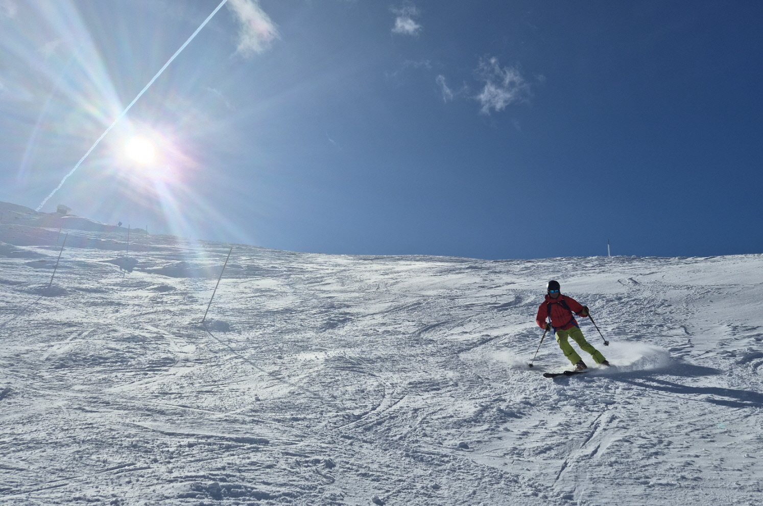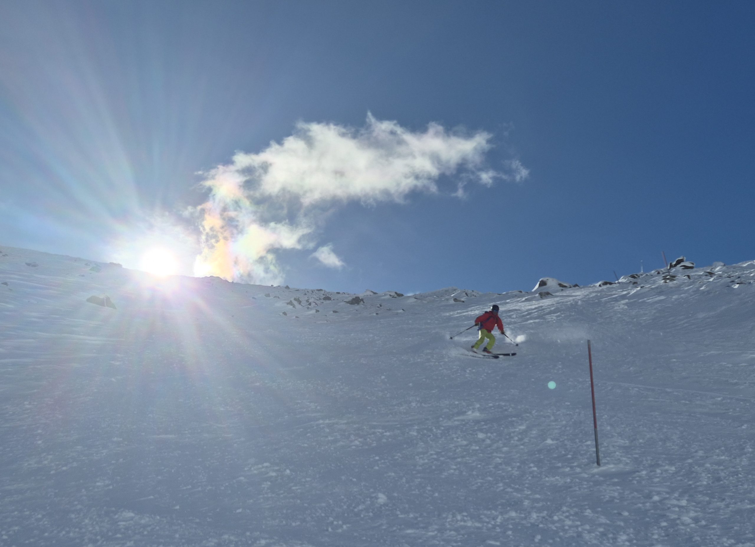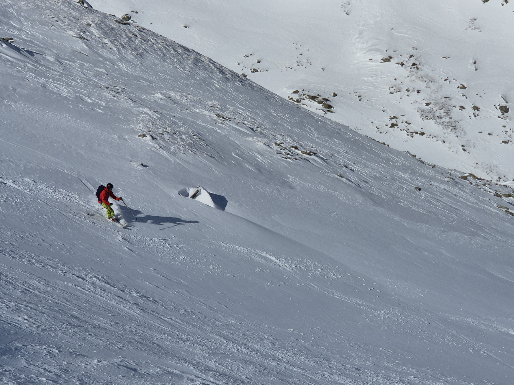 Als das Haupthaar unter dem Helm verstaut war und – fast 😉– alle Ausrüstungsgegenstände in den Abfahrtsmodus getrimmt waren, haben wir angeschnallt und sind losgefahren. Gleich der erste Hang hat uns gezeigt, dass es sich auf der kompakten Unterlage sehr gut fährt. Als ich dann auch noch an meinem Skibergschuh den Abfahrtsmodus eingeschaltet habe, hat sich der Abfahrtsgenuss auf den weiteren Stufen hinunter zum Lindersee noch einmal gesteigert.