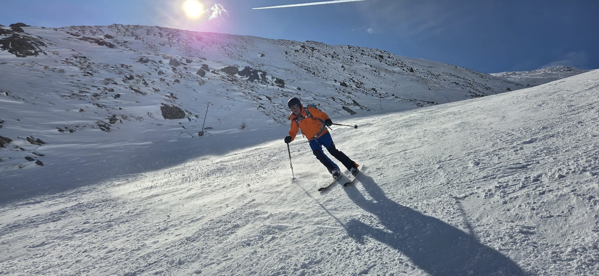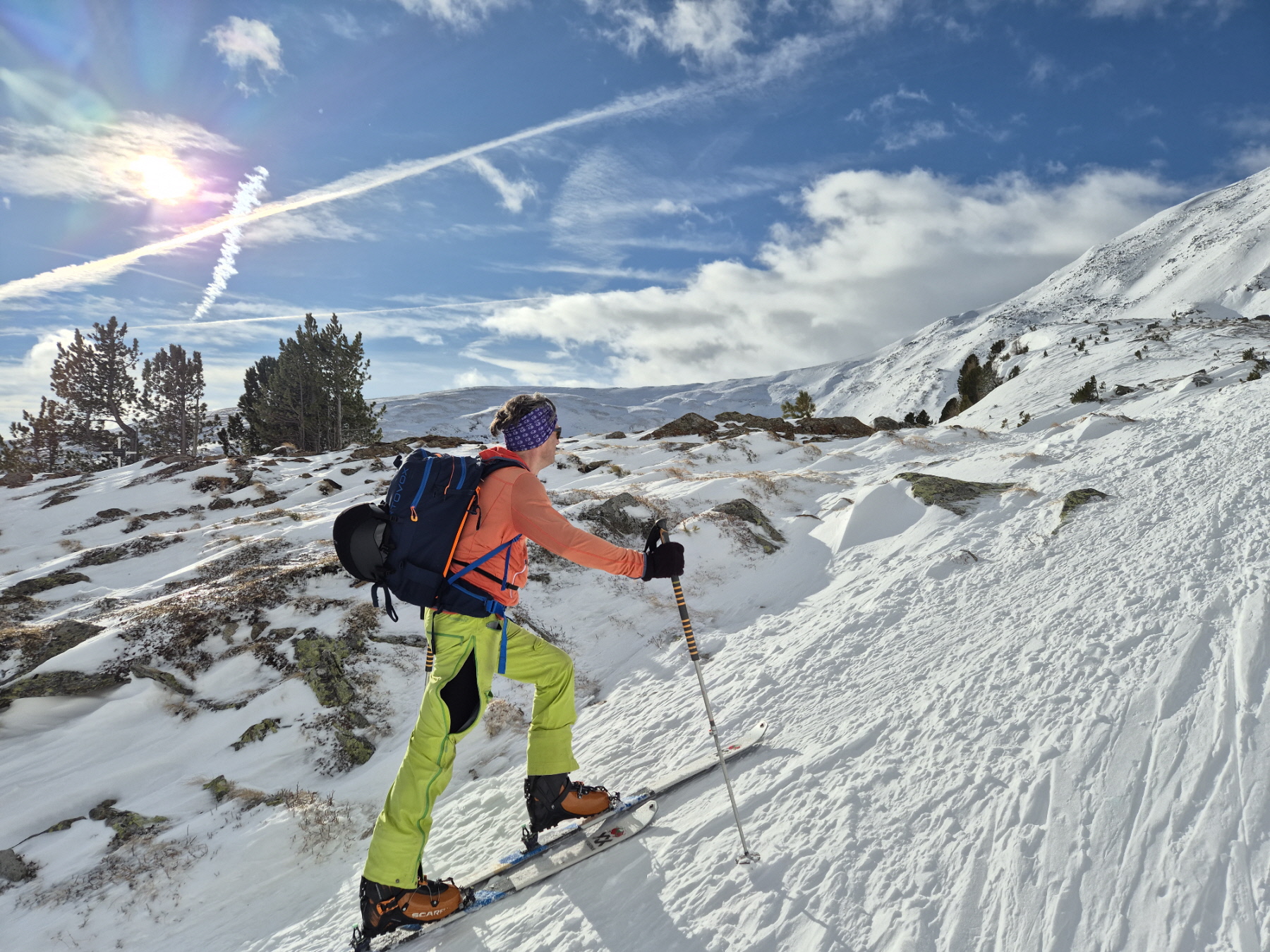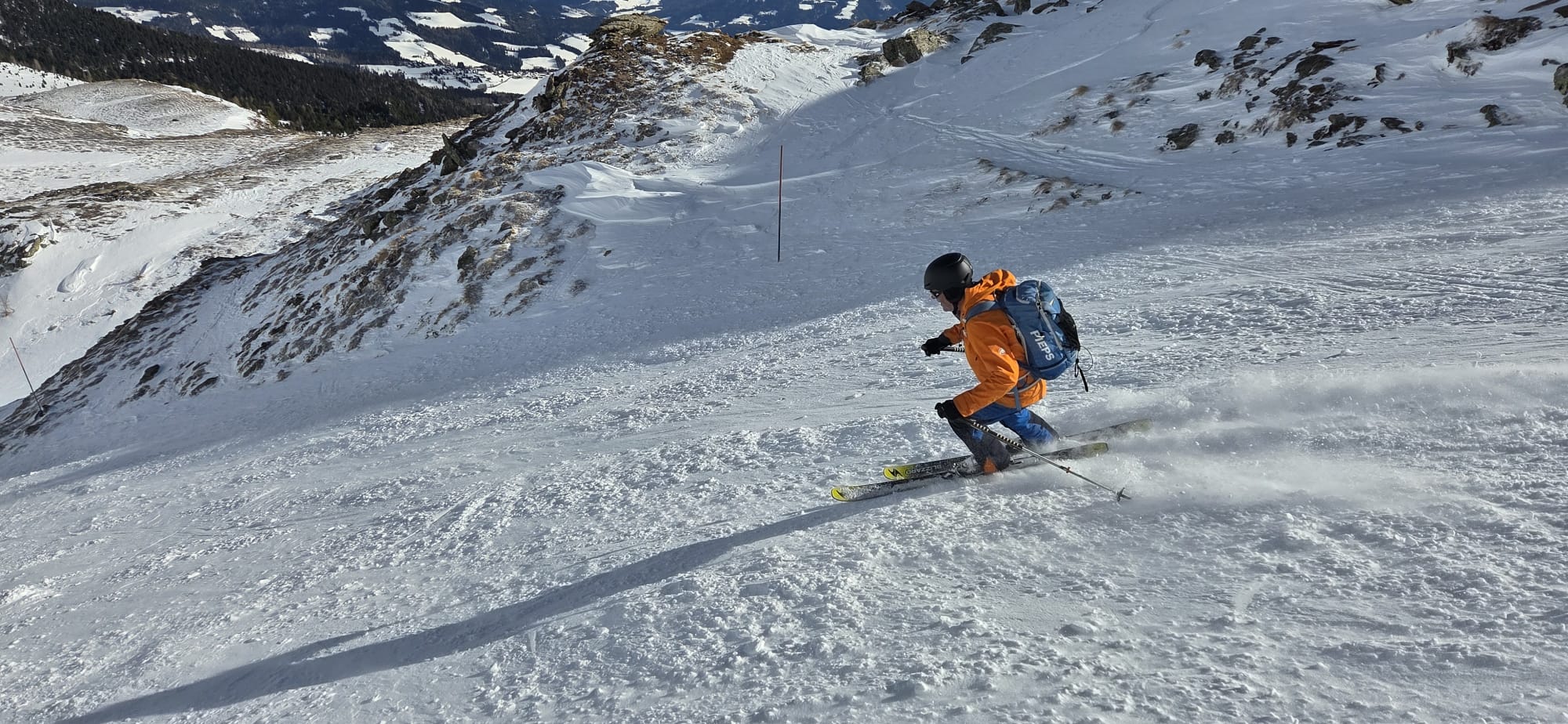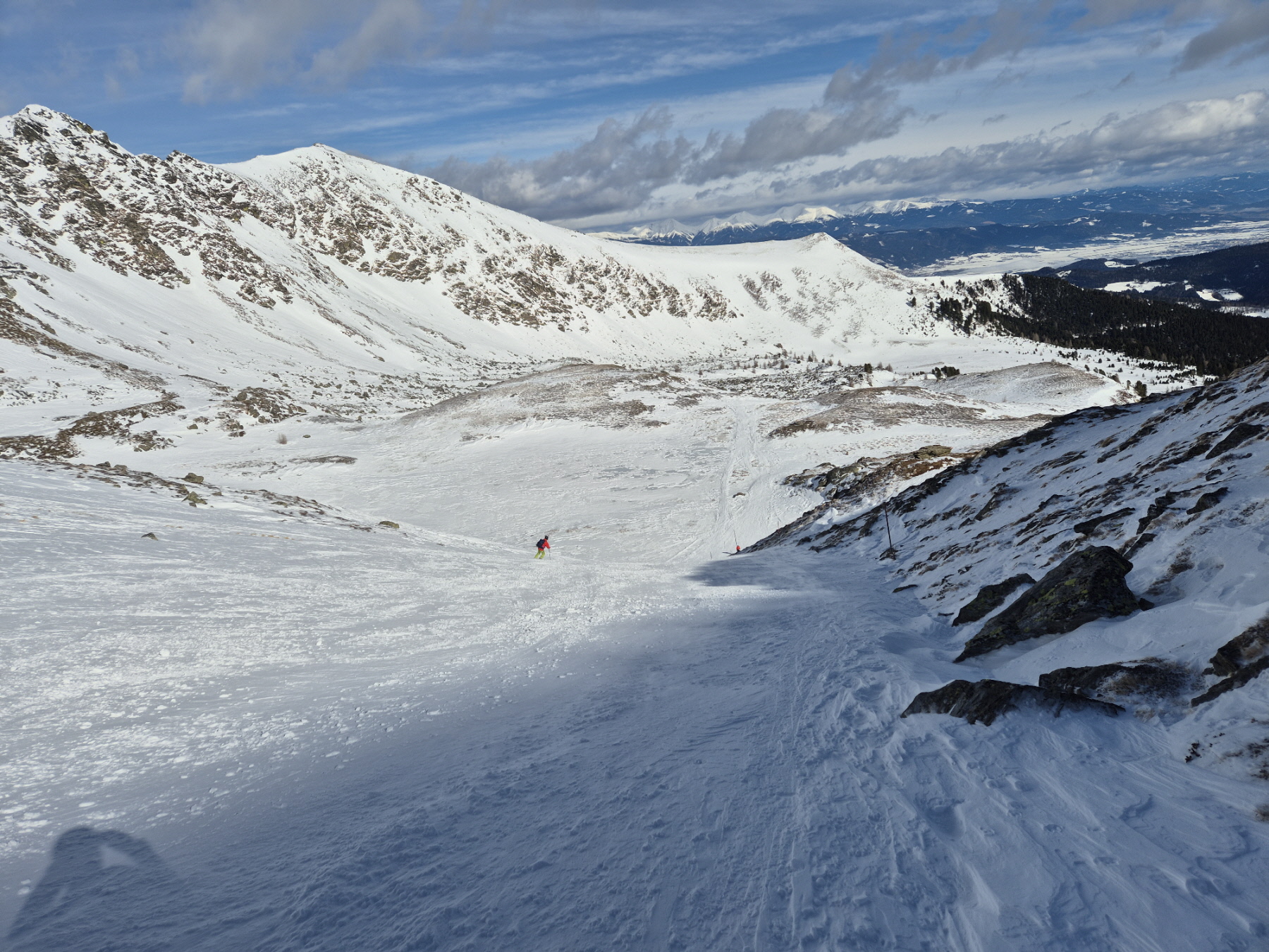 Als das Haupthaar unter dem Helm verstaut war und – fast 😉– alle Ausrüstungsgegenstände in den Abfahrtsmodus getrimmt waren, haben wir angeschnallt und sind losgefahren. Gleich der erste Hang hat uns gezeigt, dass es sich auf der kompakten Unterlage sehr gut fährt. Als ich dann auch noch an meinem Skibergschuh den Abfahrtsmodus eingeschaltet habe, hat sich der Abfahrtsgenuss auf den weiteren Stufen hinunter zum Lindersee noch einmal gesteigert.