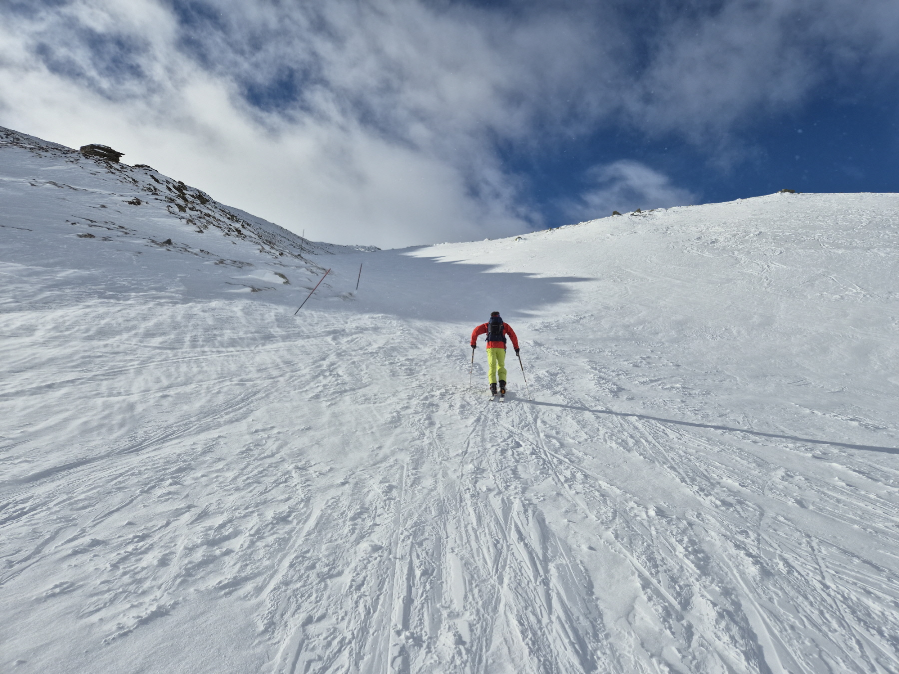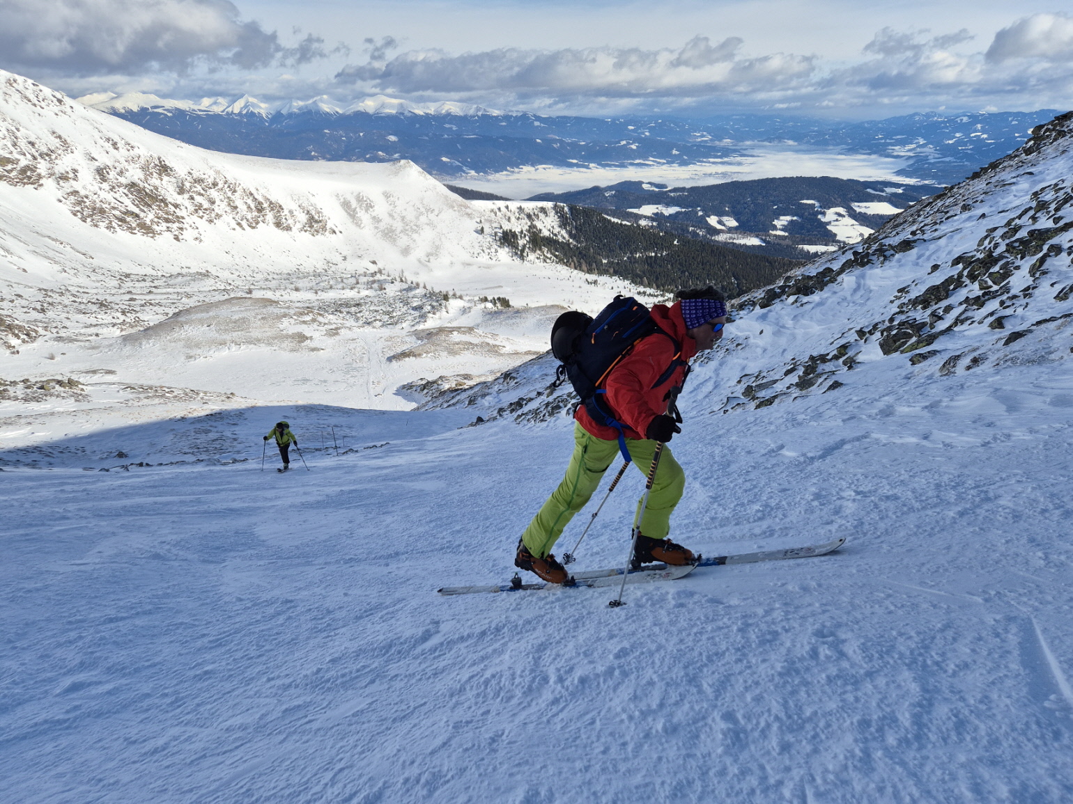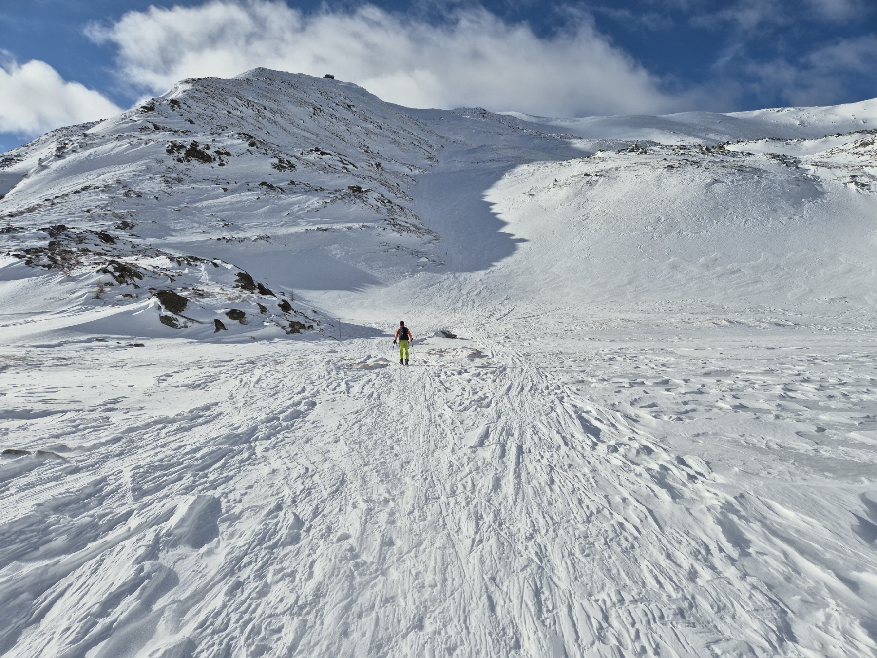 Ein frisches Lüfterl hat uns ab da am Weg hinauf zum Lindersee begleitet. Im frischen Triebschnee leicht anstollende Felle mussten auf den harschigen Flächen öfters abgestreift werden. Auf Höhe des zugefrorenen Sees haben wir uns eine Trinkpause gegönnt und bei dieser Gelegenheit auch die Oberbekleidung ergänzt. Das war eine weise Entscheidung, denn der böige Gegenwind hat im weiteren Anstieg oberhalb des Sees ordentlich zugelegt.