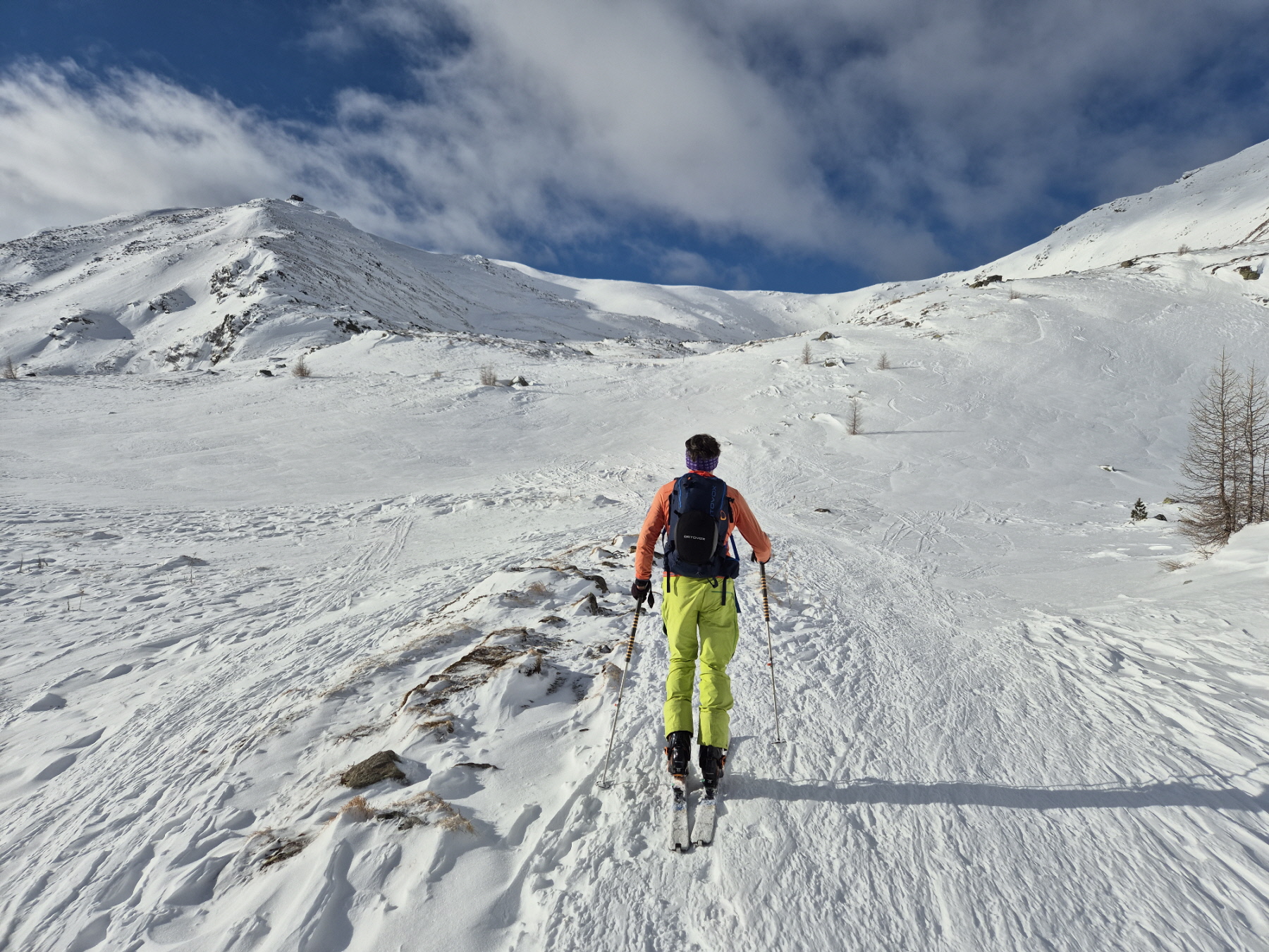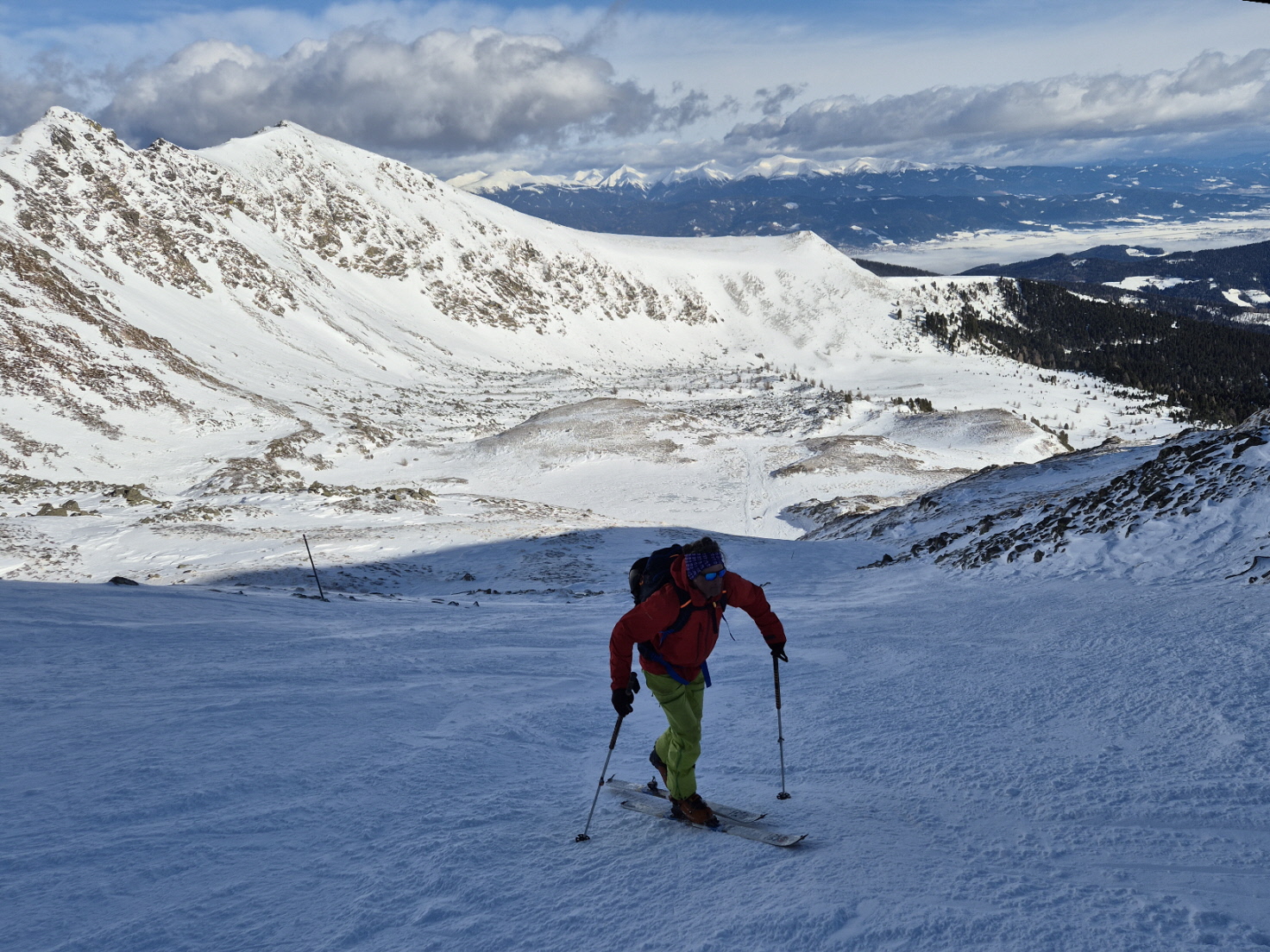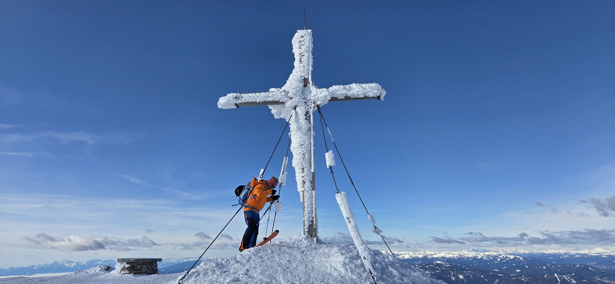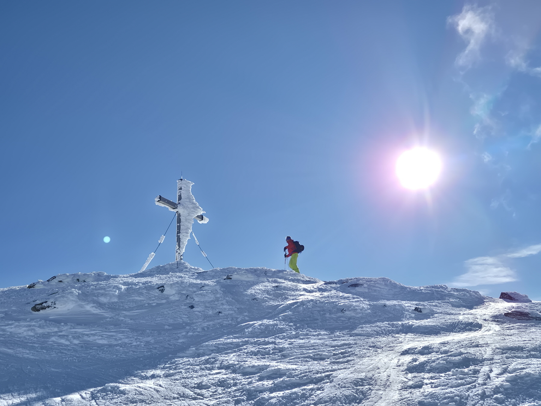 Ein frisches Lüfterl hat uns ab da am Weg hinauf zum Lindersee begleitet. Im frischen Triebschnee leicht anstollende Felle mussten auf den harschigen Flächen öfters abgestreift werden. Auf Höhe des zugefrorenen Sees haben wir uns eine Trinkpause gegönnt und bei dieser Gelegenheit auch die Oberbekleidung ergänzt. Das war eine weise Entscheidung, denn der böige Gegenwind hat im weiteren Anstieg oberhalb des Sees ordentlich zugelegt.