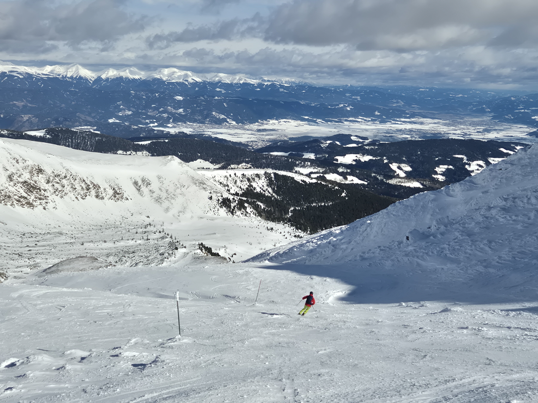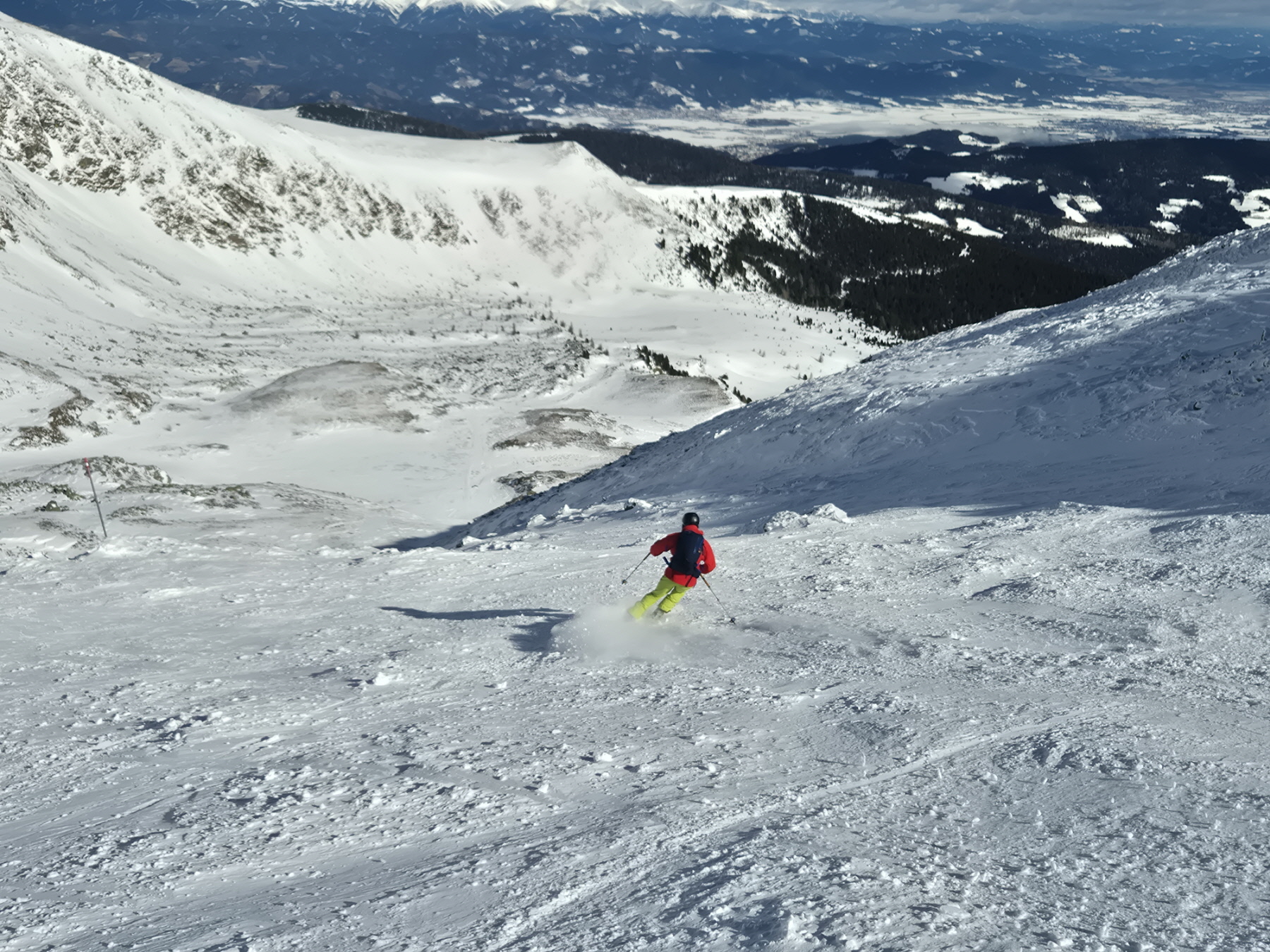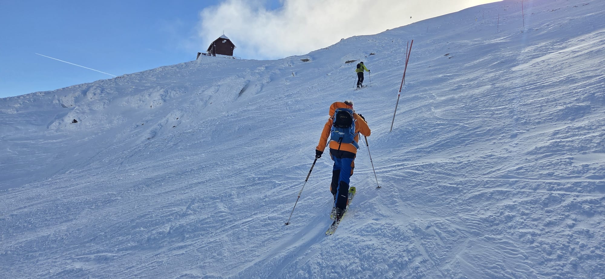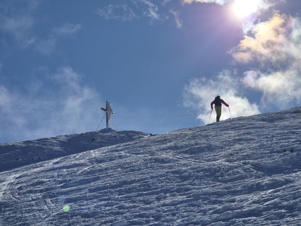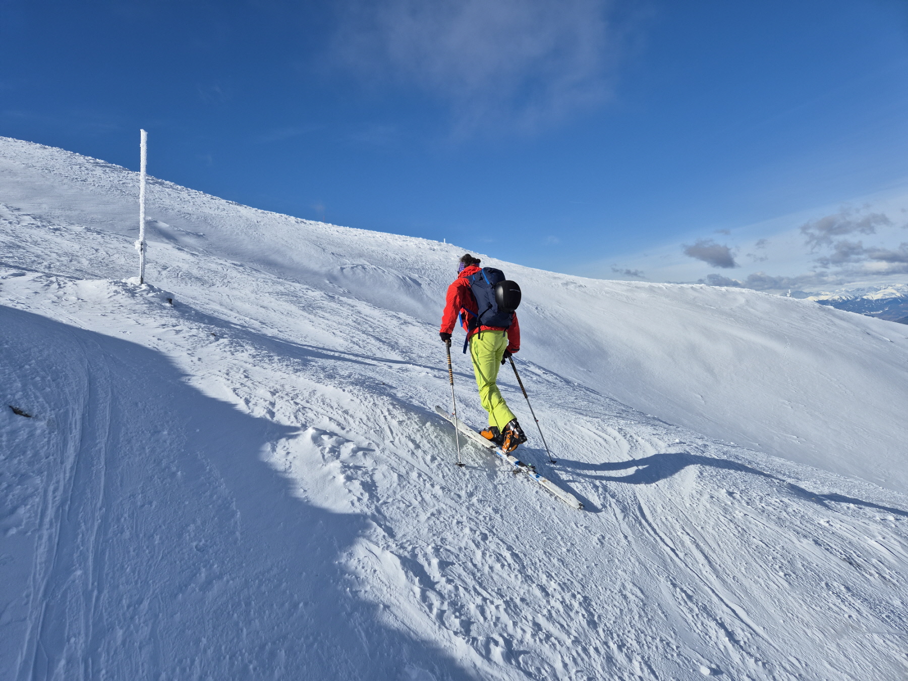 Wenn die Lawinenwarnstufe zwar nicht groß, nach den starken Schneefällen der Vorwoche über der Baumgrenze aber doch erheblich und die Situation wegen des schon den ganzen Winter über andauernden schlechten Schneedeckenaufbaus angespannt ist (auch am vergangenen Wochenende hat es wieder Lawinentote gegeben), dann bäckt man bei der Tourenplanung am besten kleine Brötchen und geht auf Nummer sicher. Der schon am Wochenende hundertfach begangene Zirbitzkogel ist da eine Bank. Nicht nur, dass man bei den Rieserliften auf einer präparierten Piste weggeht, durch die vielfache Begehung und Befahrung gibt es bis ganz hinauf quasi „Pistenverhältnisse“.