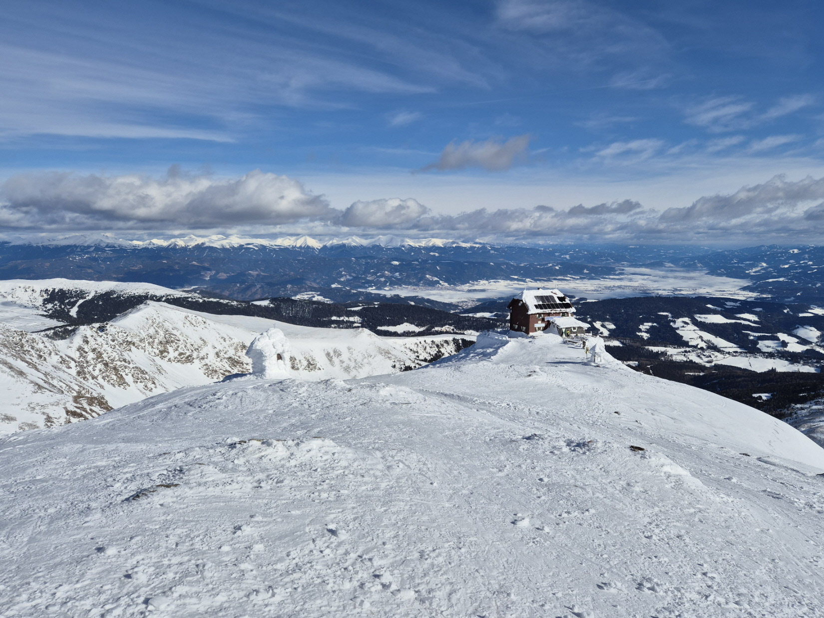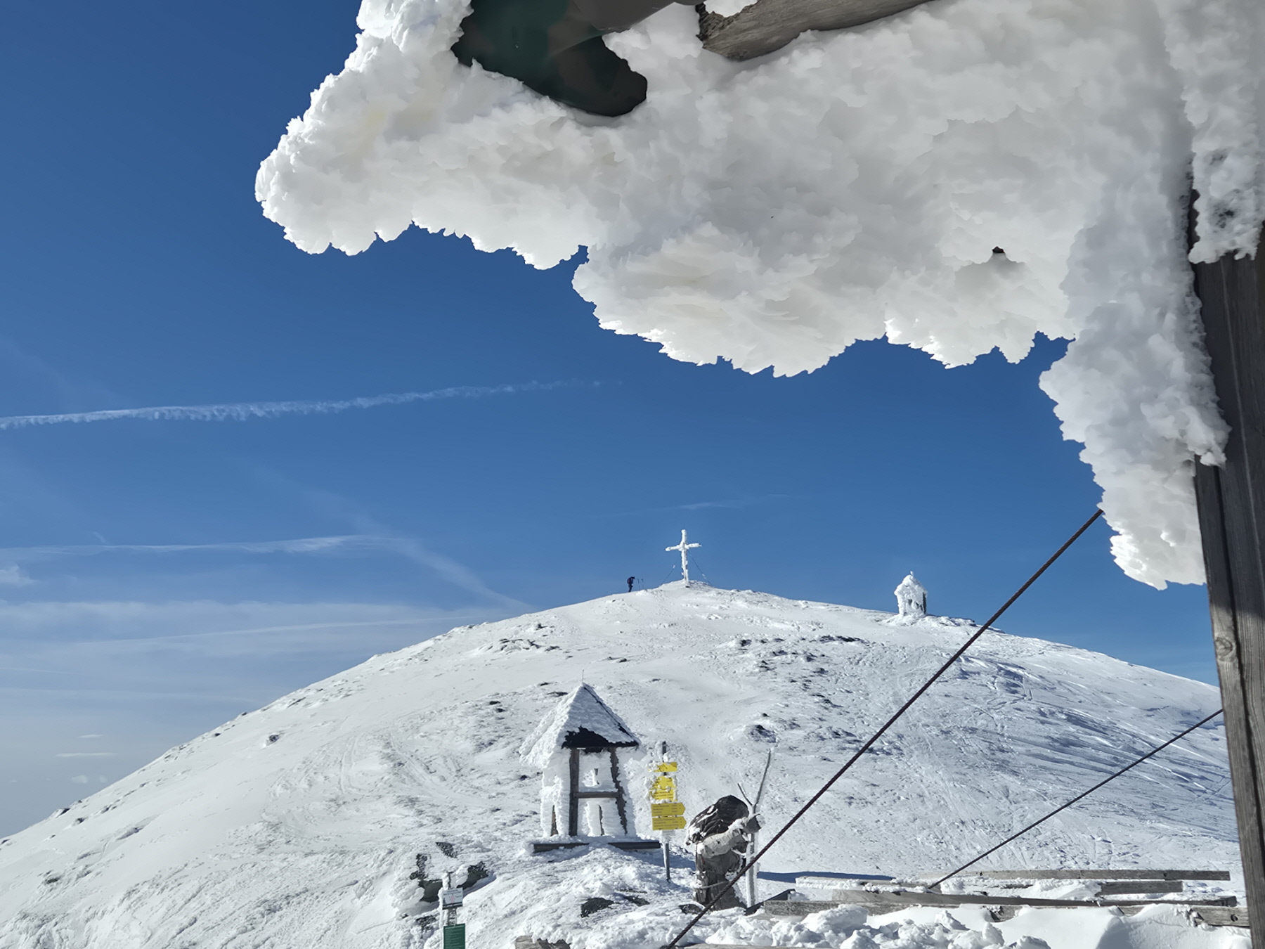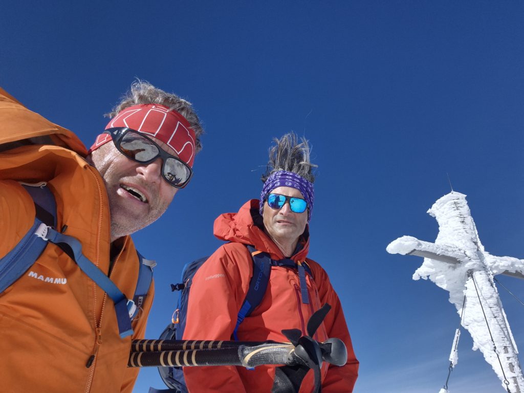 Flott haben wir hier jetzt Höhe gewonnen und nach einer Anstiegszeit von 2 Std 22 min haben wir den Gipfel des Zirbitzkogels erreicht. Es war zwar sonnig, aber der Wind so unwirtlich, dass wir den Aufenthalt sehr kurz gehalten haben. Ob bei einem noch etwas verlängertem Aufenthalt die nächste Bö dem Andreas eine noch stylischere Frisur 😊 verpasst hätte, wage ich zu bezweifeln.