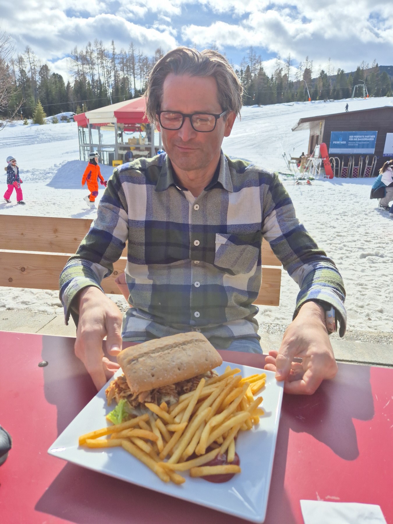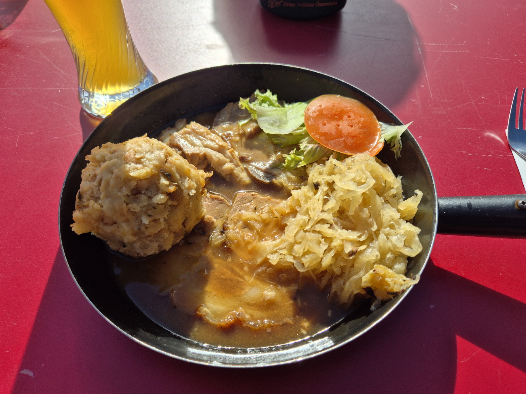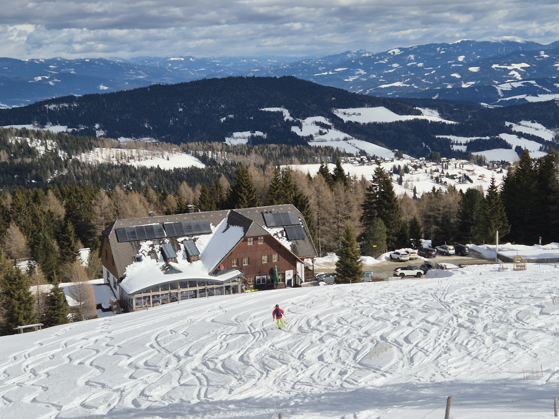 Nach dem Überqueren der Zufahrtsstraße – jetzt mit abgeschnallten Skiern – sind wir noch flott bis zur Piste und auf dieser zum Ausgangspunkt der Tour abgefahren. Dort haben wir bereits knapp nach 11.00 Uhr schon wieder abgeschnallt. Nach dem Umziehen und Verstauen der Ausrüstung haben wir – jetzt aber motorisiert – noch ein paar Höhenmeter gemacht. Bei der Rieseralm sind wir eingekehrt. Auf der sonnigen Terrasse, darüber wird sich der Heinrich freuen, haben wir es uns bei einem Pulled Pork Burger (Andreas) bzw. bei einem Schweinsbraten mit Sauerkraut und Knödel gut gehen lassen.